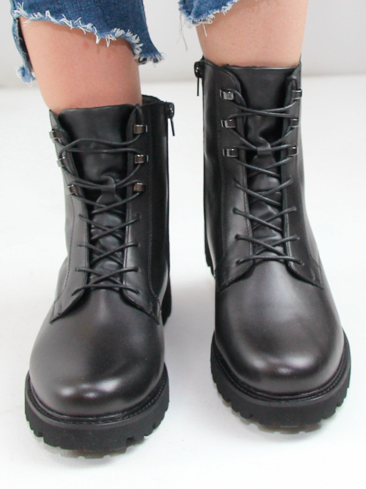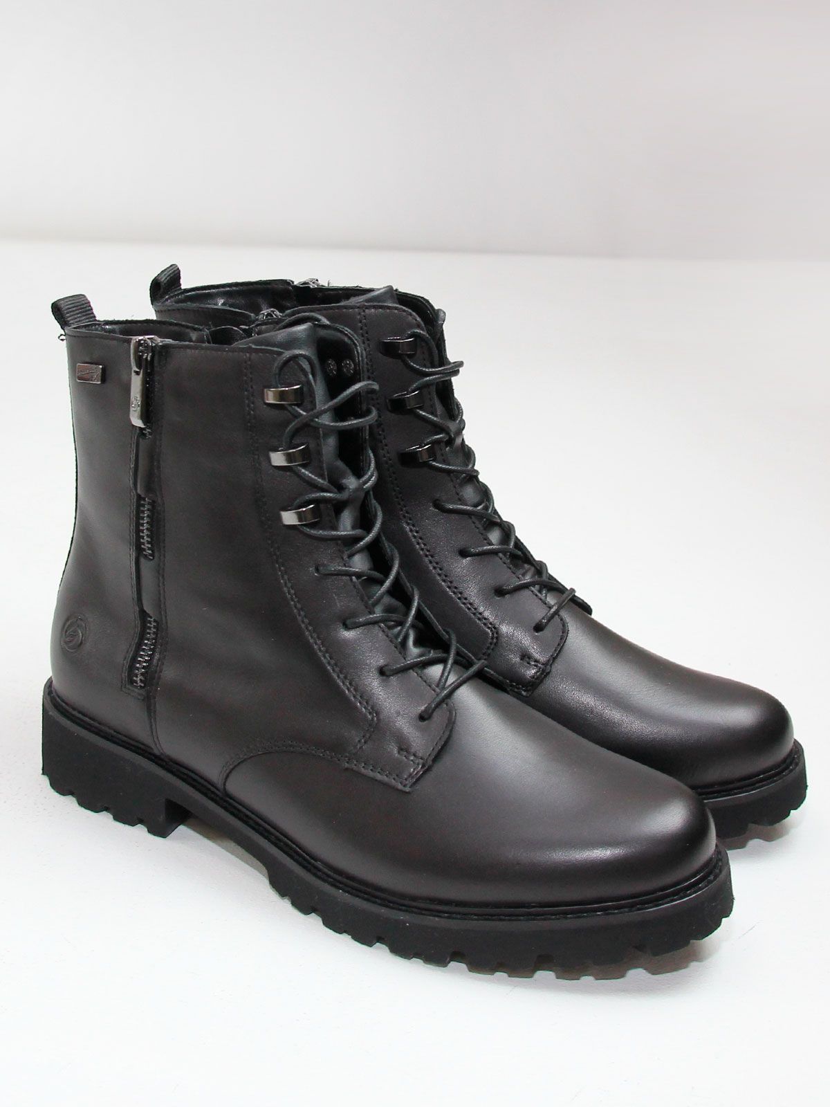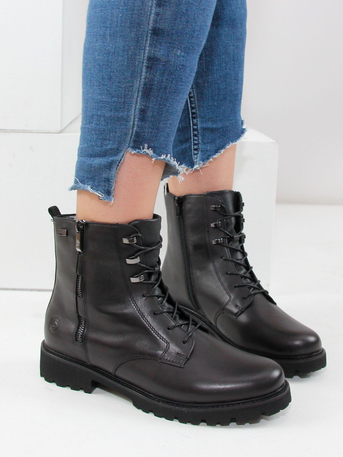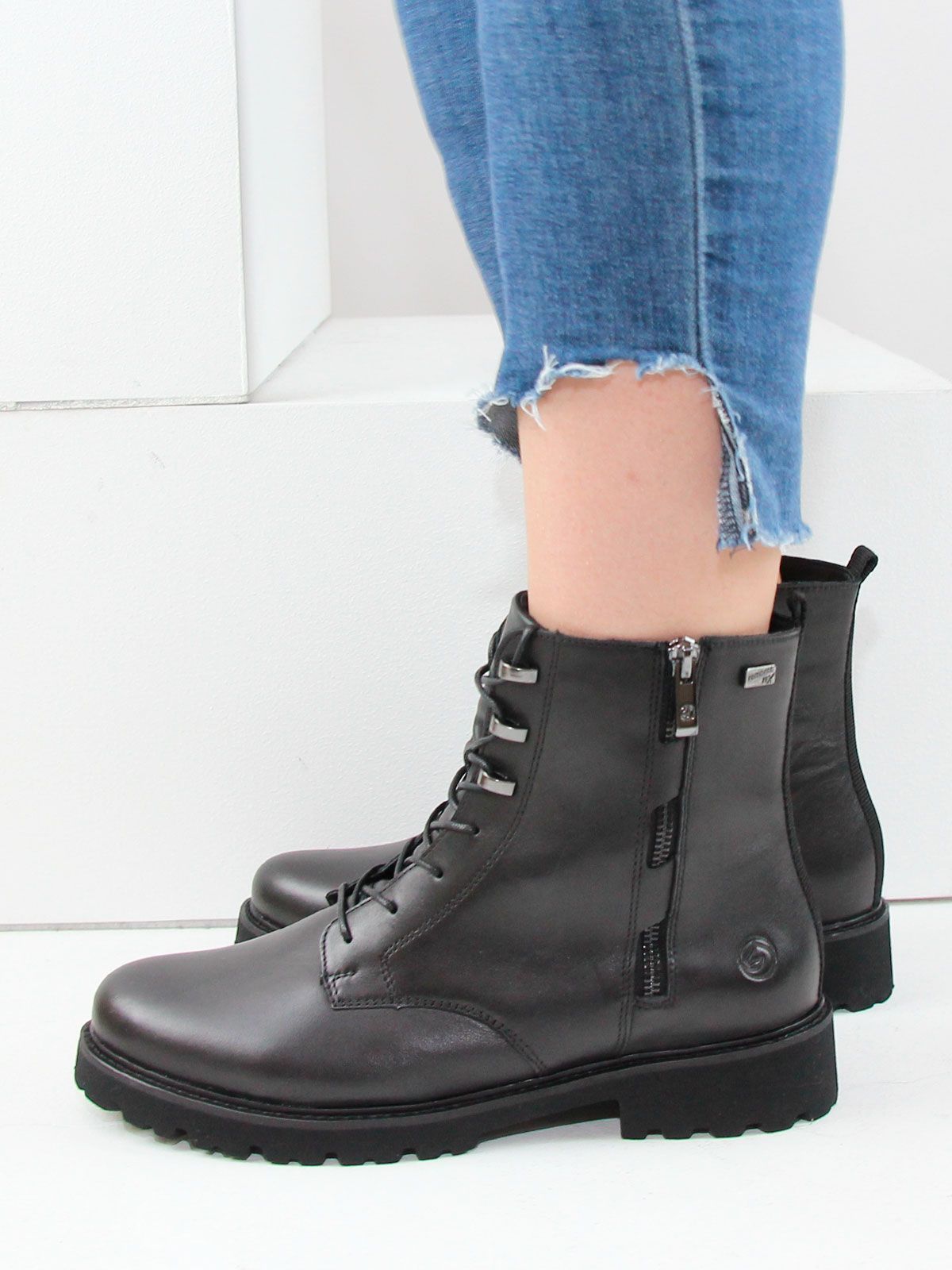 Черные женские ботинки remonte на шнуровке из гладкой кожи не только ультра-стильны, но и отличаются комфортом. Шнуровка дополнена застежкой-молнией, что гарантирует оптимальную фиксацию и идеальную посадку. Амортизирующая и сверхлегкая подошва в сочетании с мягкой и съемной стелькой создают ощущение комфорта при каждом шаге. Шнуровкой можно отрегулировать полноту по размеру для комфорта.