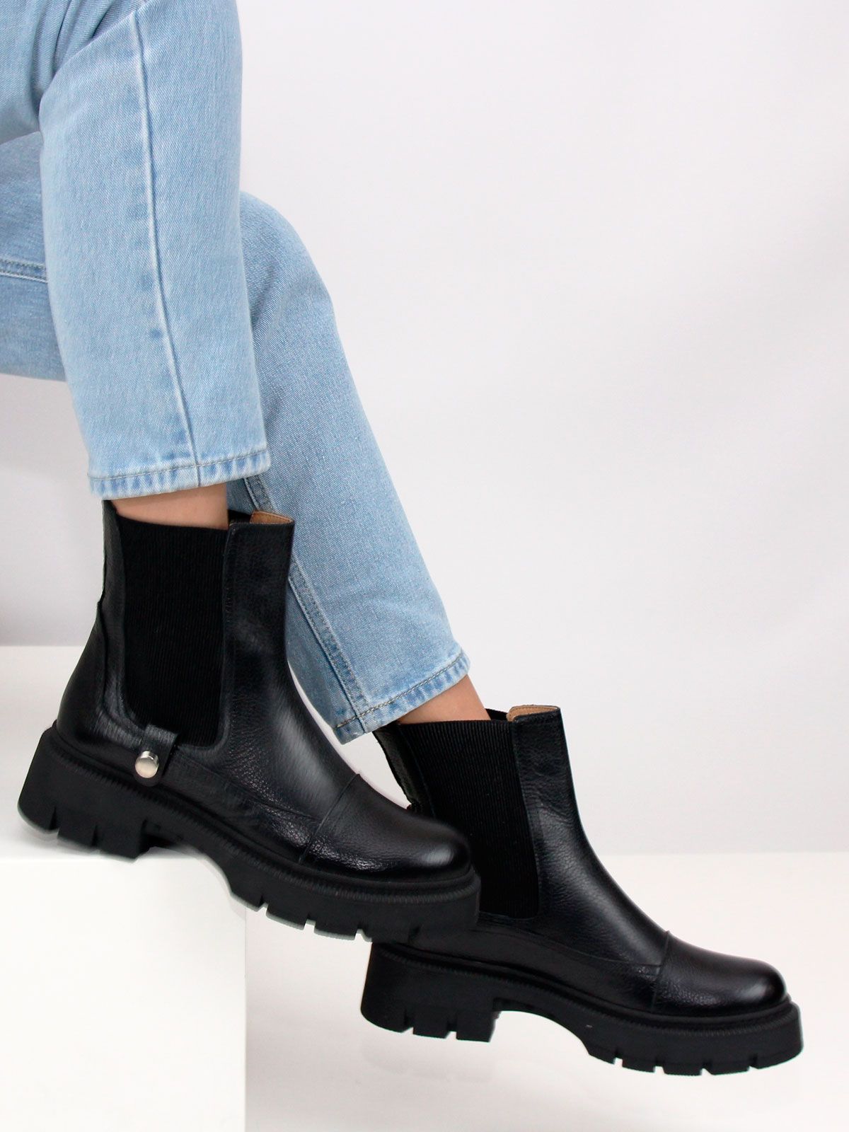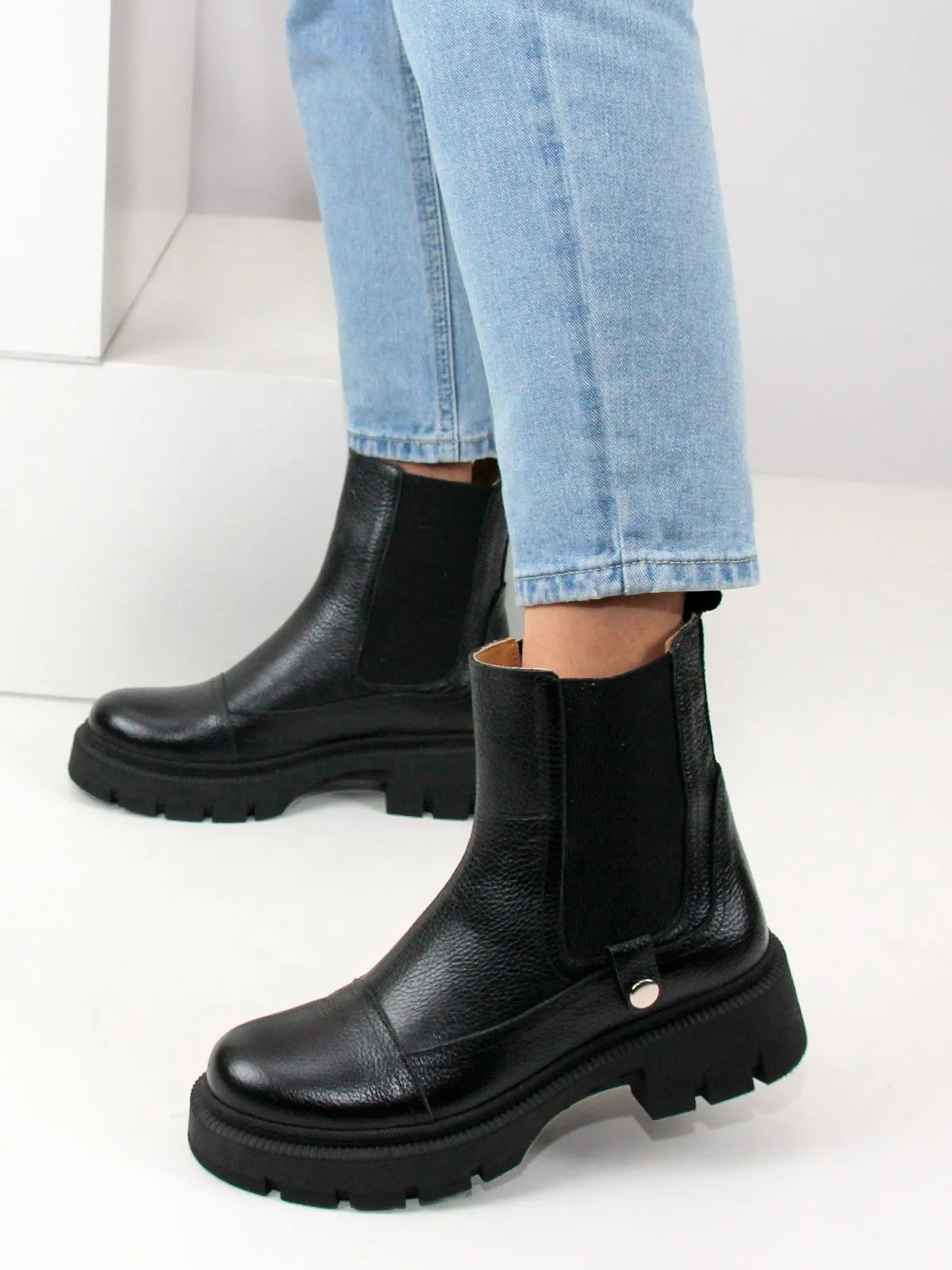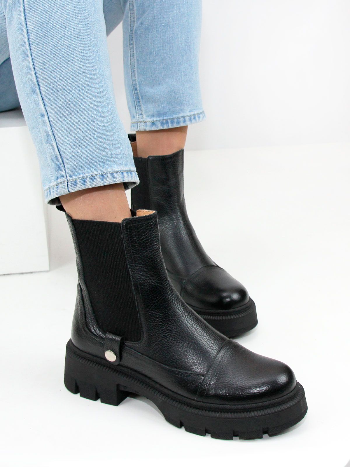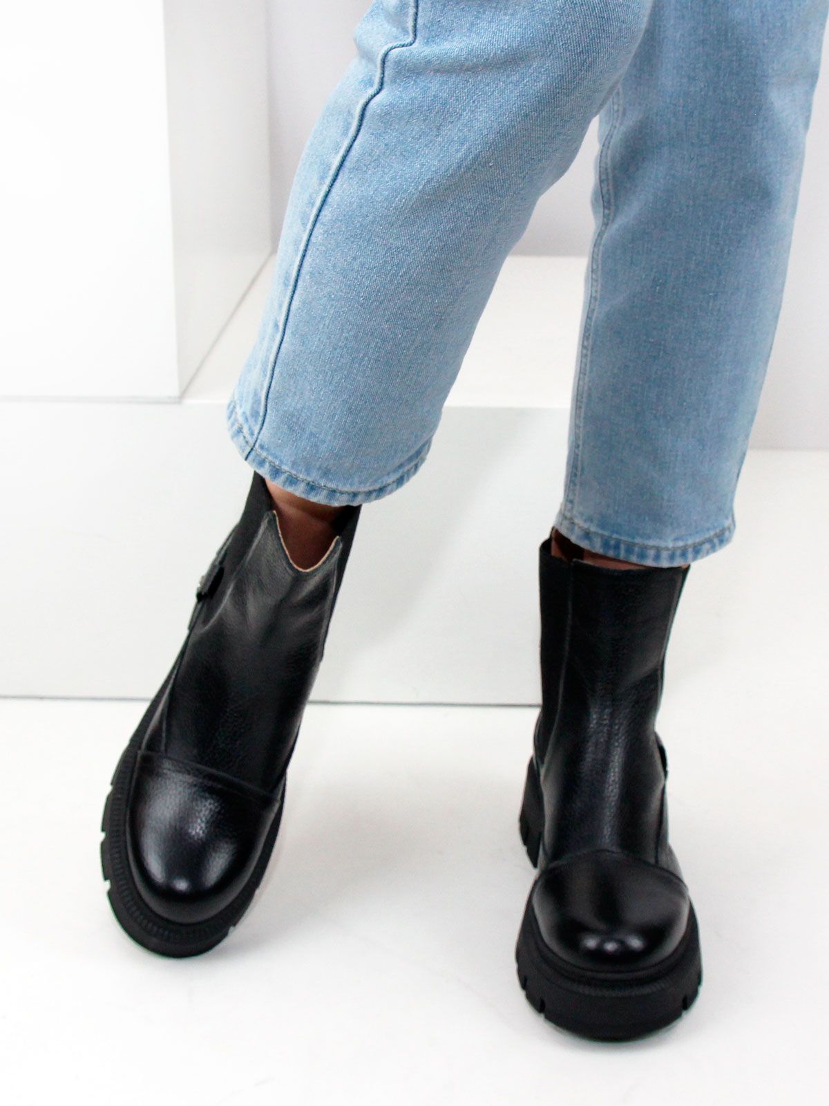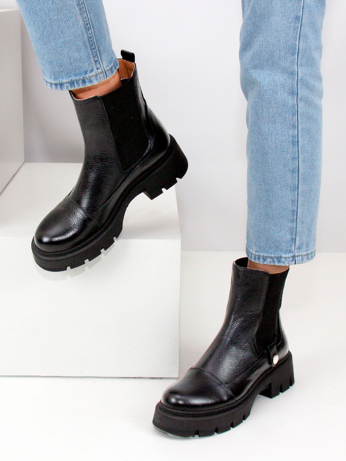 Идеальные универсальные женские ботинки челси больших размеров из натуральной фактурной кожи классического черного цвета на платформе. Демисезонные ботинки утеплены байкой и выполнены на нескользкой тракторной подошве с протектором в цвет кожи. Модель большемерит, пожалуйста, ориентируйтесь на длину стельки в описании.