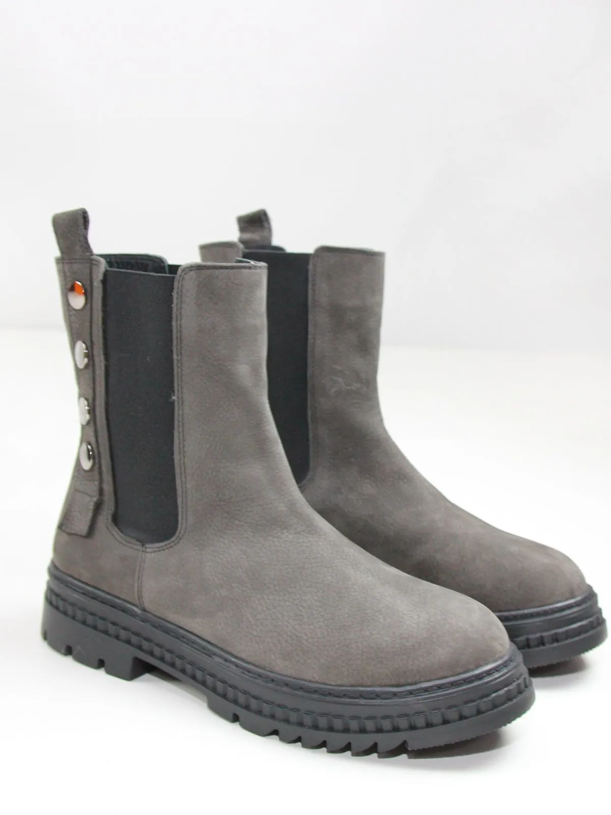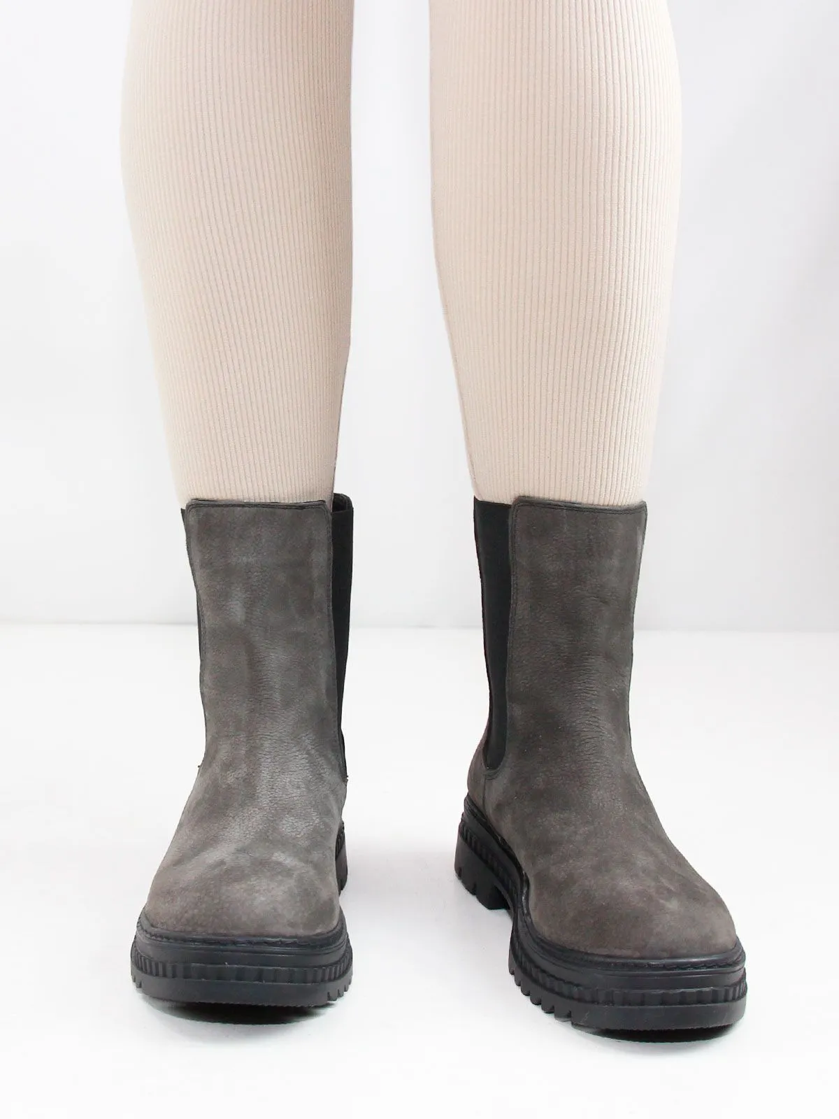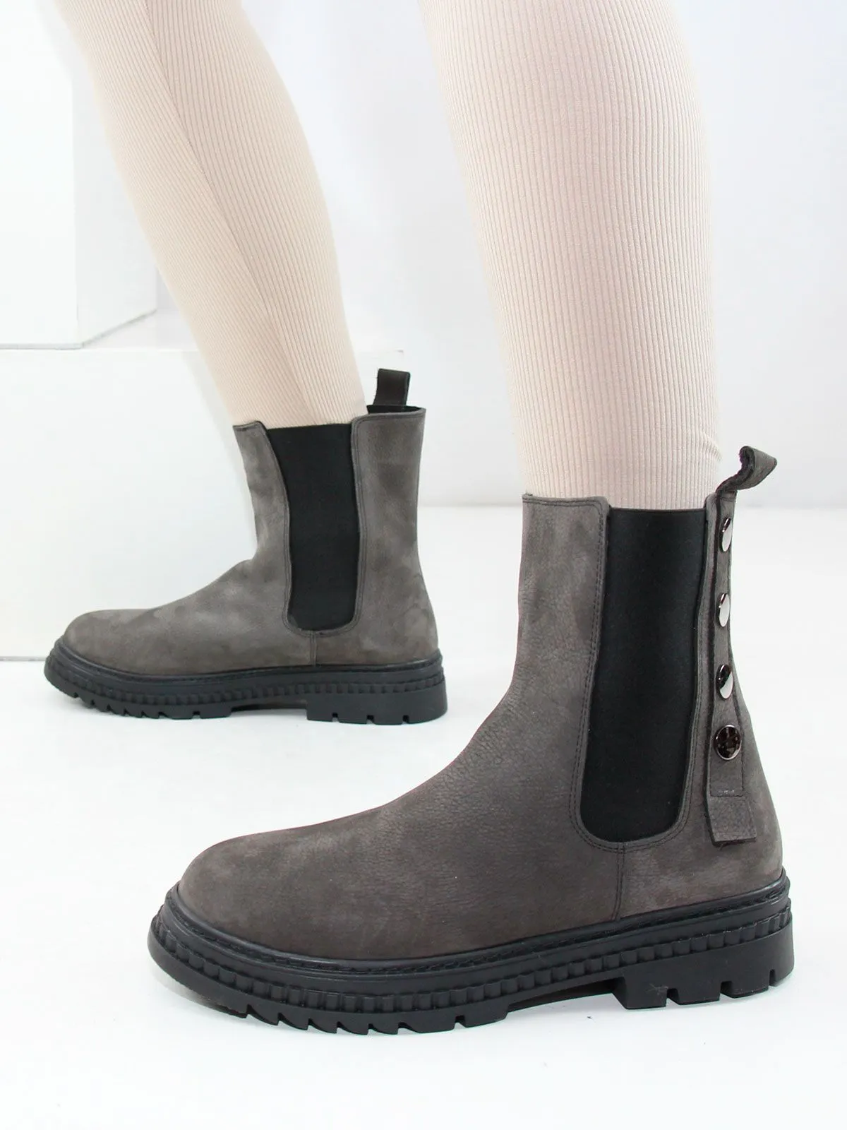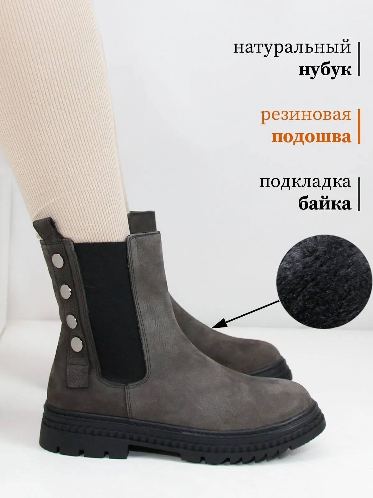 Женские челси большого размера из натурального нубука серого цвета. Нескользкая реиновая подошва, подкладка - байка. Ботинки подойдут на стандартную и широкую стопу.