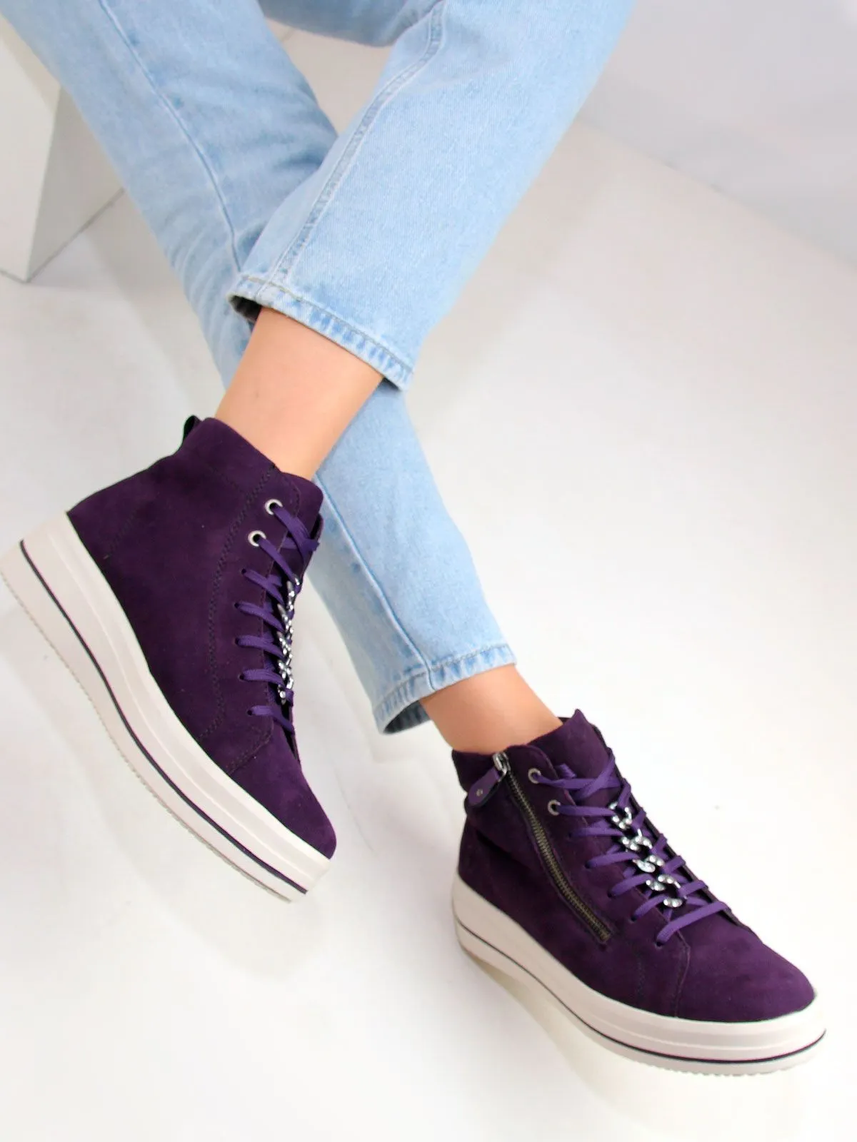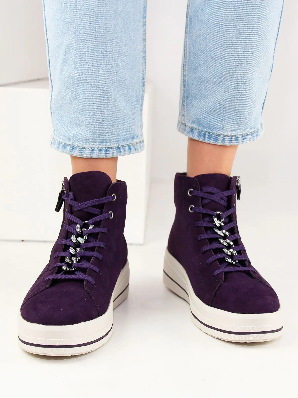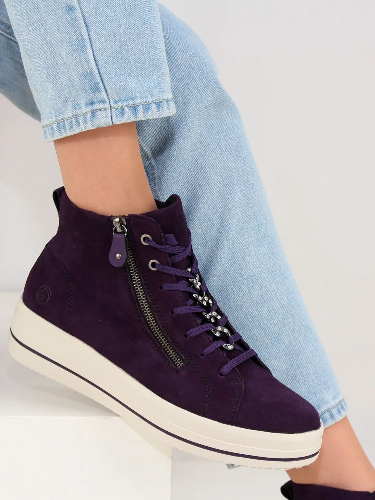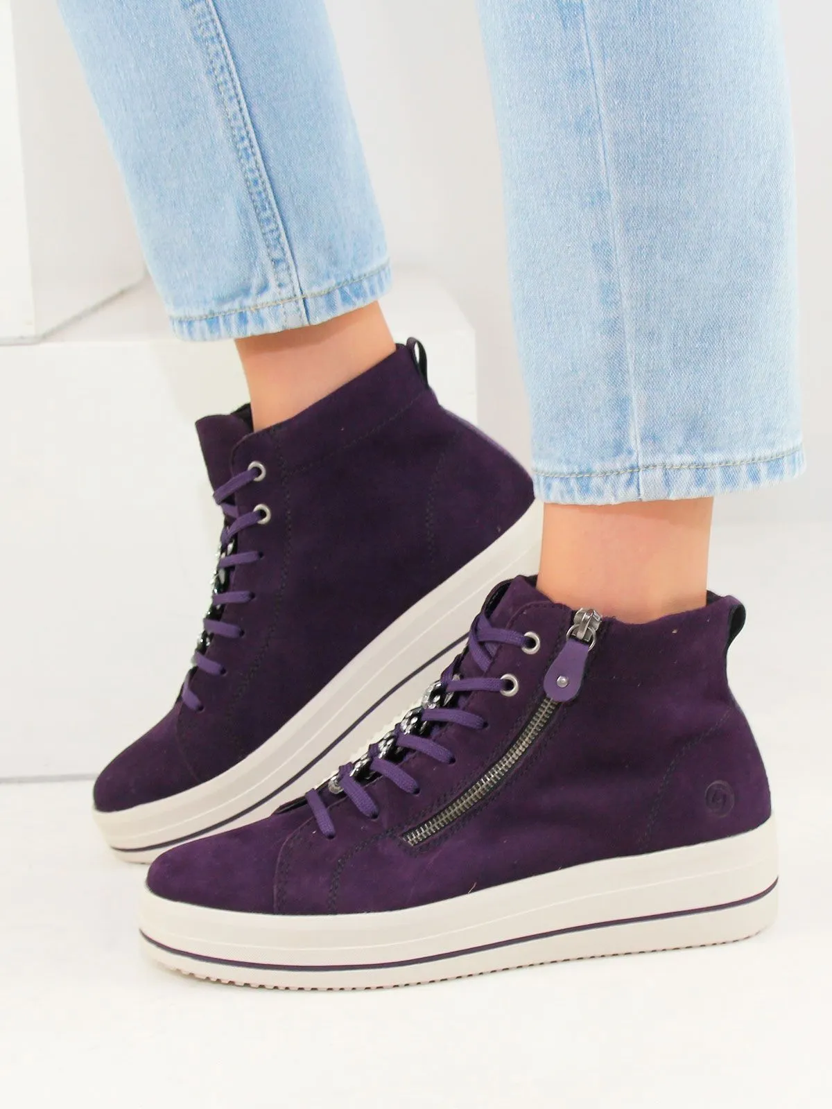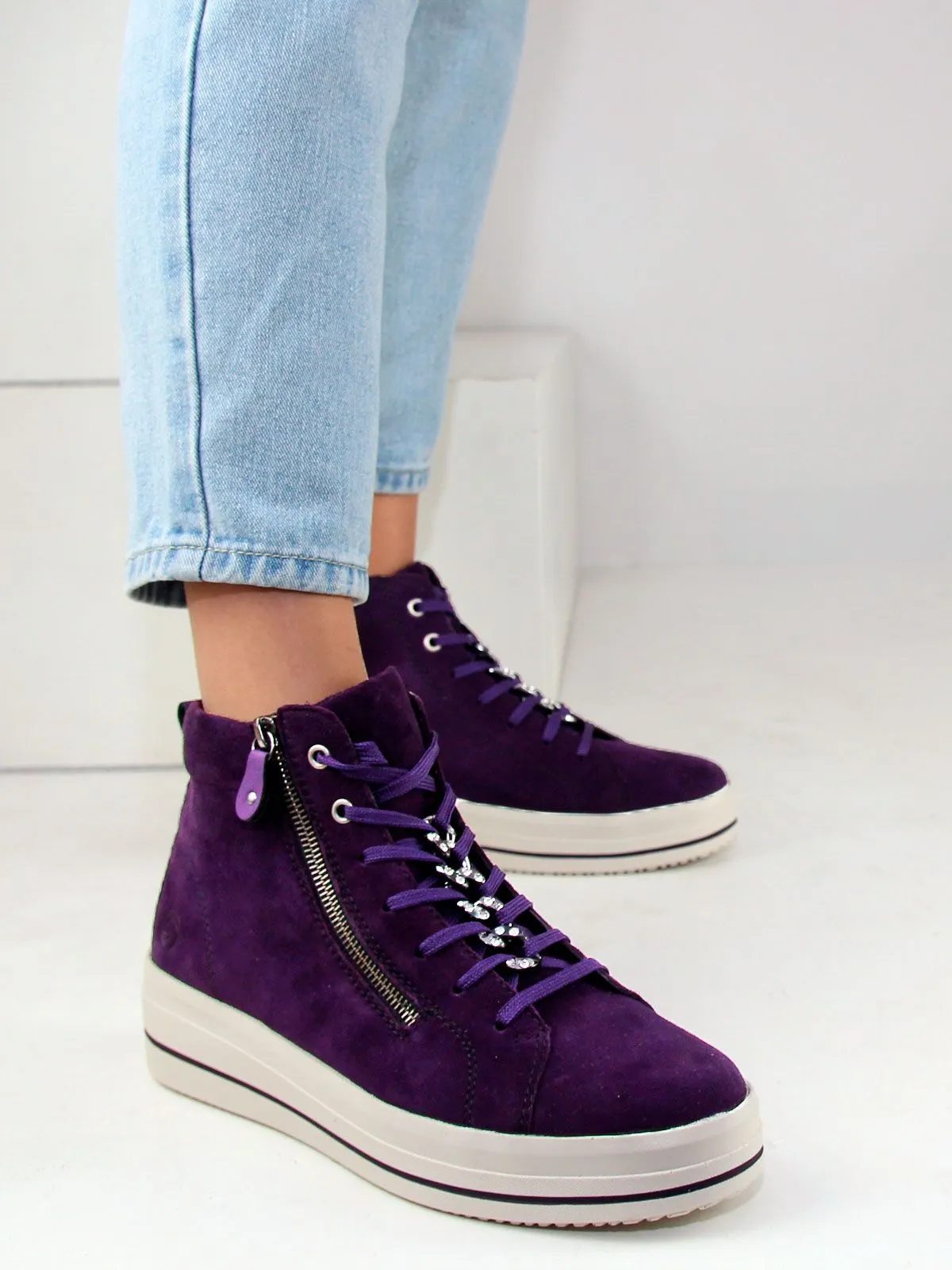Высокие женские кеды большого размера на платформе бренда Remonte — сочетание максимального удобства, износостойких материалов и презентабельного вида. Демисезонные кеды на байке на белой подошве фиолетового цвета разработаны с учетом последних модных трендов (фиолетовый цвет актуален в этом сезоне). Модель адаптирована к интенсивной носке каждый день. Обувь Remonte отлично сидит, благодаря продуманной конструкции, и снижает тем самым нагрузку на ноги, что особенно заметно, если вы весь день активно двигаетесь. Съемная мягкая стелька. Шнуровка + молния.