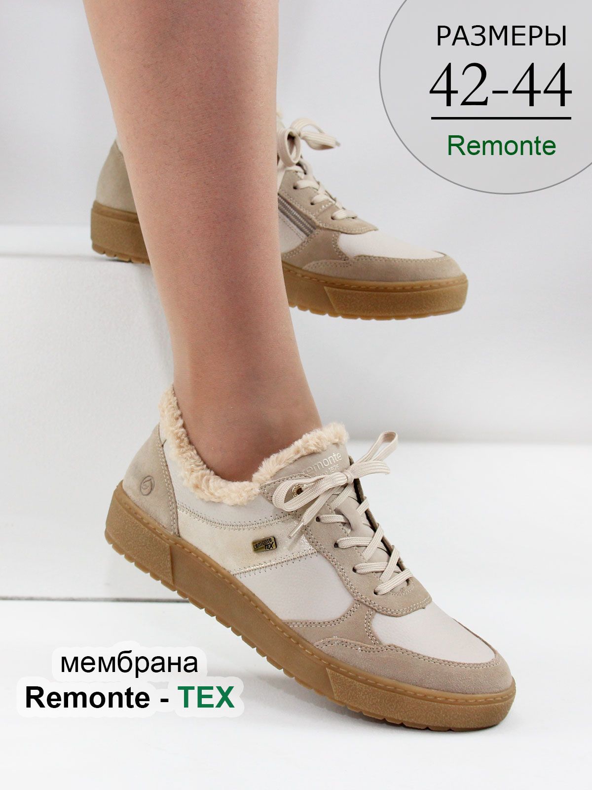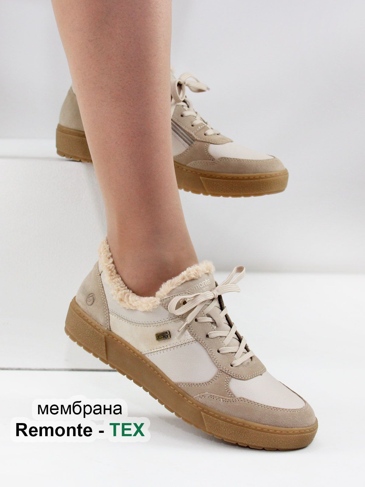 Мембрана Remonte-Tex представляет собой ультратонкий слой, расположенный между внешней и внутренней подкладкой обуви. Она обеспечивает обуви влагостойкость, защиту от ветра и воздухопроницаемость, поддерживая комфортный микроклимат для стоп в сырую и холодную погоду. Не является полностью водонепроницаемой, как, например, резиновые сапоги. Влага может проникнуть через молнии, пряжки и текстильные элементы.