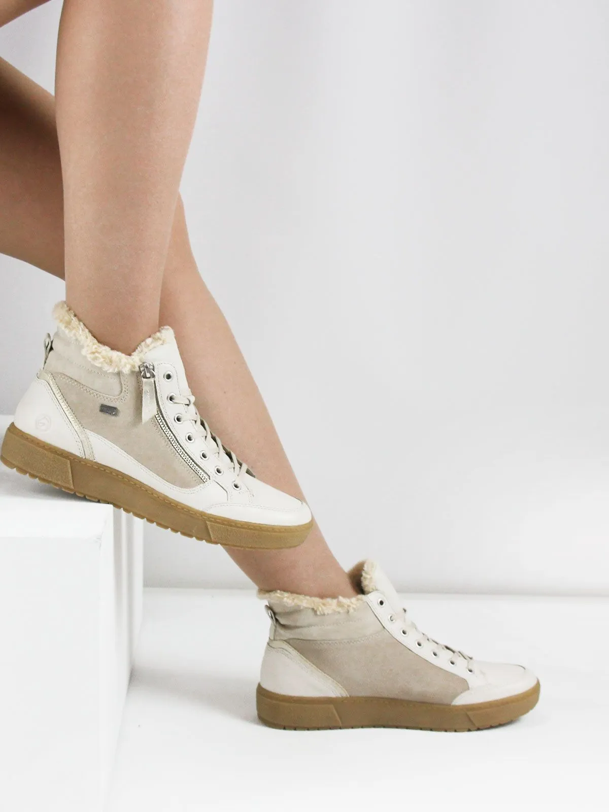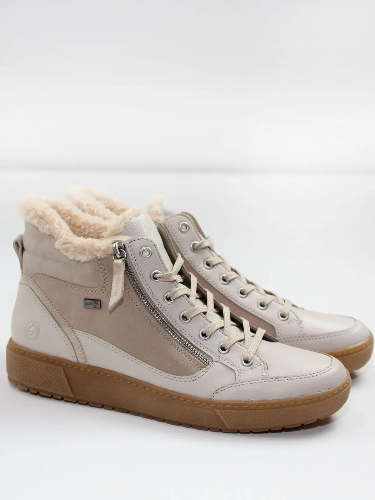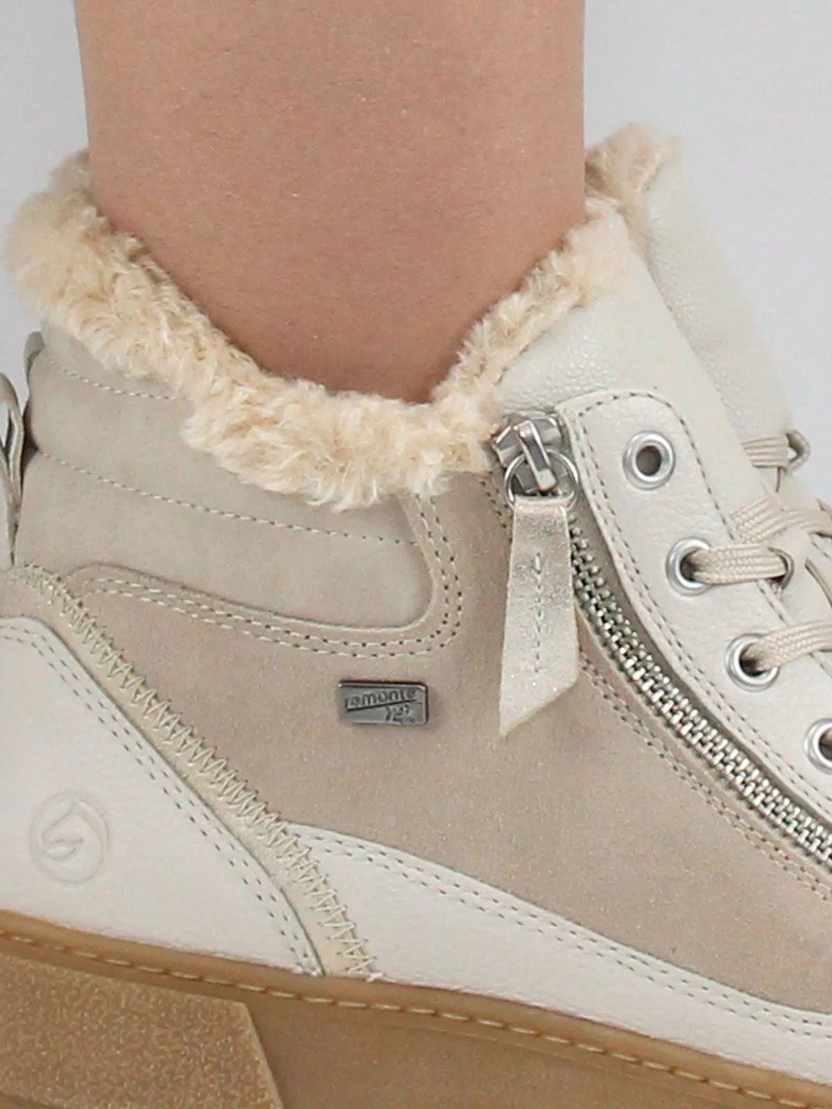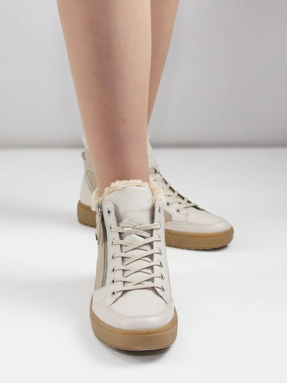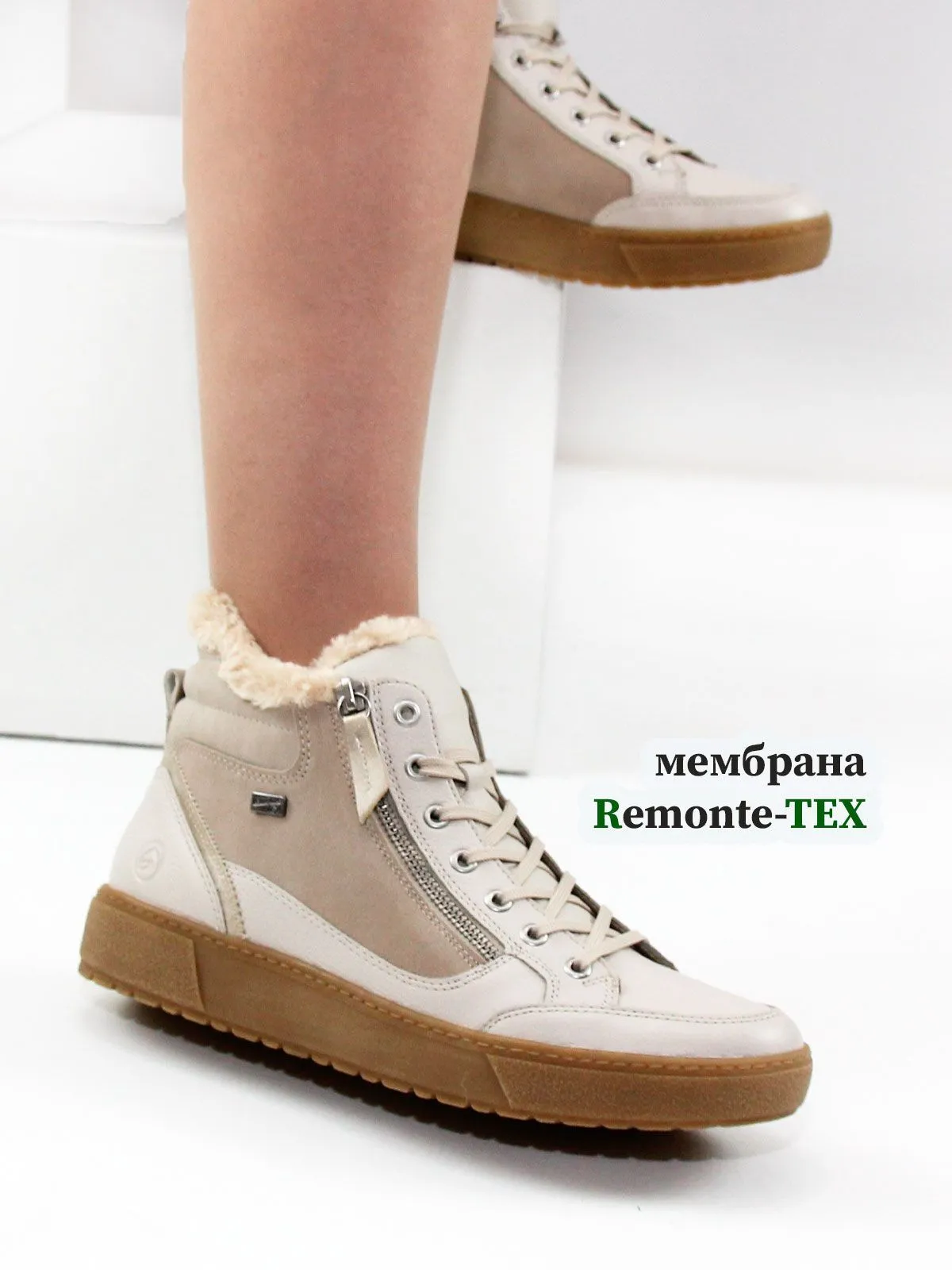 Бежевые женские зимние кеды Remonte на молнии и шнуровке из натуральной кожи не только ультра-стильны, но и отличаются комфортом. Амортизирующая и сверхлегкая подошва в сочетании с мягкой и съемной стелькой создают ощущение комфорта при каждом шаге. Мембрана Remonte-Tex представляет собой ультратонкий слой, расположенный между внешней и внутренней подкладкой обуви.