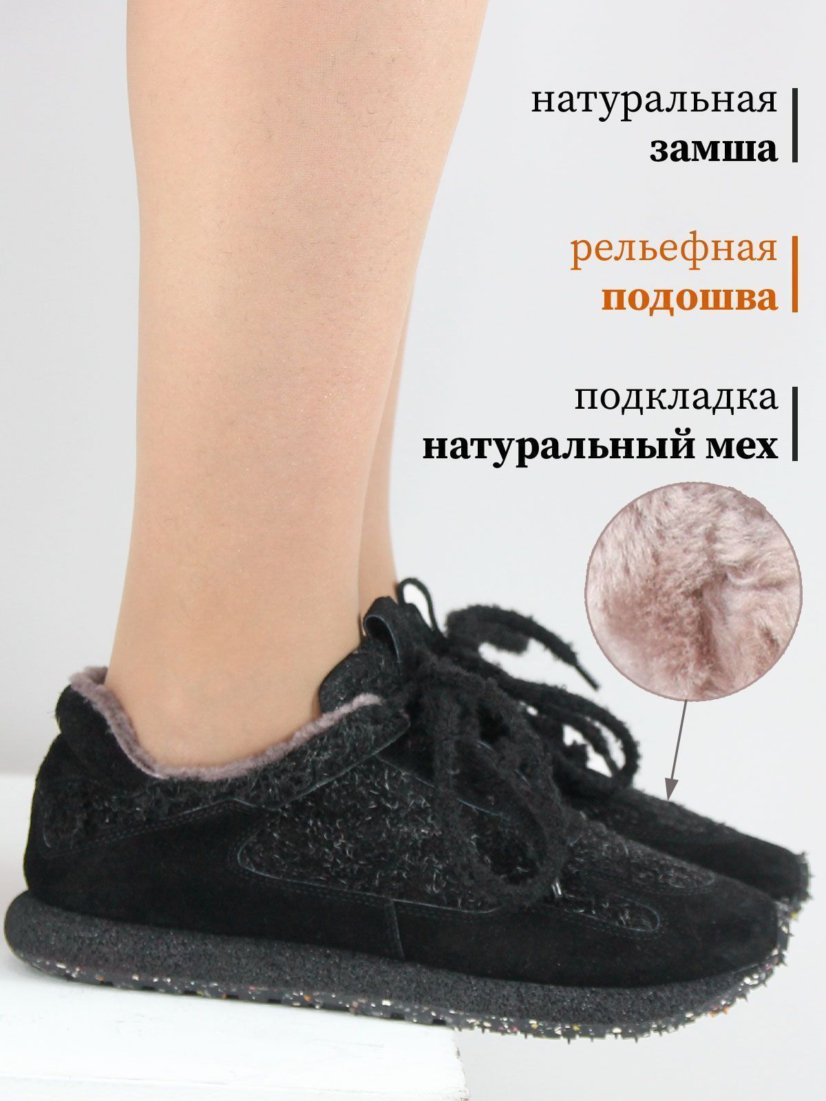 Внутри — натуральный мех, обеспечивающий тепло и комфорт в холодное время года.
