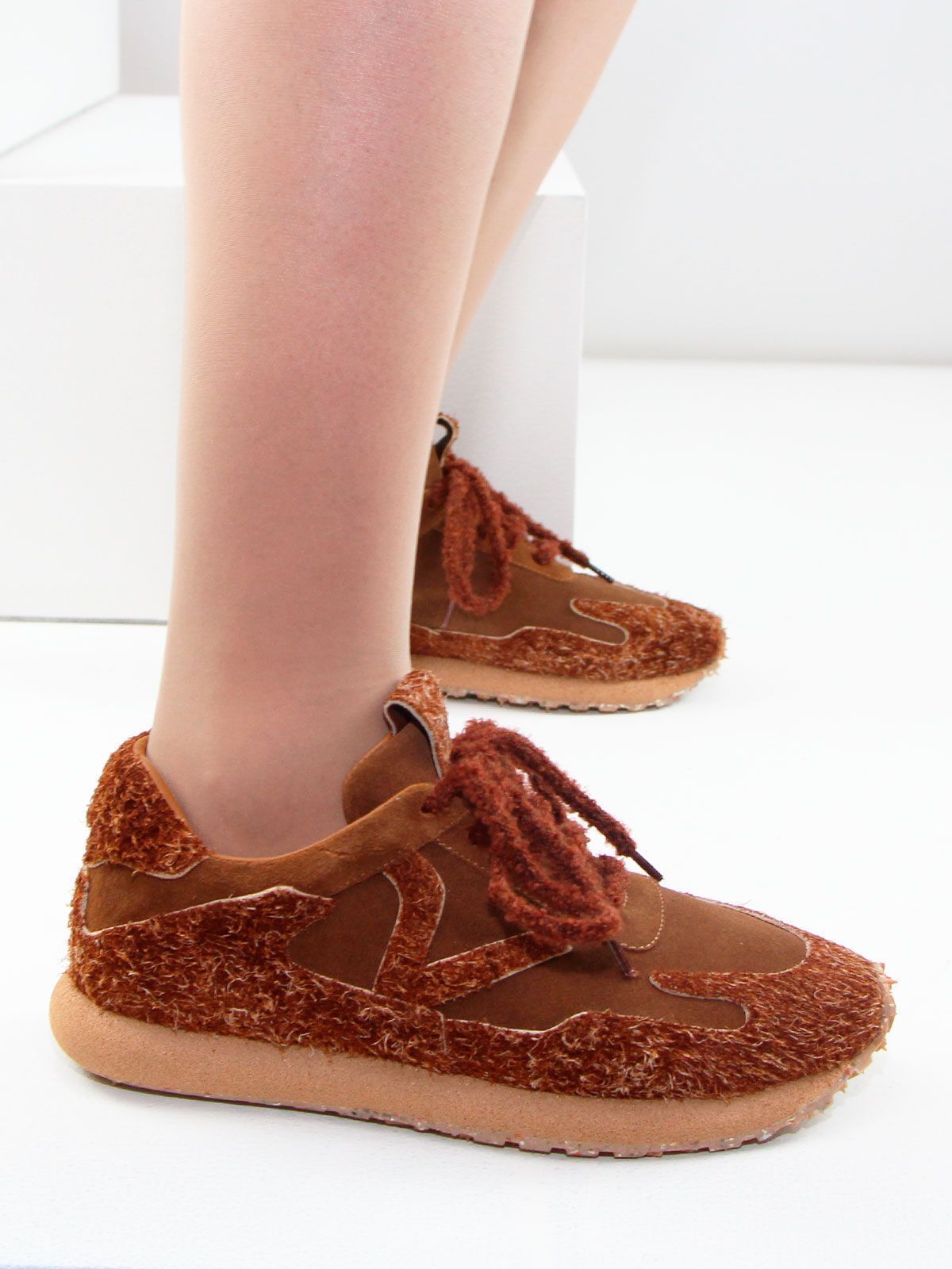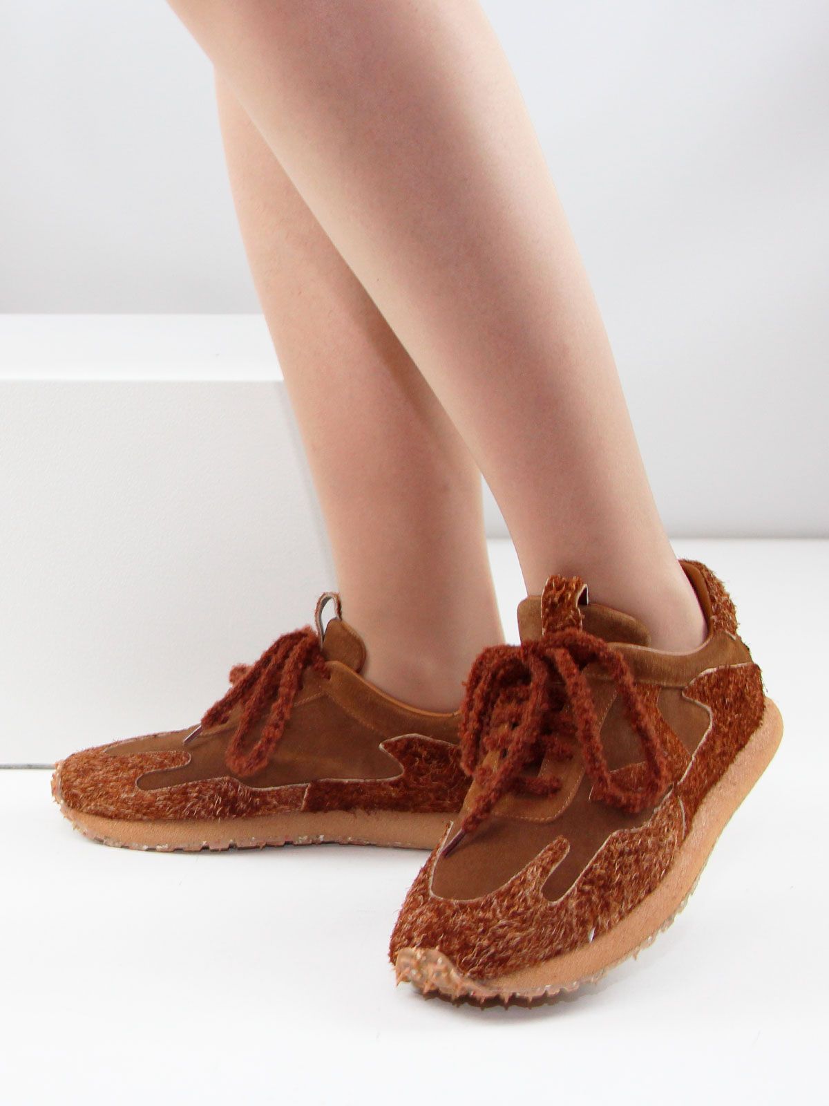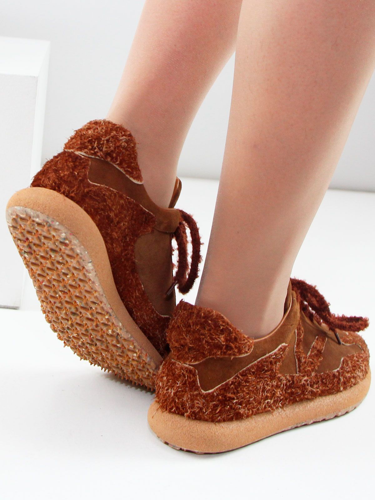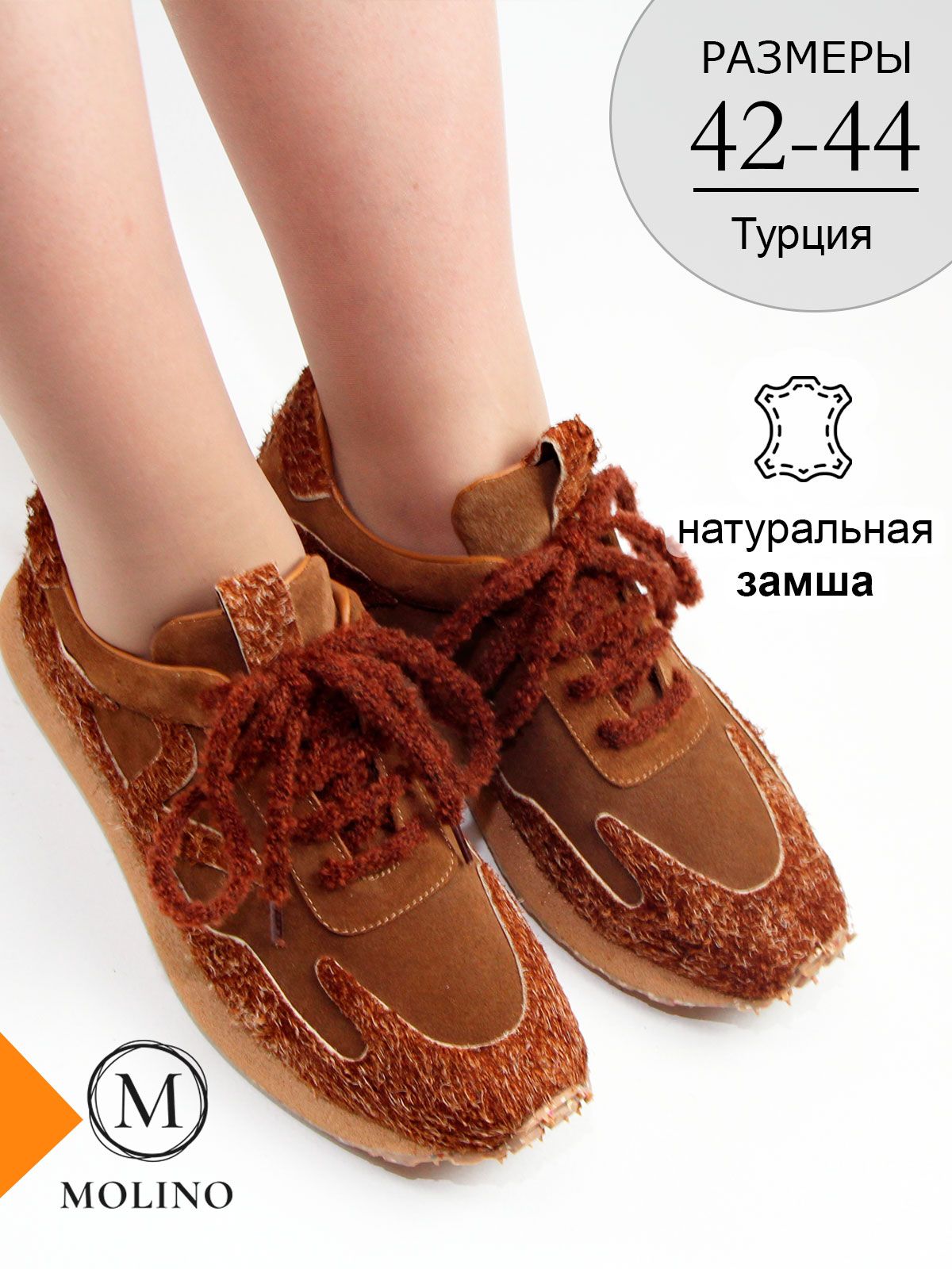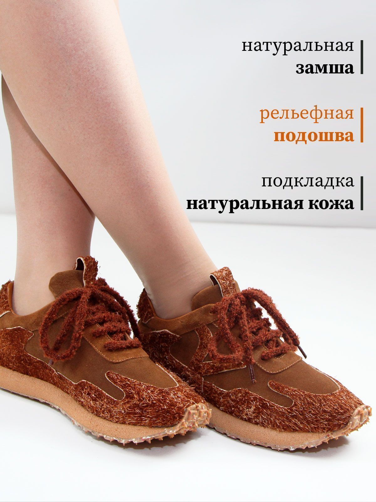 Женские коричневые демисезонные кроссовки больших размеров из натуральной замши с интересным, нестандартным дизайном. Модель выглядит оригинально за счёт формы и аккуратных деталей, при этом остаётся удобной и универсальной для повседневной носки.