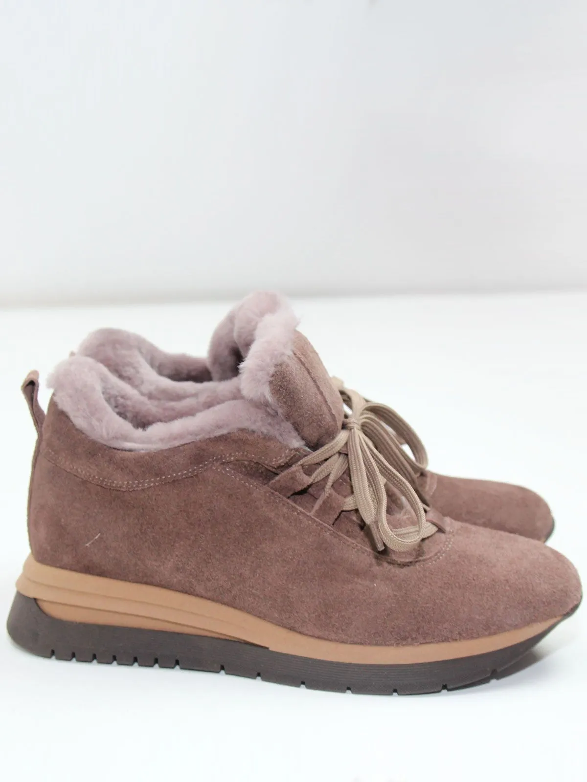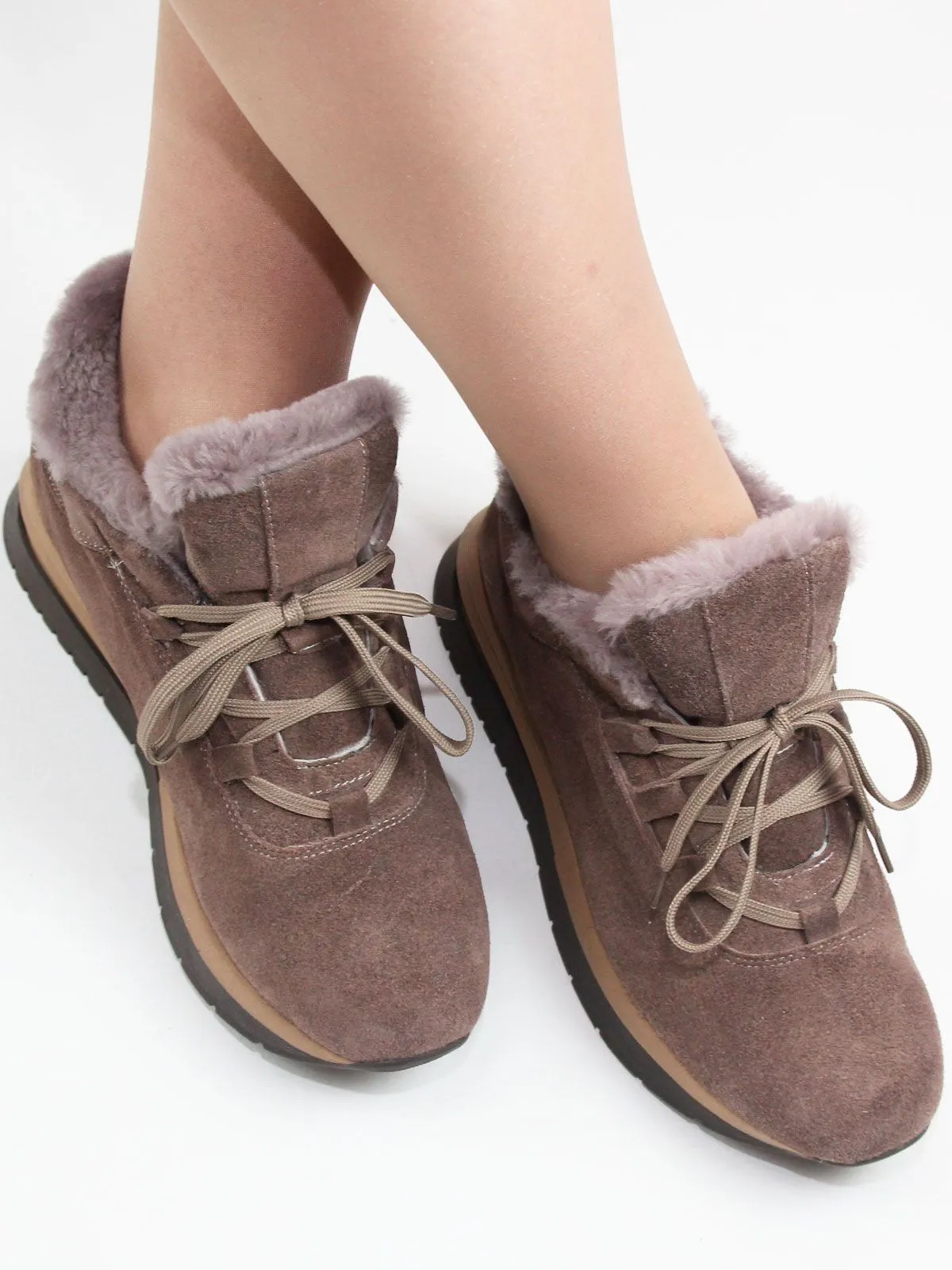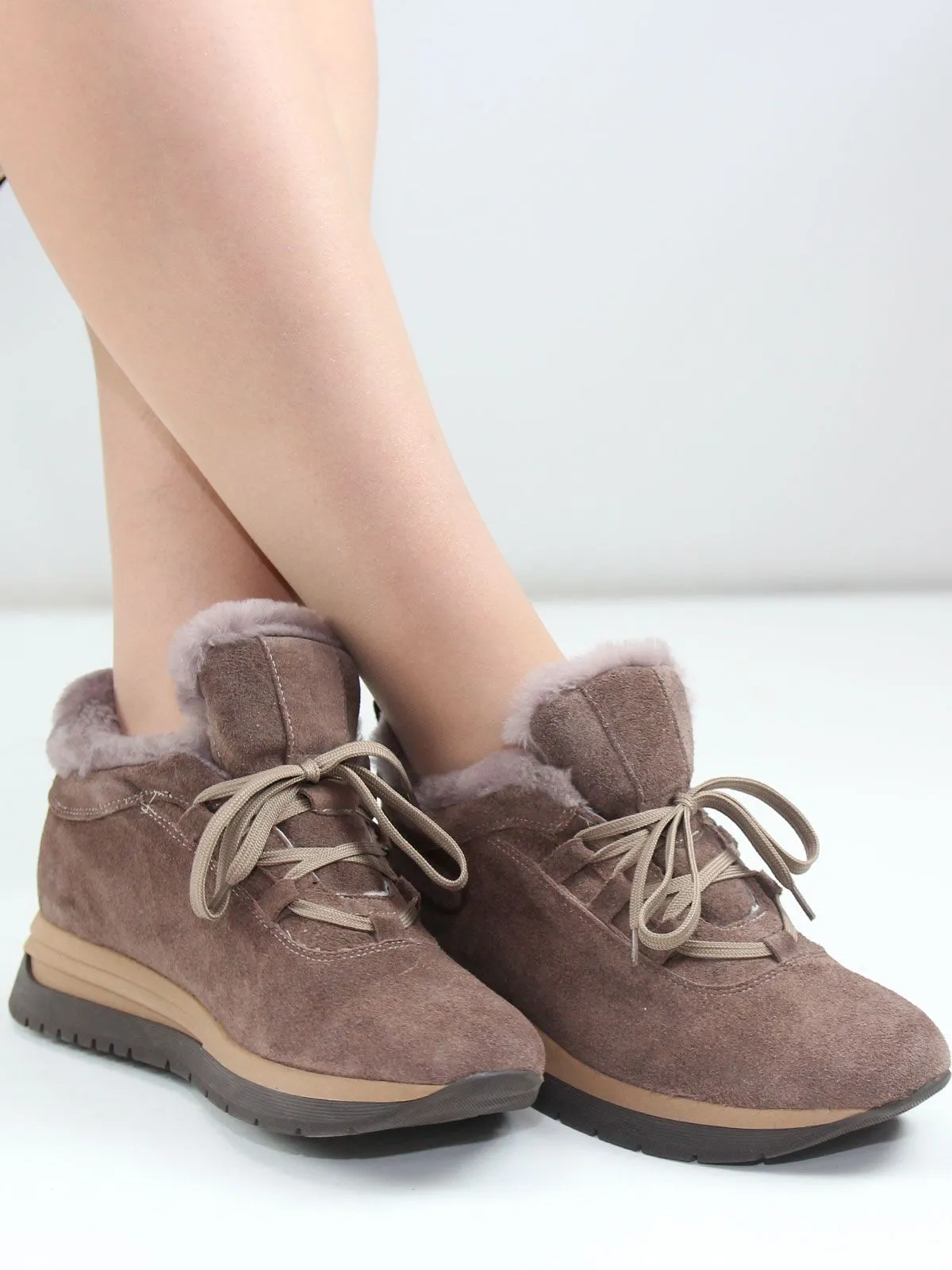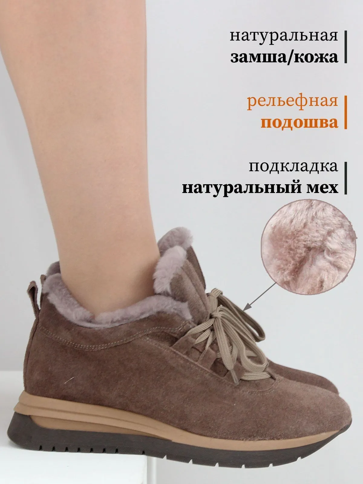 Зимние женские кроссовки больших размеров серо-коричневого цвета на шнуровке. Кроссовки из натуральной замши с толстым натуральным мехом по всей высоте, очень теплые. Подошва из современного полимерного материала - прочная, морозоустойчивая и не скользит. Подойдут на стандартную полноту.