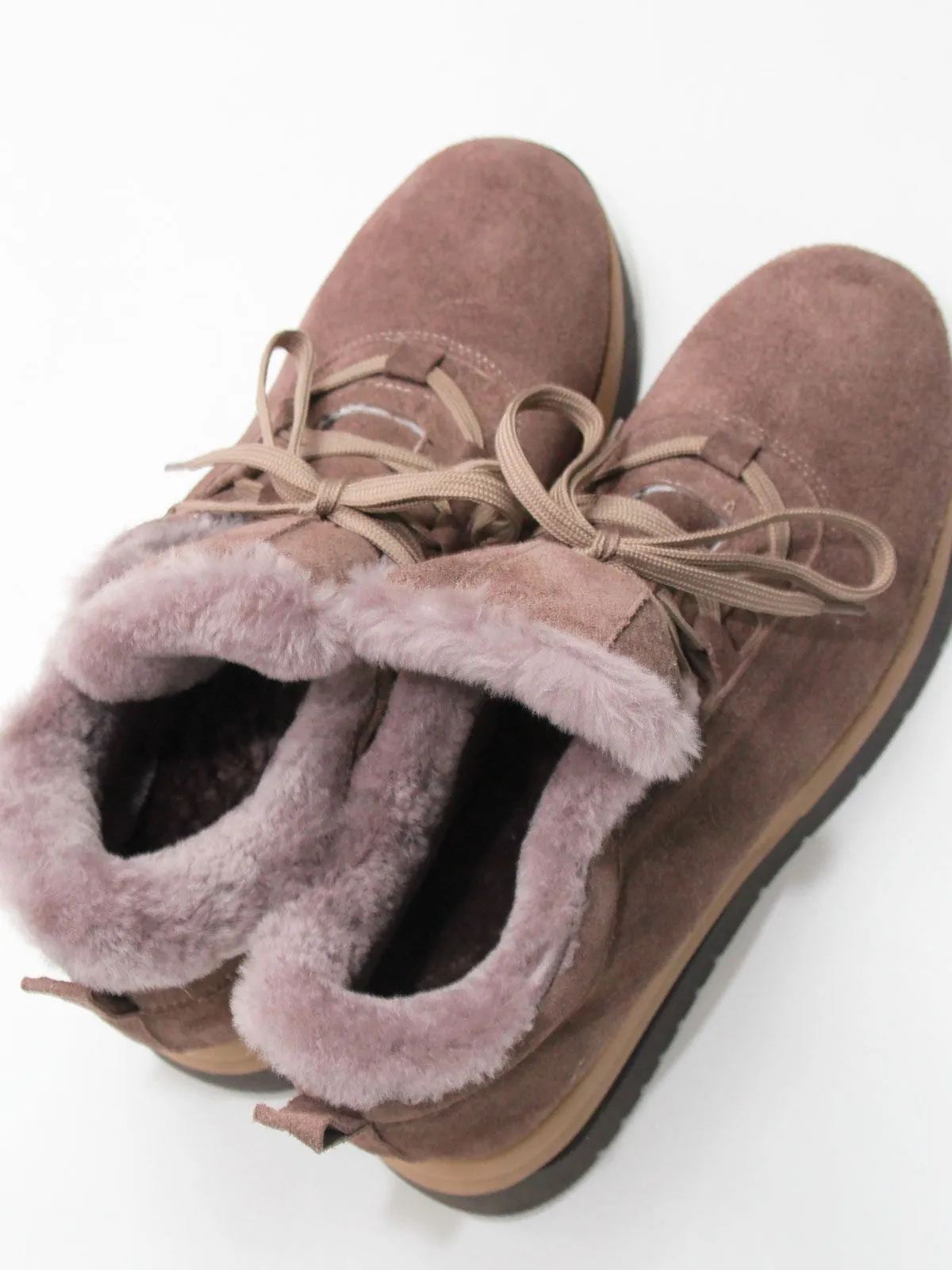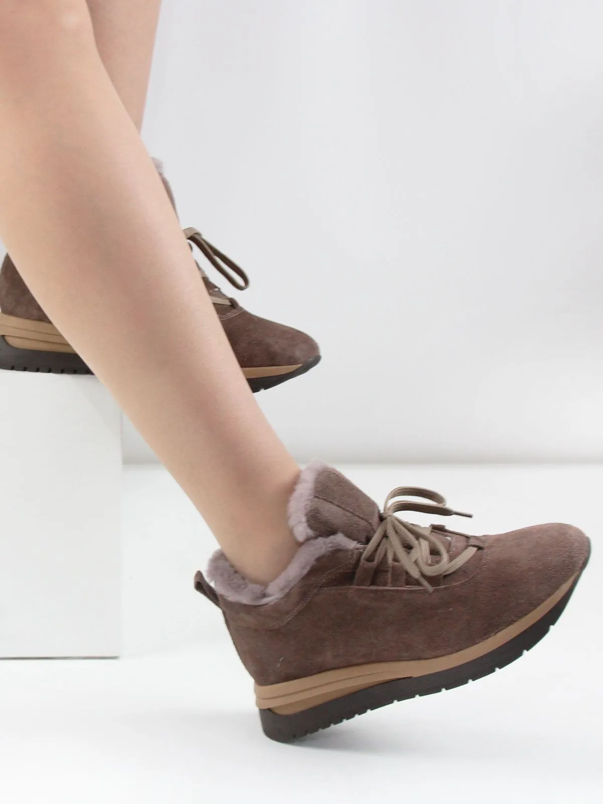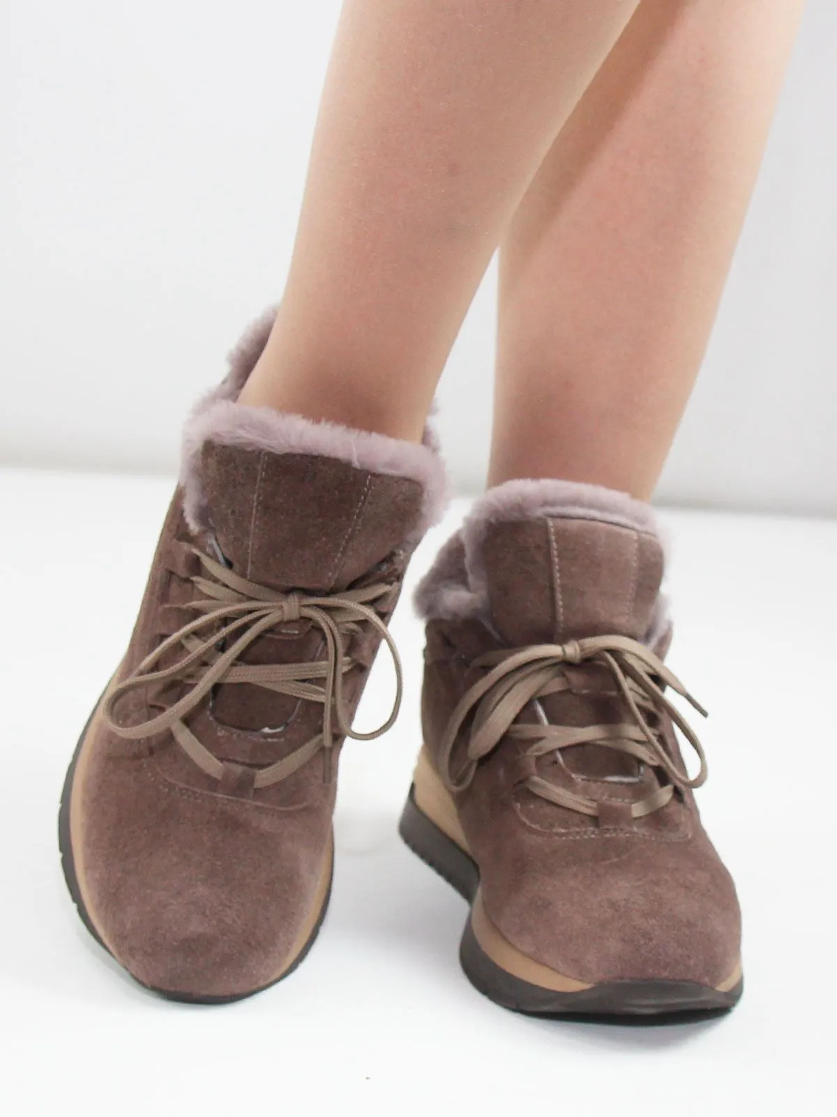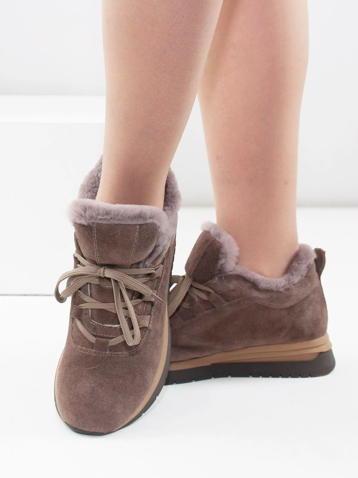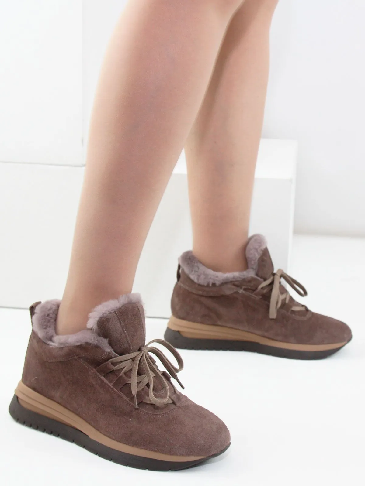 Зимние женские кроссовки больших размеров серо-коричневого цвета на шнуровке. Кроссовки из натуральной замши с толстым натуральным мехом по всей высоте, очень теплые. Подошва из современного полимерного материала - прочная, морозоустойчивая и не скользит. Подойдут на стандартную полноту.