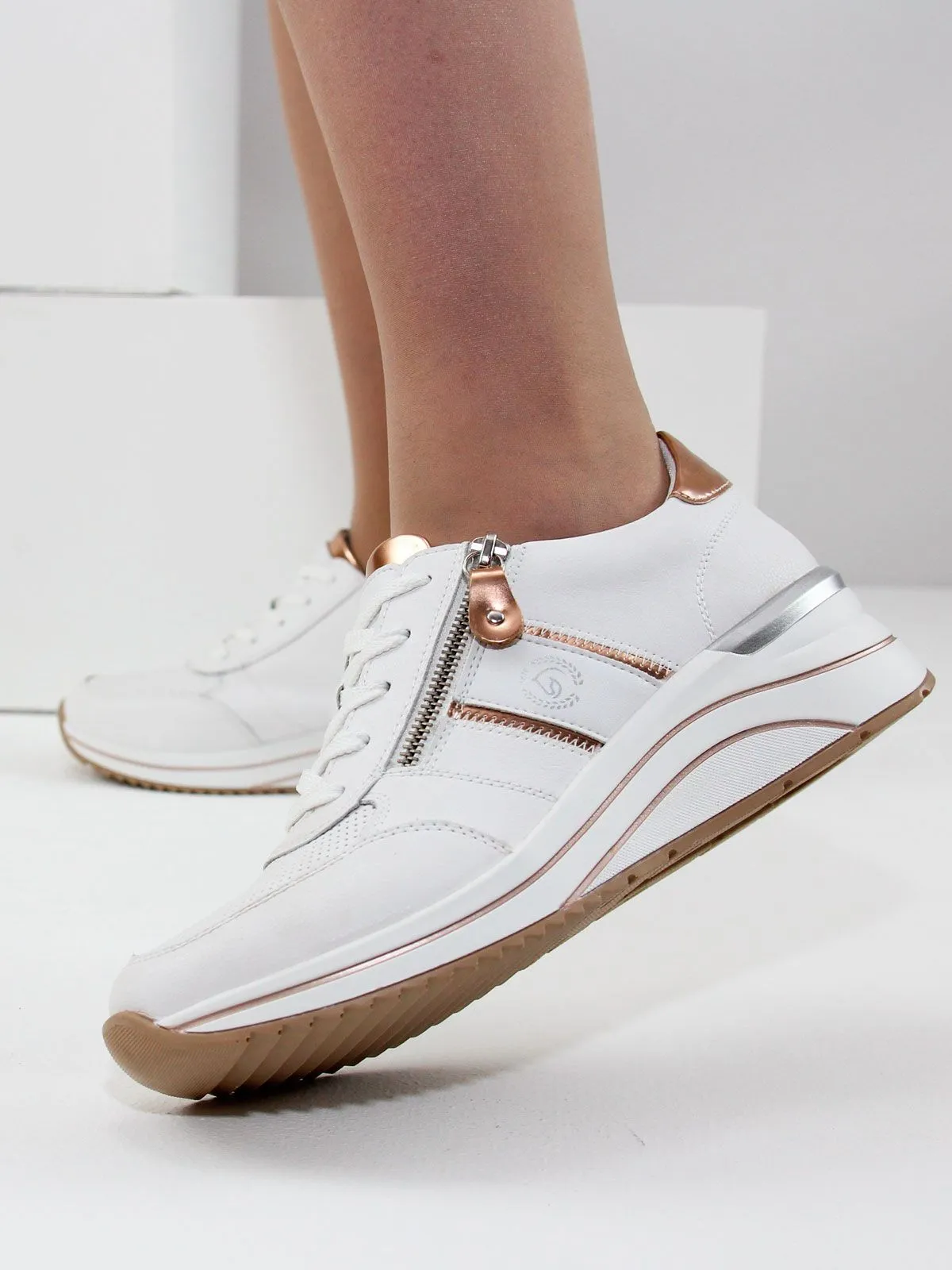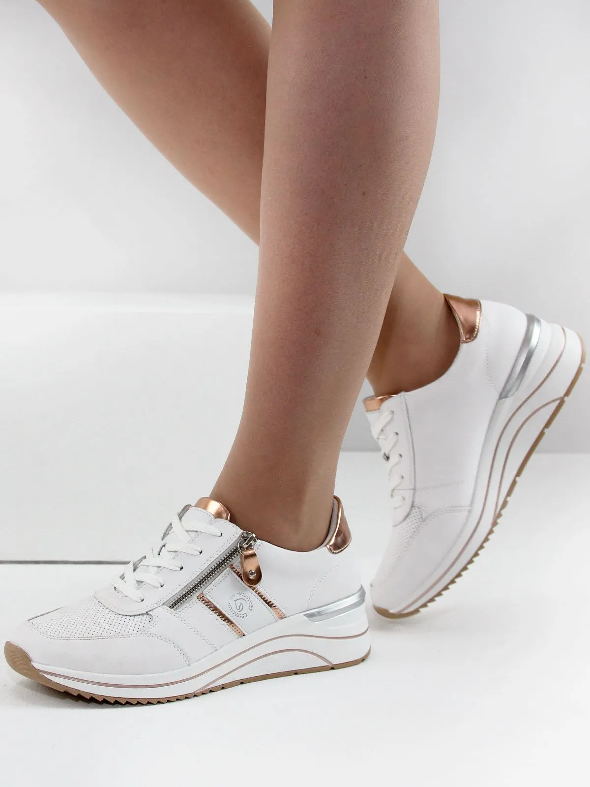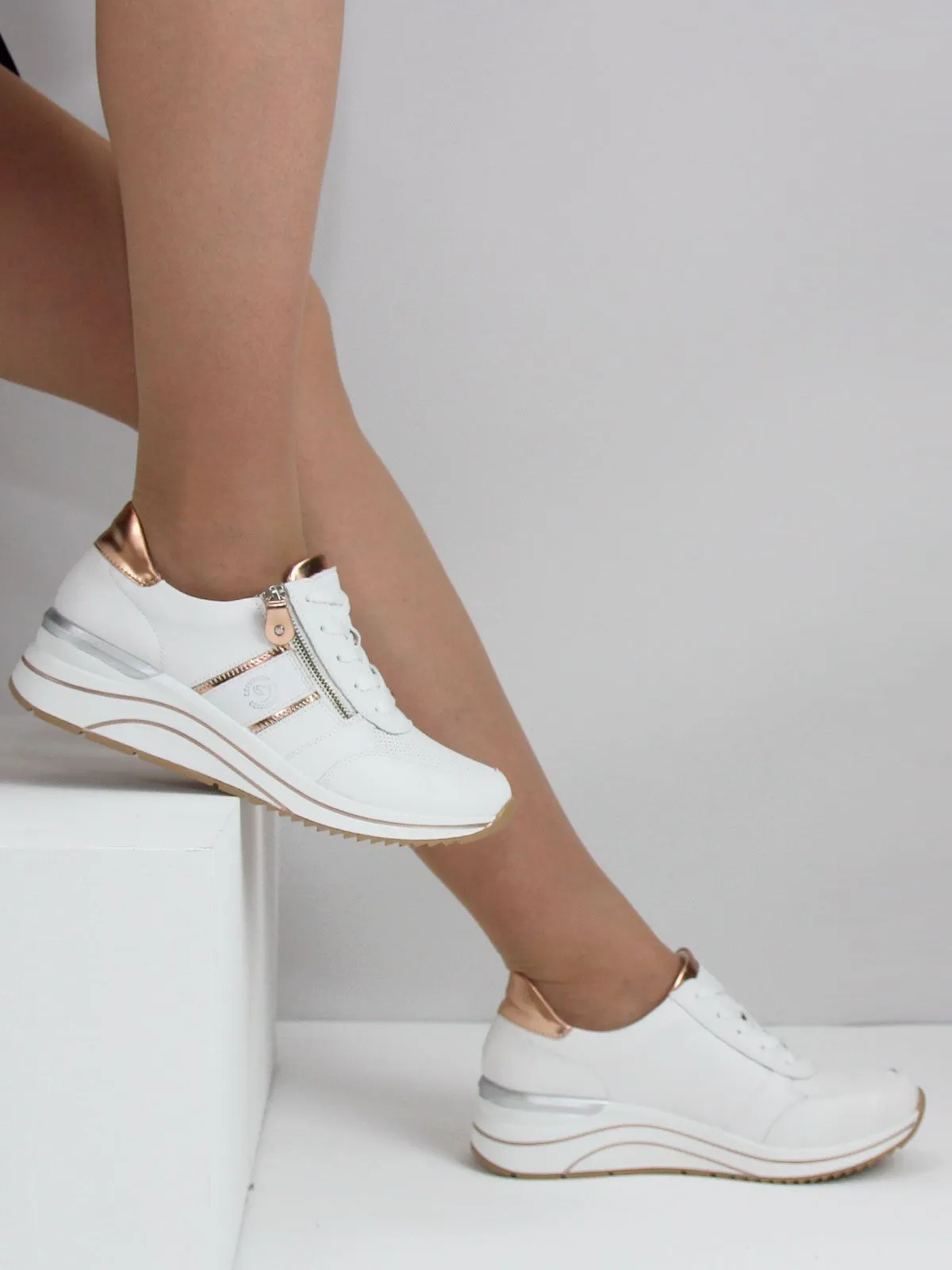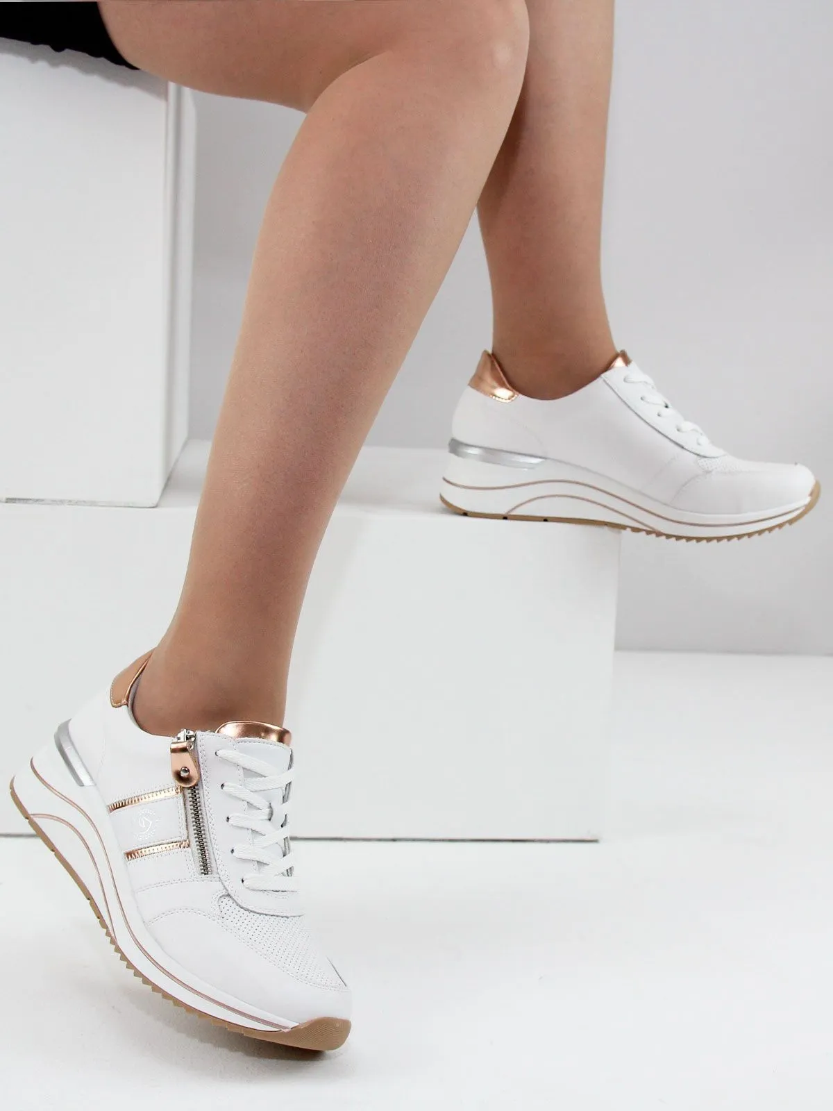 Идеальные белые стильные кроссовки большого размера для женщин. Эти кроссовки не только выглядят элегантно благодаря сочетанию белого и золотистого, но и обеспечивают максимальный комфорт. Съёмная мягкая стелька гарантирует удобство при каждом шаге, а шнуровка и молния делают процесс надевания простым и быстрым.