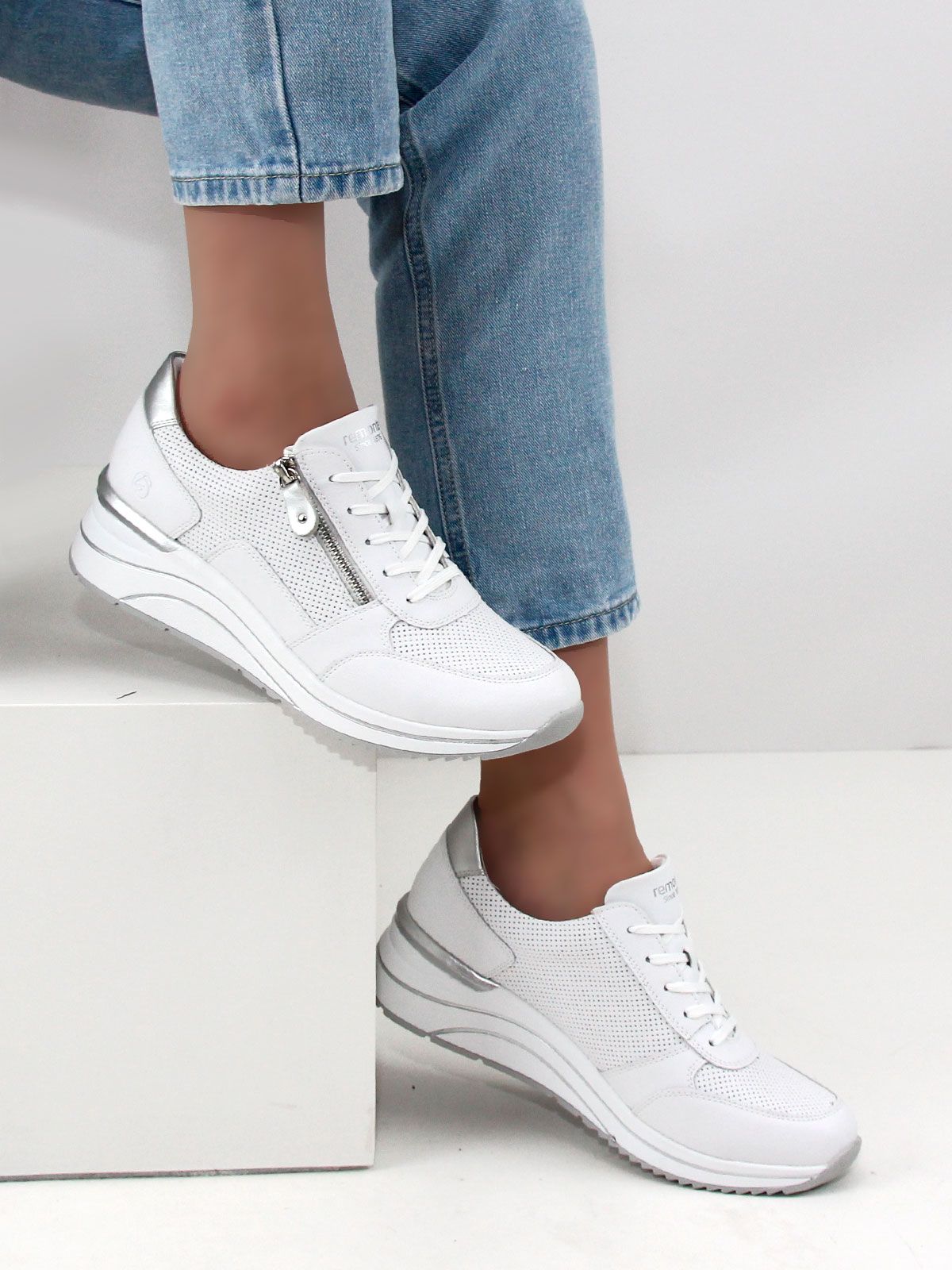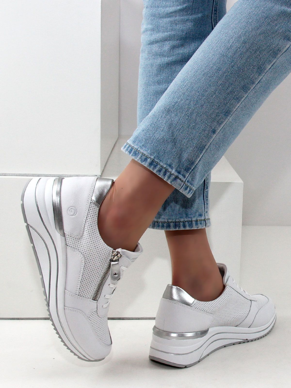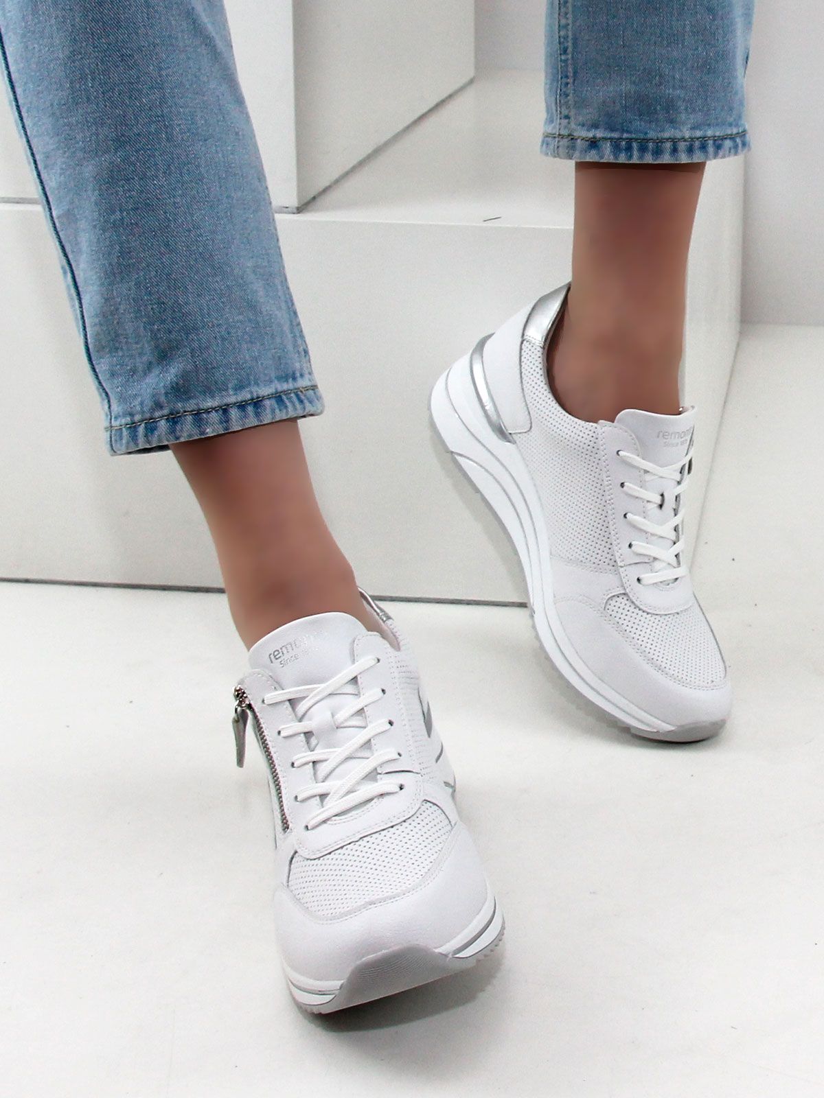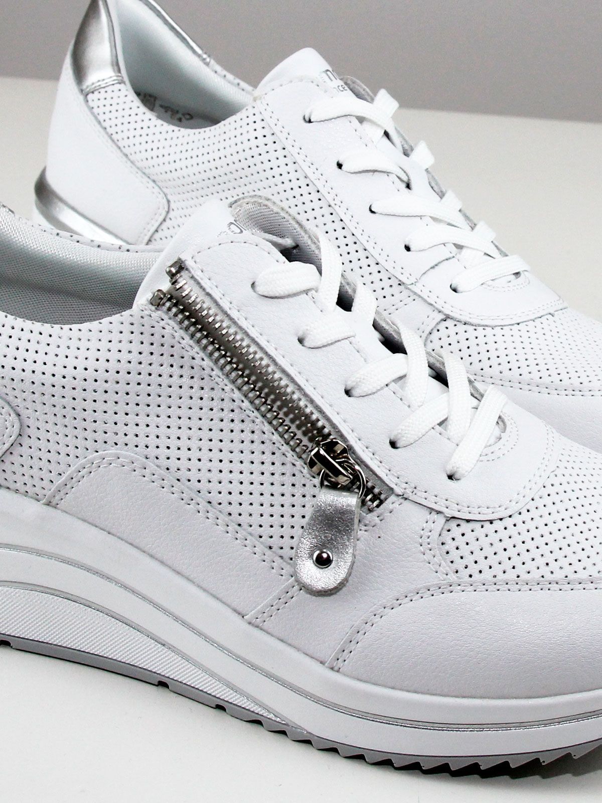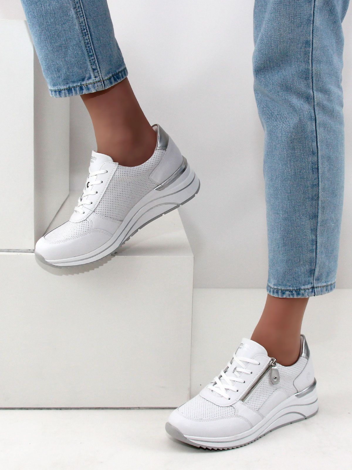 Кроссовки выполнены в белом цвете, что делает их универсальными и подходящими к любому образу. Белая подошва придаёт обуви элегантный вид и обеспечивает хорошее сцепление с поверхностью. Лёгкая серебристая отделка добавляет кроссовкам изысканности и шарма.