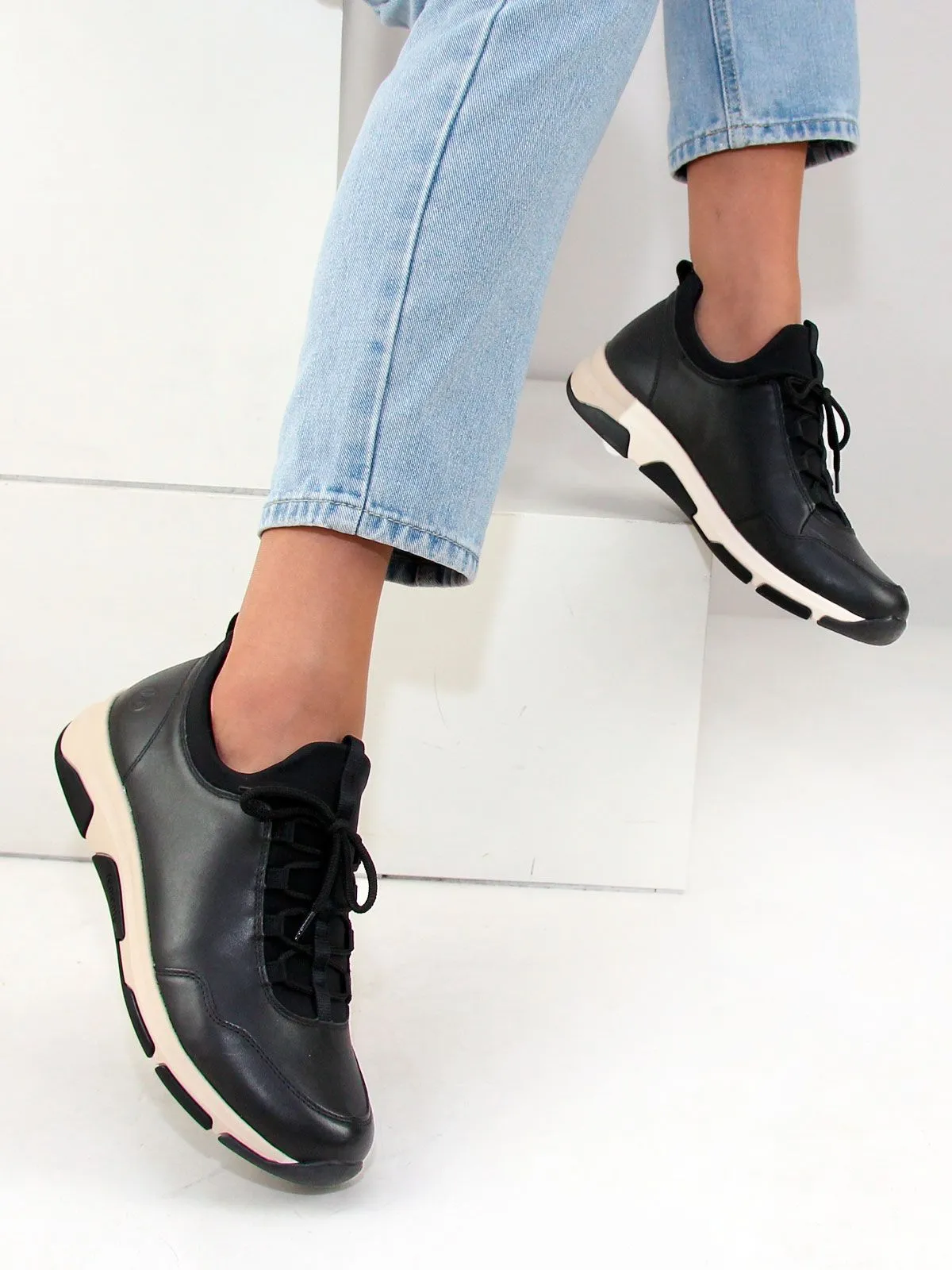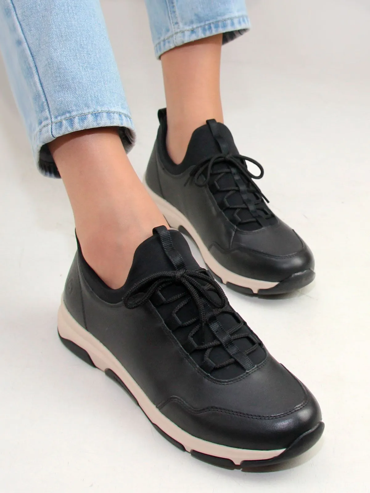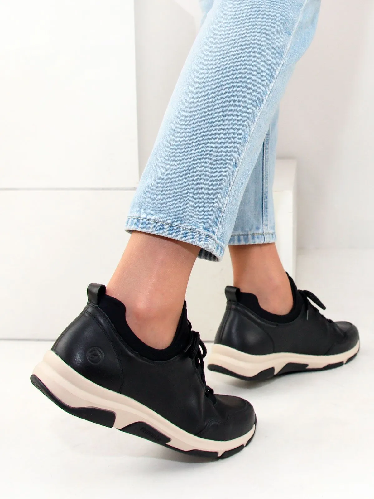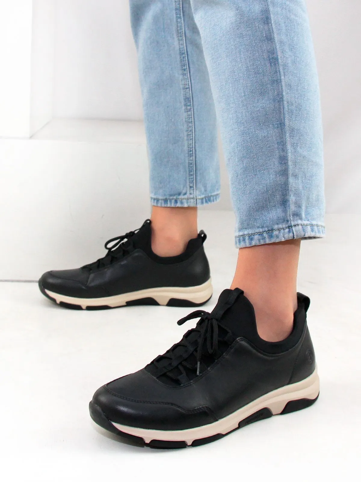 Демисезонные черные кроссовки на нескользкой светлой подошве разработаны с учетом последних модных трендов. Модель адаптирована к интенсивной носке каждый день. Обувь Remonte отлично сидит, благодаря продуманной конструкции, и снижает тем самым нагрузку на ноги, что особенно заметно, если вы весь день активно двигаетесь. Сверху - эластичная вставка. Съемная мягкая стелька.