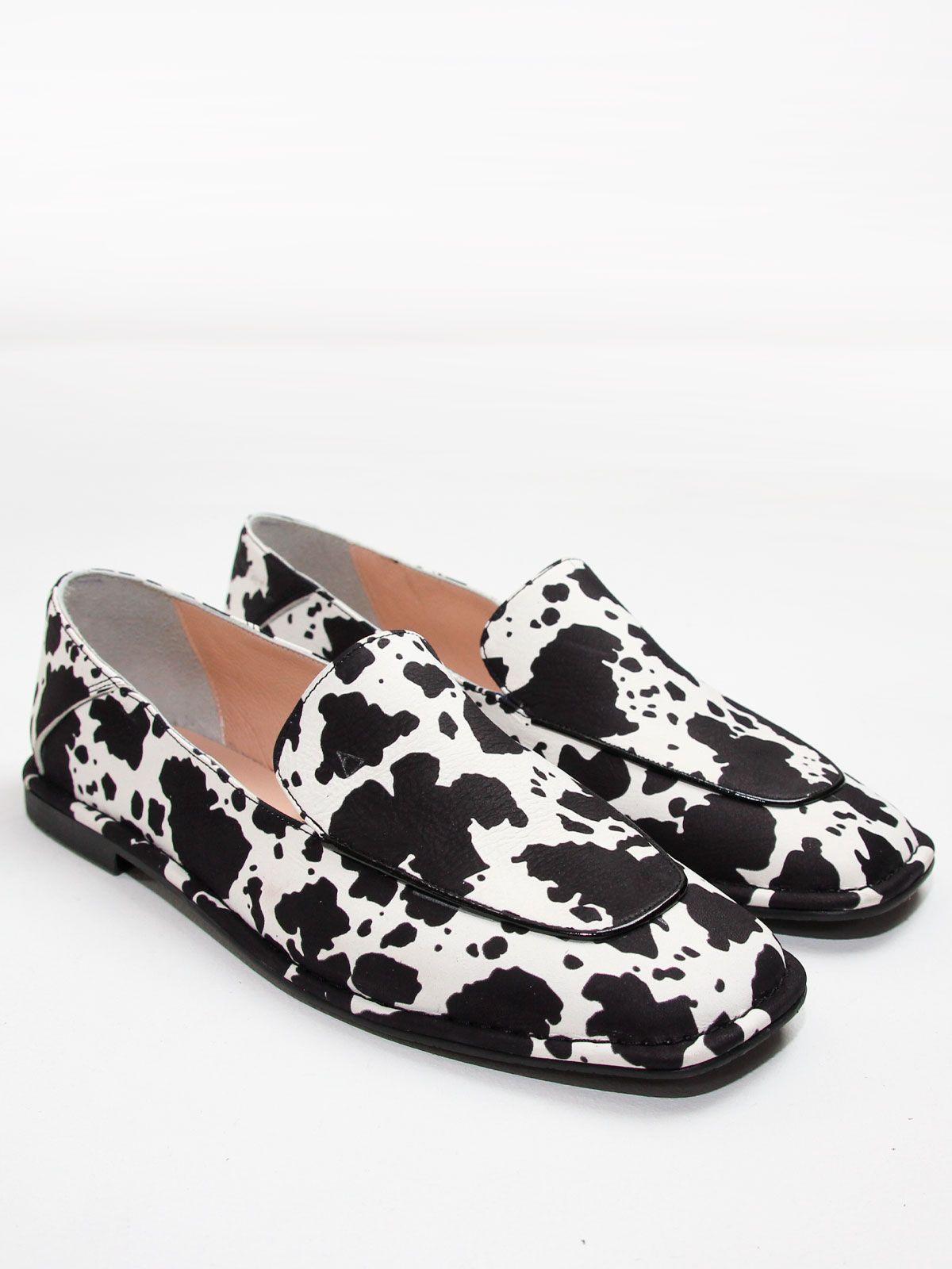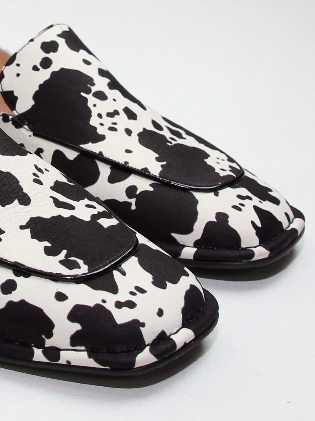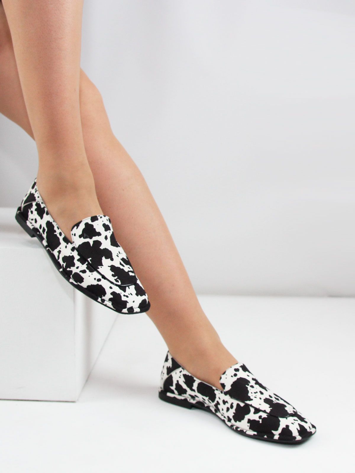 Стильные женские лоферы большого размера из натуральной кожи с эффектным коровьим принтом — яркая и модная модель для современного гардероба. Контрастный чёрно-белый принт выглядит очень актуально и является одним из заметных трендов последних сезонов, позволяя легко создать стильный и выразительный образ.