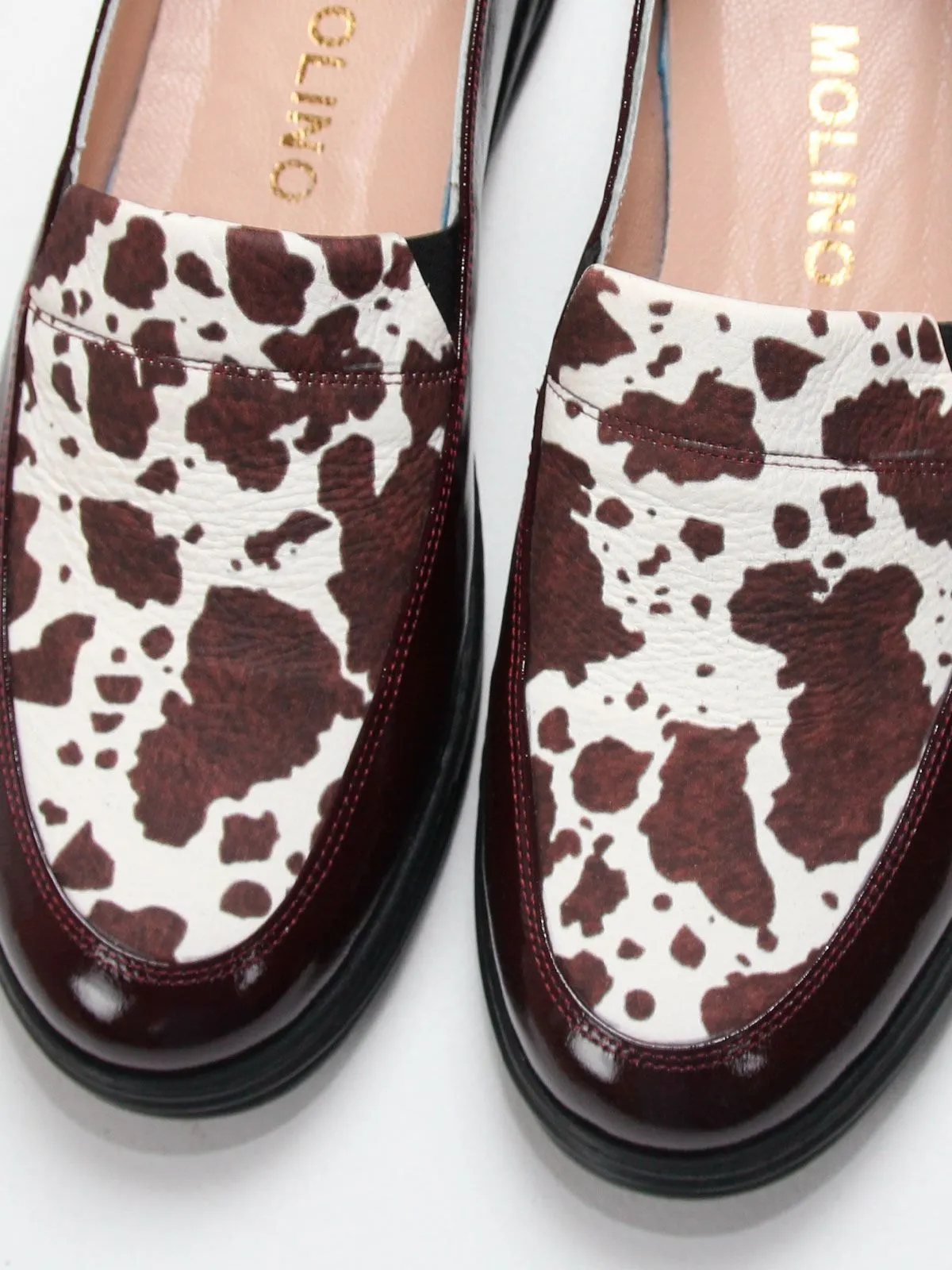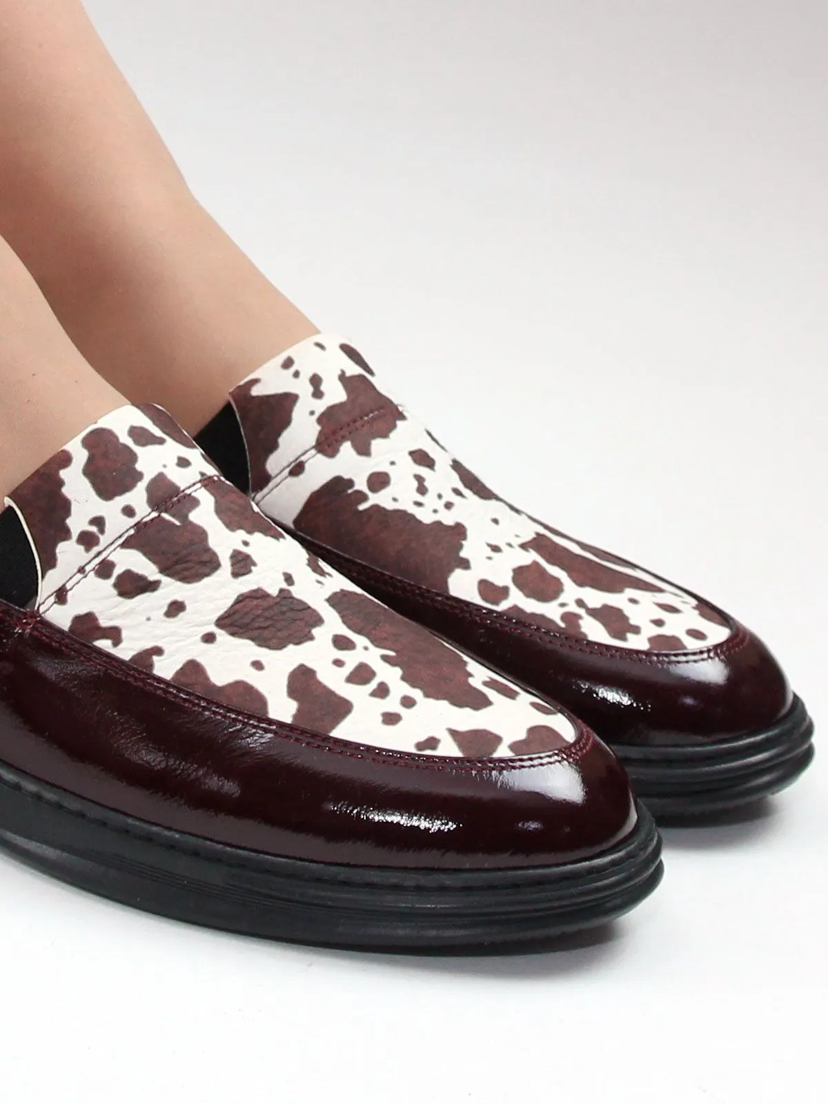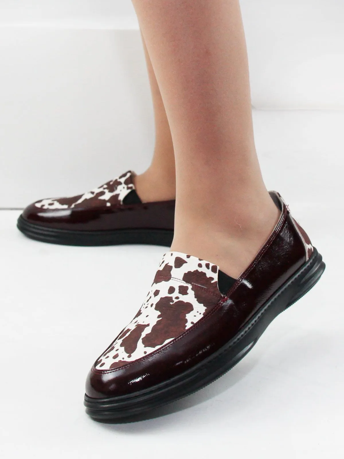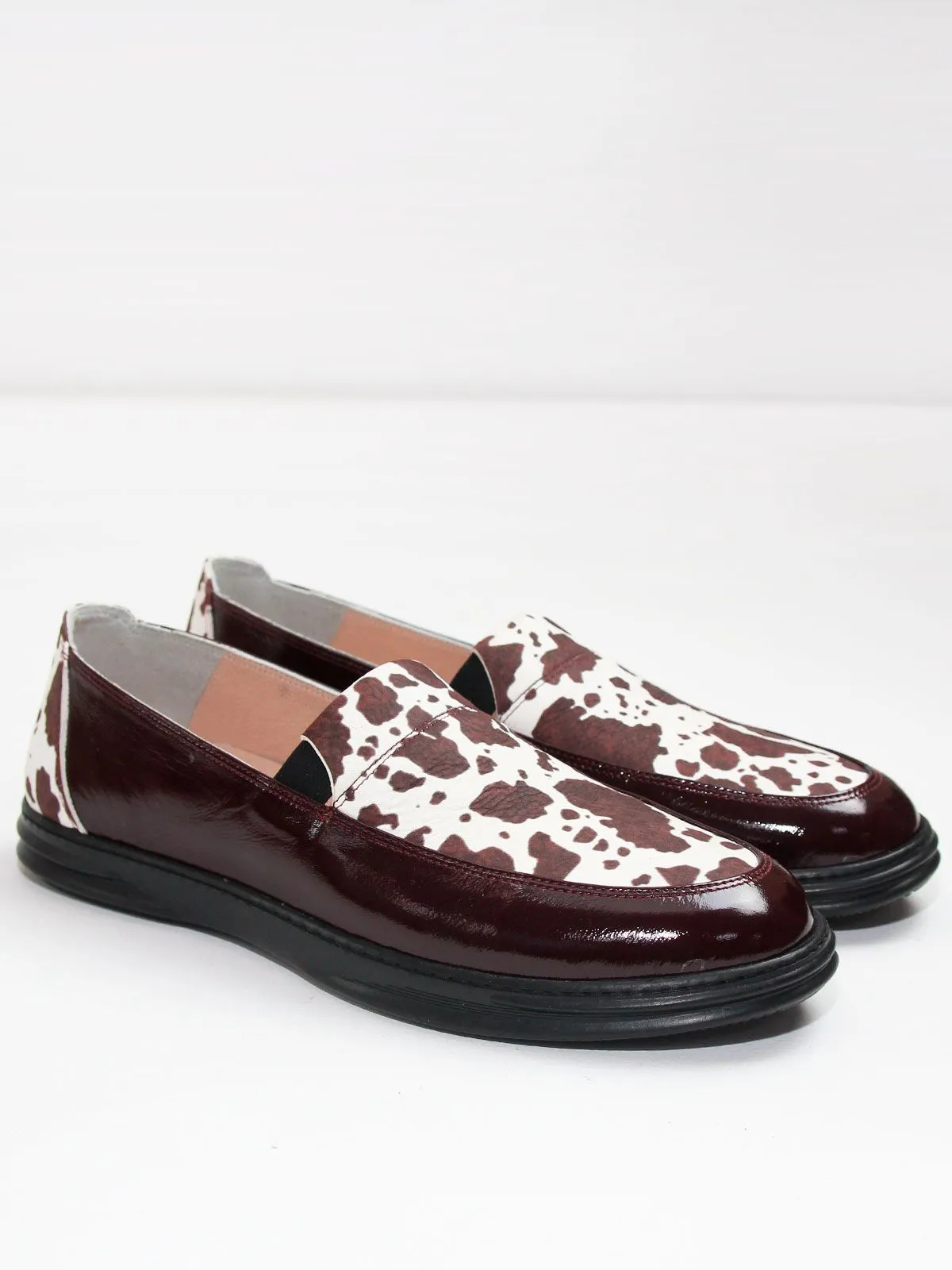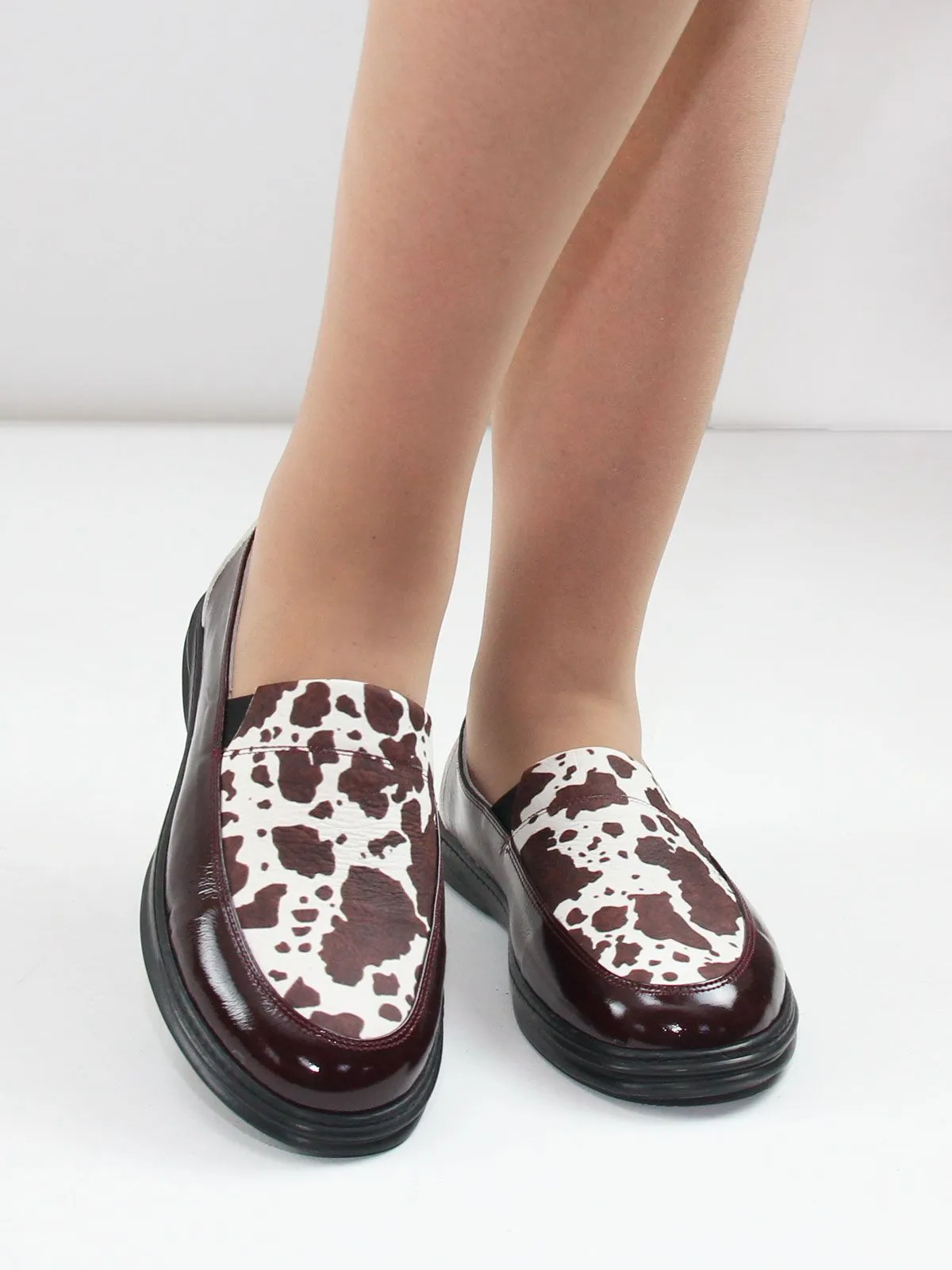 Женские лоферы серии комфорт большого размера из мягкой натуральной кожи тёмно-бордового цвета — стильная и удобная обувь для повседневного гардероба. Модель дополнена вставкой из натуральной кожи с коровьим принтом, который сейчас является очень актуальным модным акцентом и делает обувь более выразительной и современной, при этом оставаясь легко сочетаемой с разными образами.