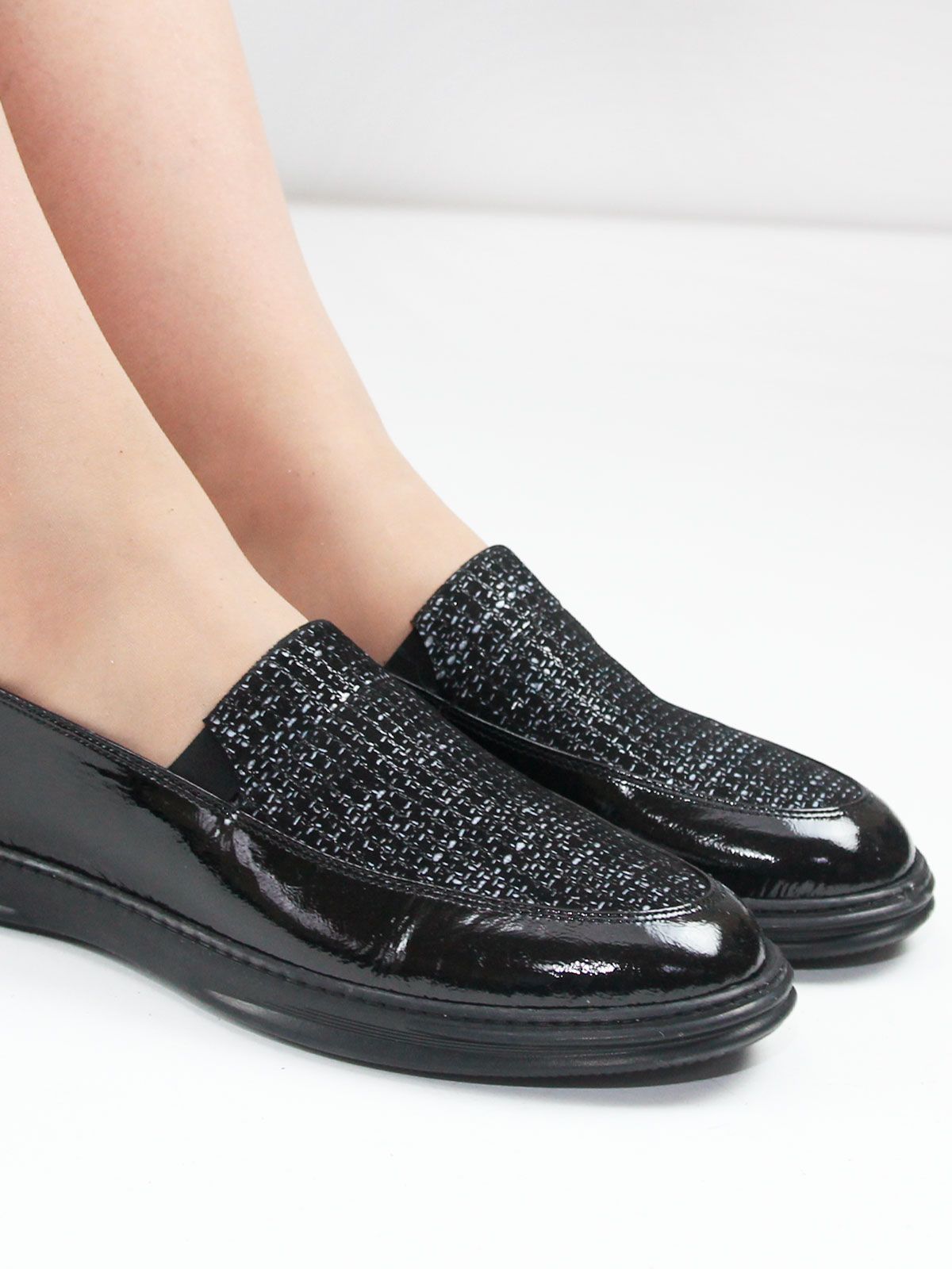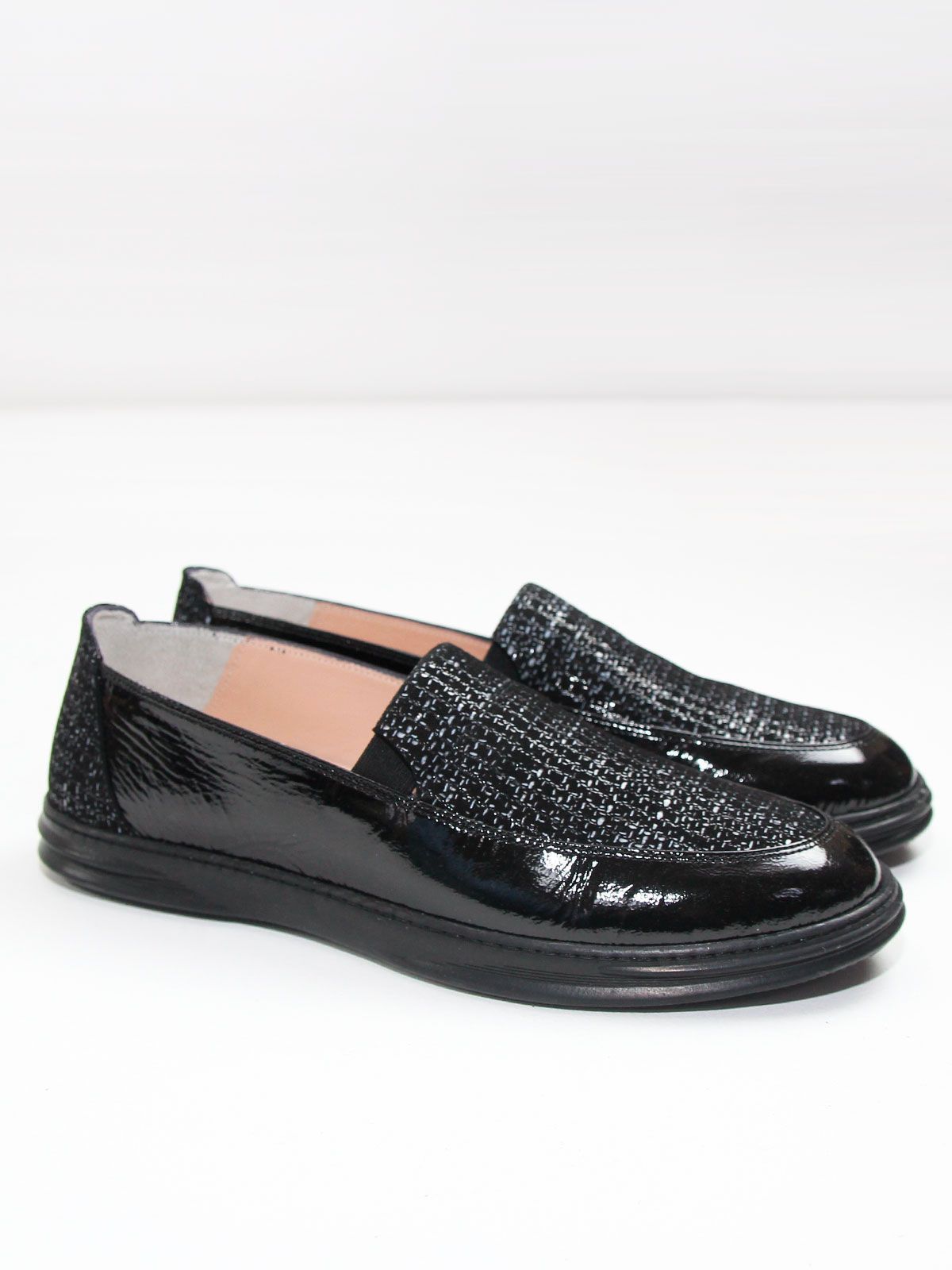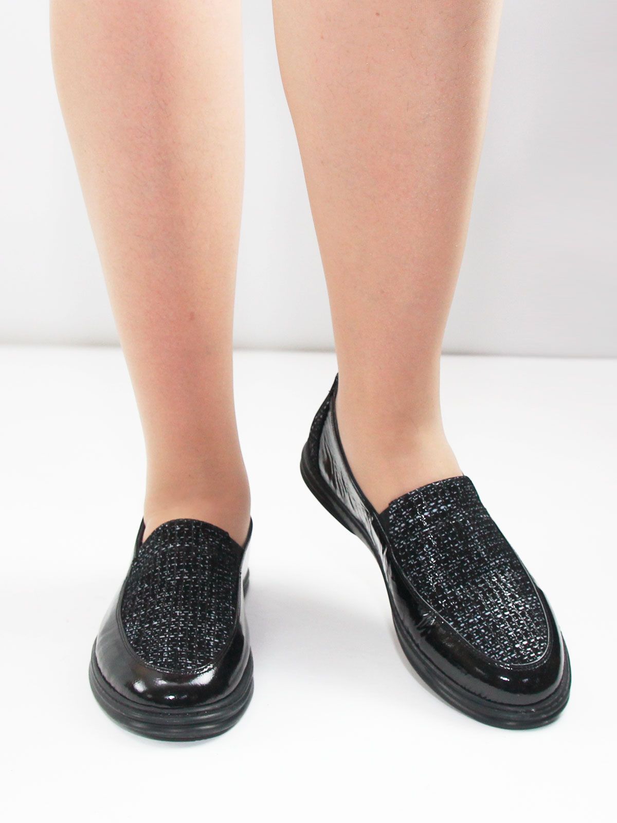 Женские лоферы серии комфорт большого размера из мягкой натуральной лакированной кожи чёрного цвета — удобная и стильная обувь для повседневного гардероба. Модель дополнена фактурной вставкой из натуральной кожи чёрного цвета с деликатной текстурой, которая добавляет обуви глубину и интересный визуальный акцент, при этом сохраняя элегантный и универсальный внешний вид.