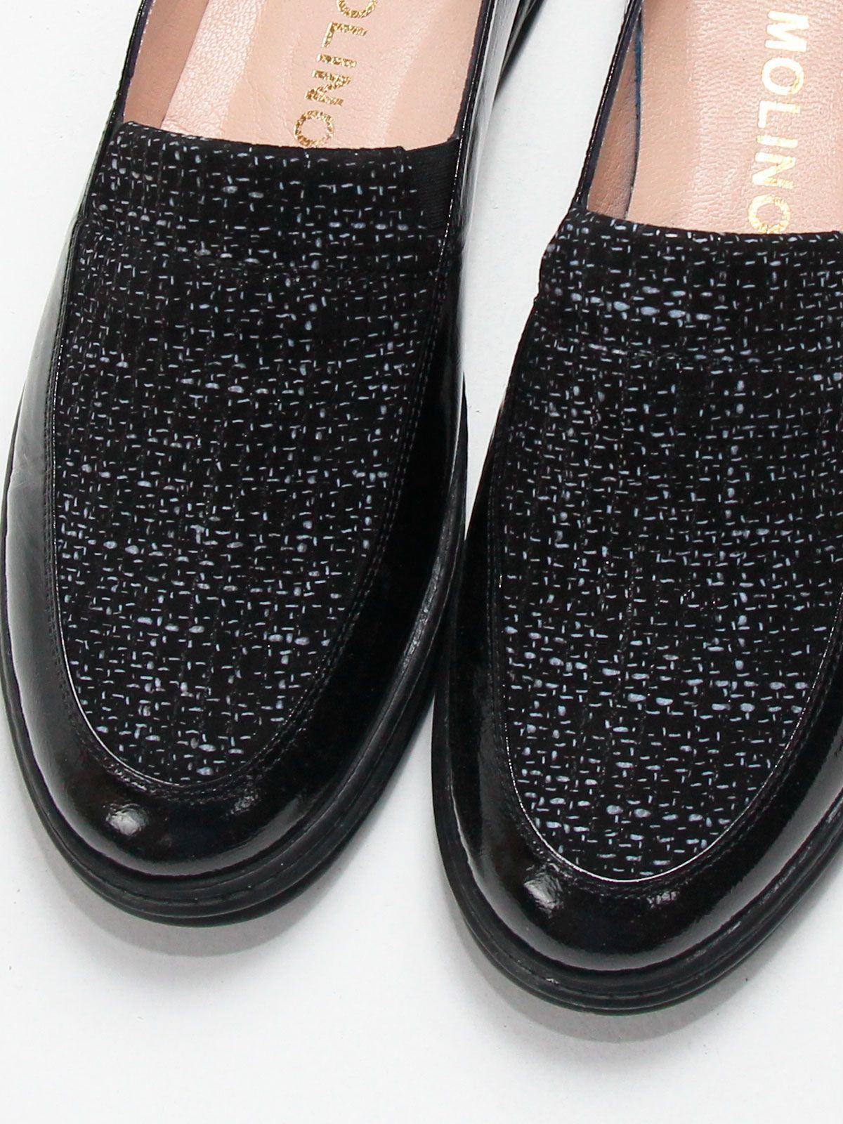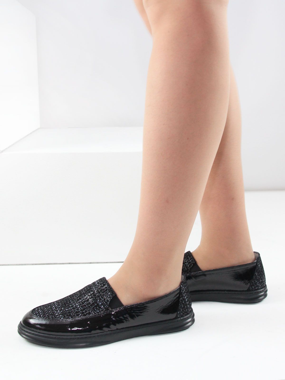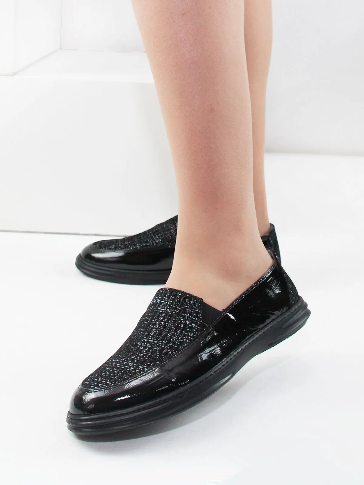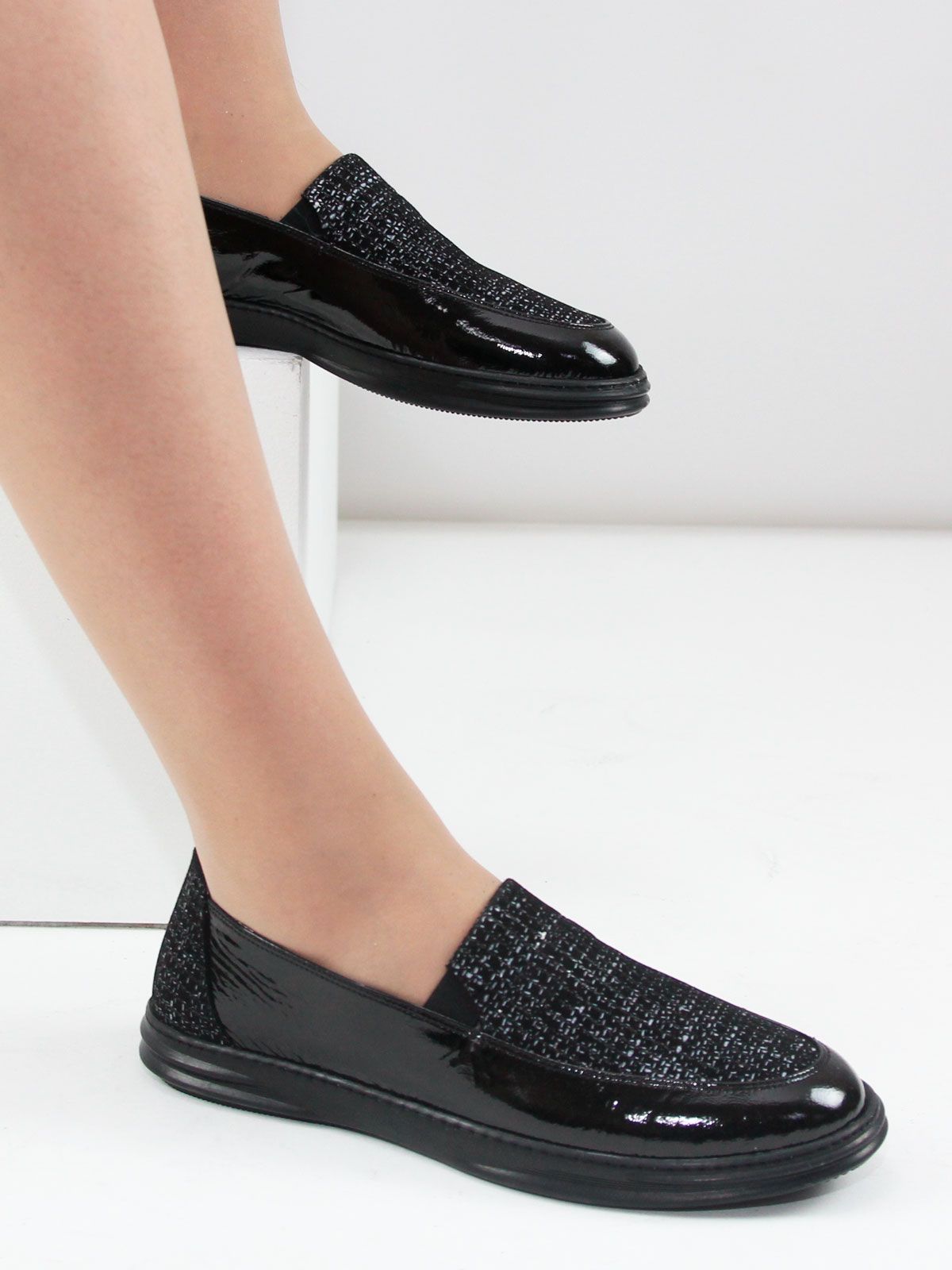 Женские лоферы серии комфорт большого размера из мягкой натуральной лакированной кожи чёрного цвета — удобная и стильная обувь для повседневного гардероба. Модель дополнена фактурной вставкой из натуральной кожи чёрного цвета с деликатной текстурой, которая добавляет обуви глубину и интересный визуальный акцент, при этом сохраняя элегантный и универсальный внешний вид.