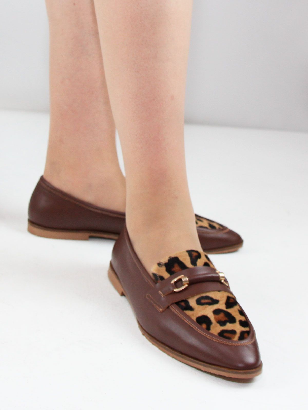 Стильные женские лоферы из натуральной коричневой матовой кожи. Модель с острым мысом выполнена с декоративной вставкой из ворсистой натуральной кожи с леопардовым окрасом. Подкладка - натуральная кожа.
