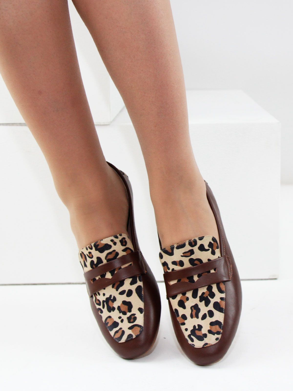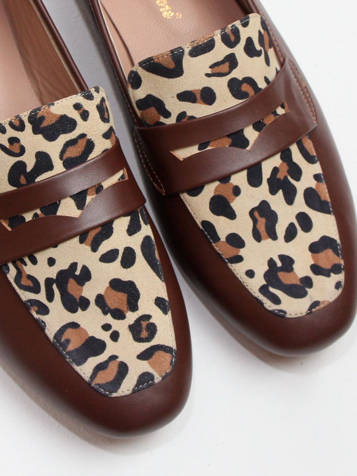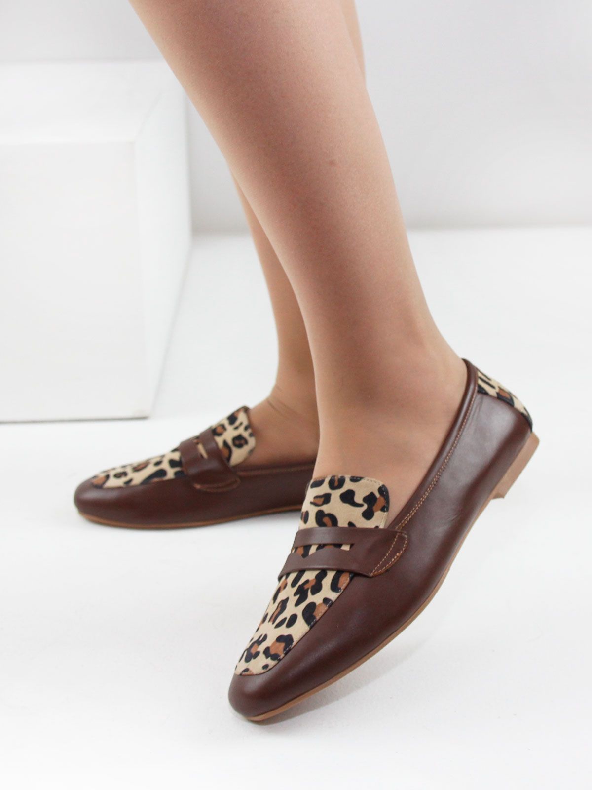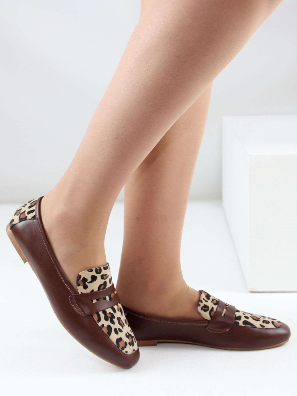 Стильные женские лоферы из натуральной коричневой матовой кожи. Модель с острым мысом выполнена с декоративной вставкой из натуральной кожи с леопардовым окрасом. Подкладка - натуральная кожа.