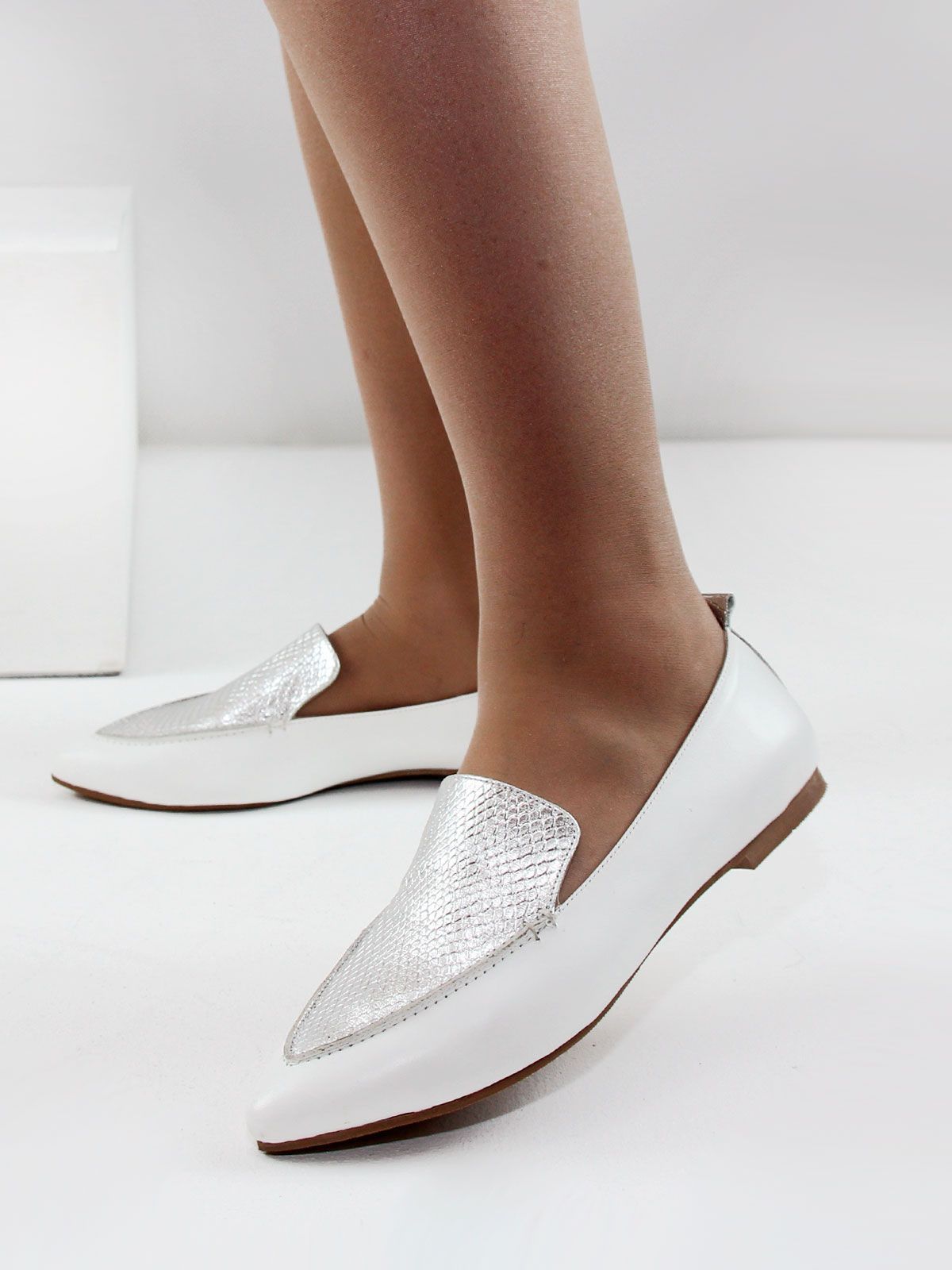 Стильные женские лоферы из натуральной кожи белого цвета. Модель с острым мысом выполнена с декоративной вставкой из натуральной кожи с принтом под змею. Подкладка - натуральная кожа.