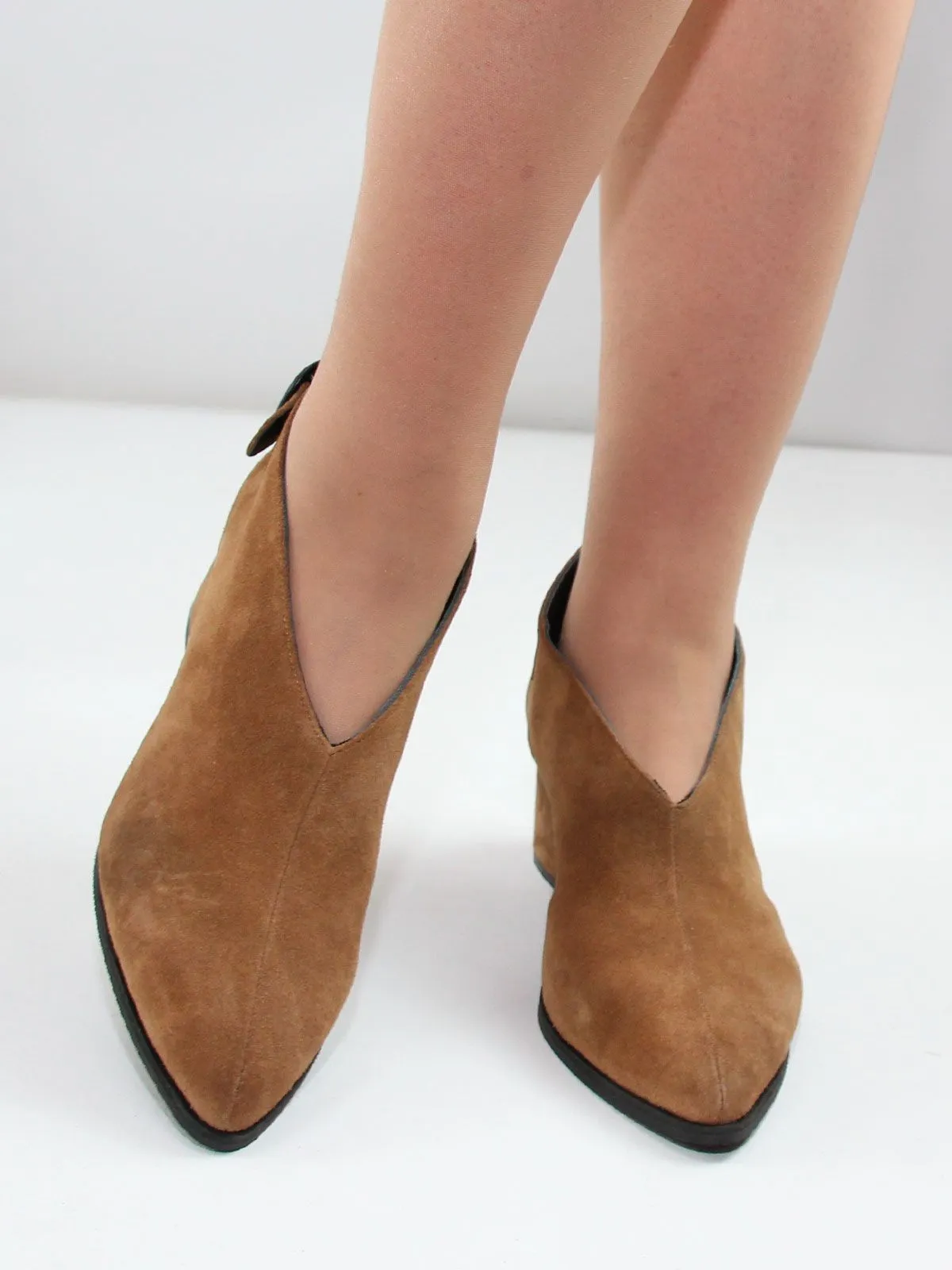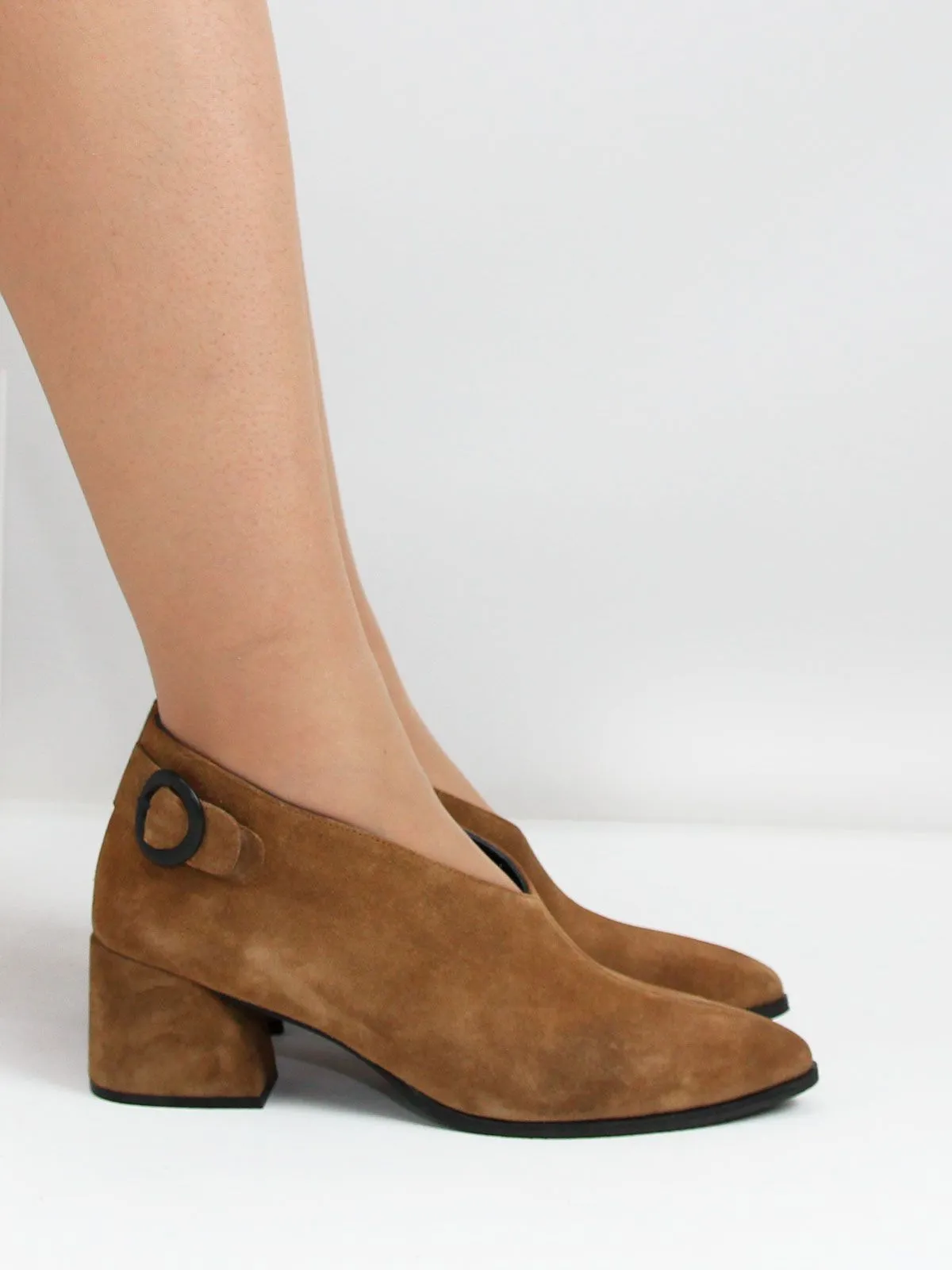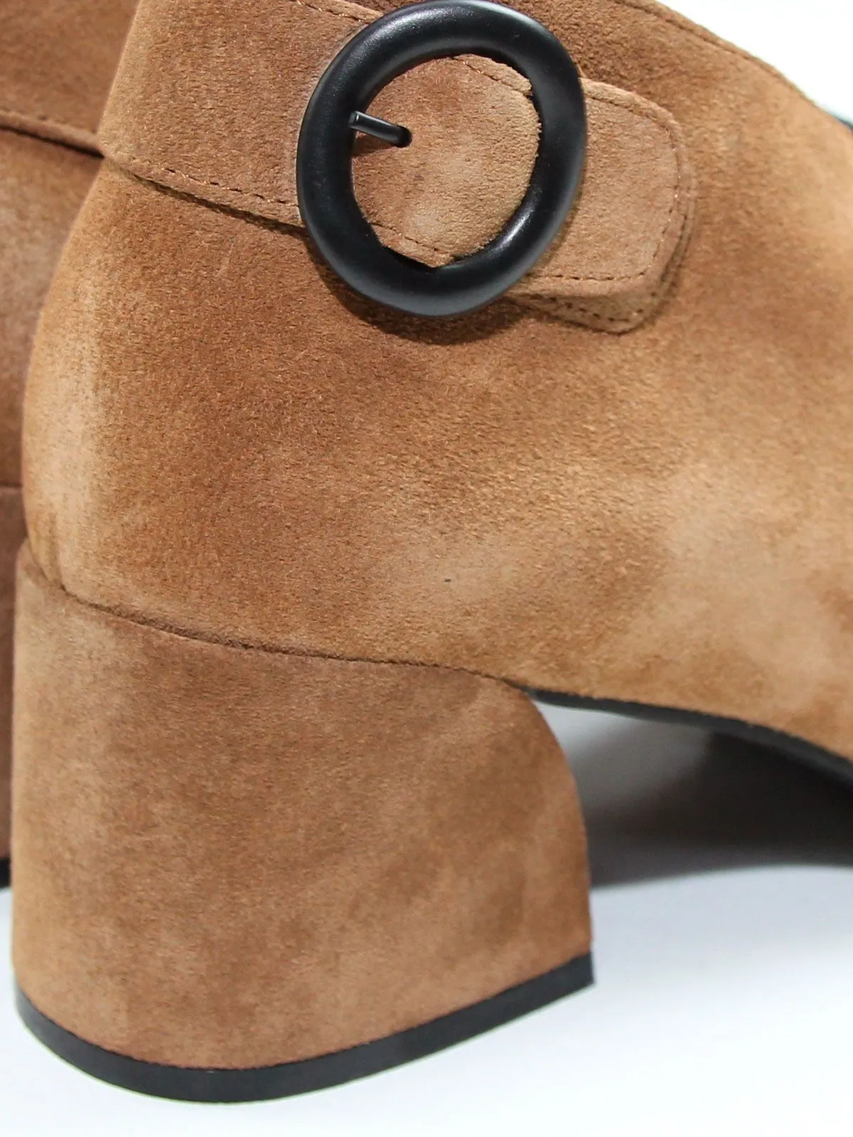 Верх выполнен из натуральной замши, а внутренняя подкладка — полностью из натуральной кожи, что обеспечивает комфорт и воздухопроницаемость. Устойчивый широкий каблук средней высоты и интересный силуэт делает модель современно-классической и практичной.