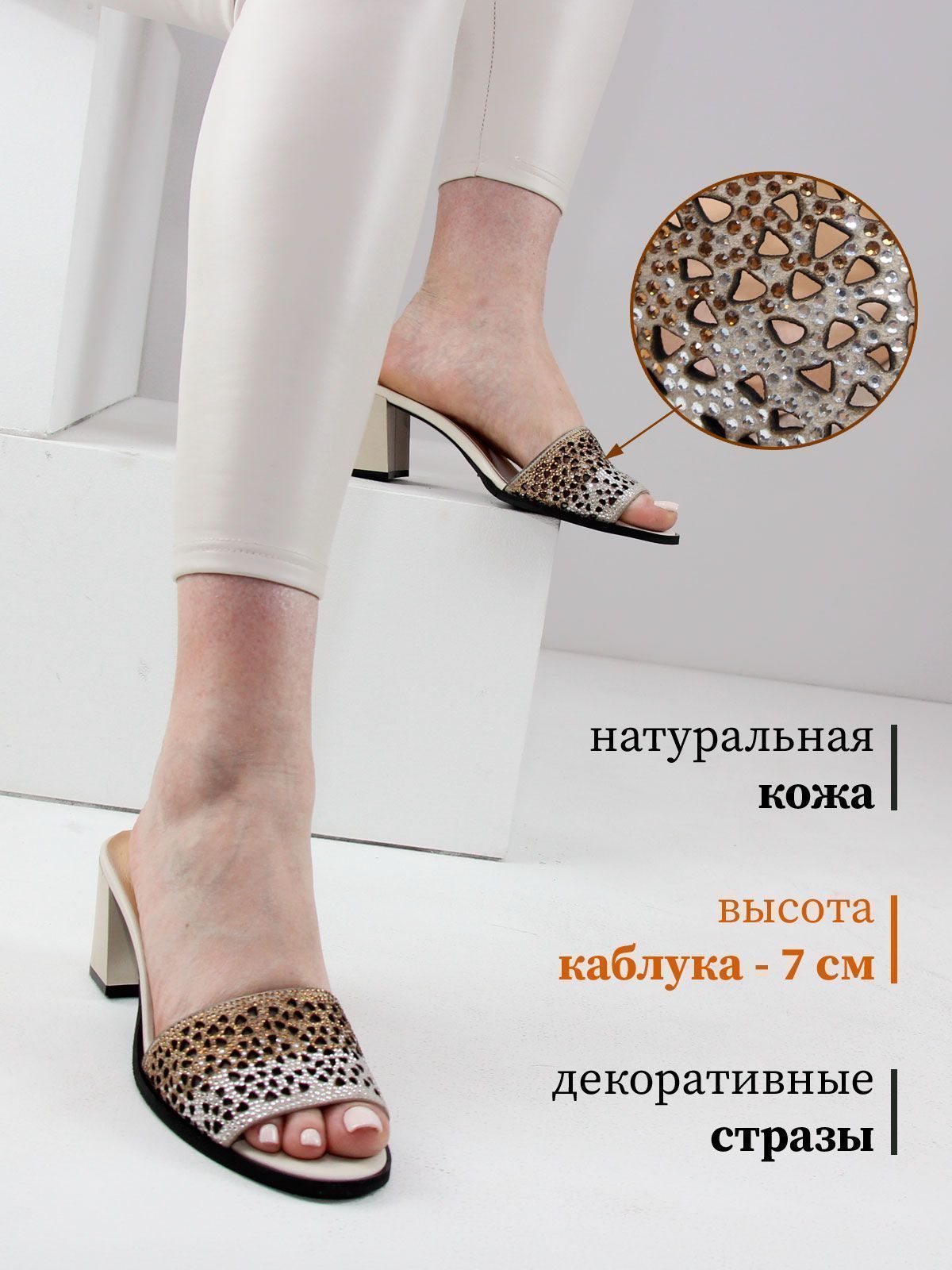 Элегантные сабо из натуральной кожи — идеальный выбор для летнего стильного гардероба. Верх модели выполнен из натуральной кожи, подкладка — из натуральной кожи для максимального комфорта. Устойчивый каблук средней высоты придаёт образу женственность. Особый акцент — мерцающие стразы, оттенок которых меняется в зависимости от освещения, добавляя обуви изысканный блеск и утончённость.