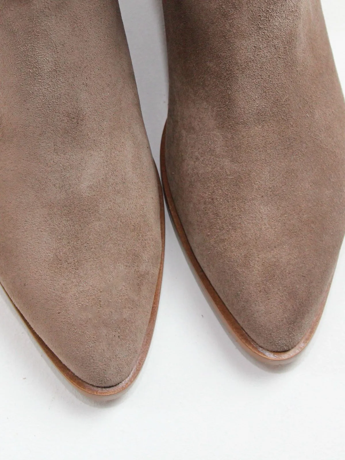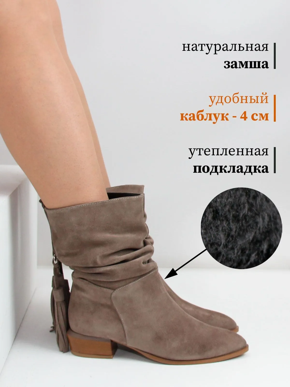 Благодаря свободному голенищу замшевые демисезонные сапоги комфортно садятся на разную полноту ноги и легко надеваются даже поверх брюк.