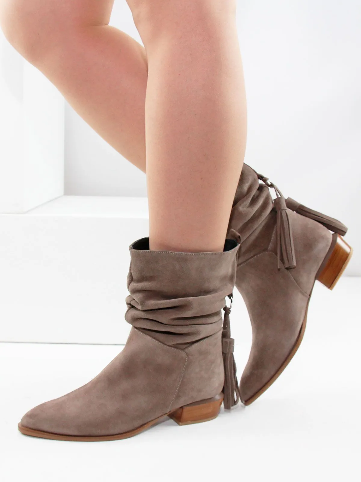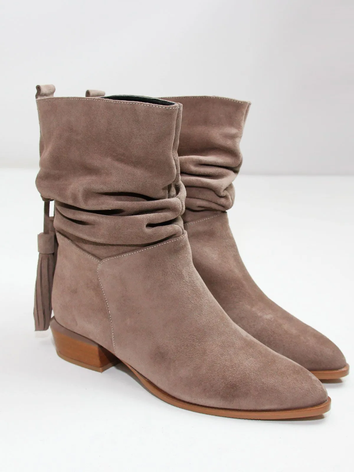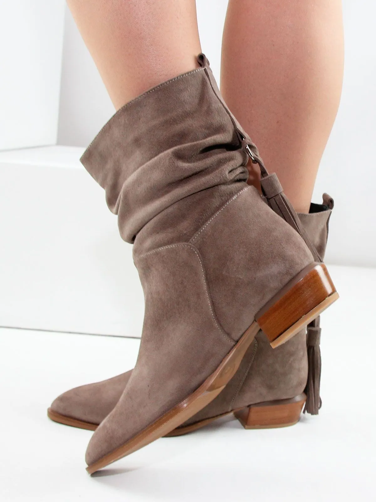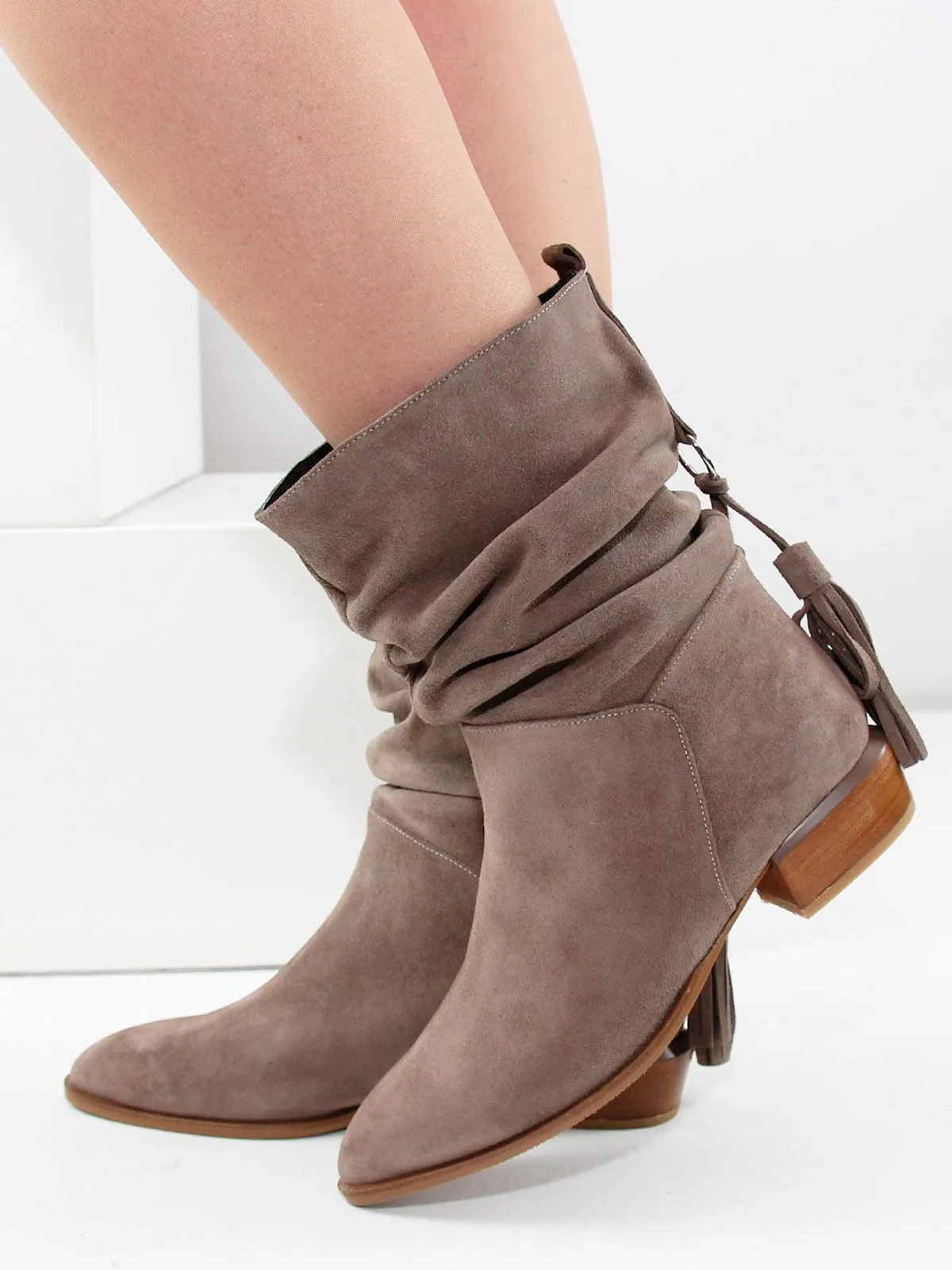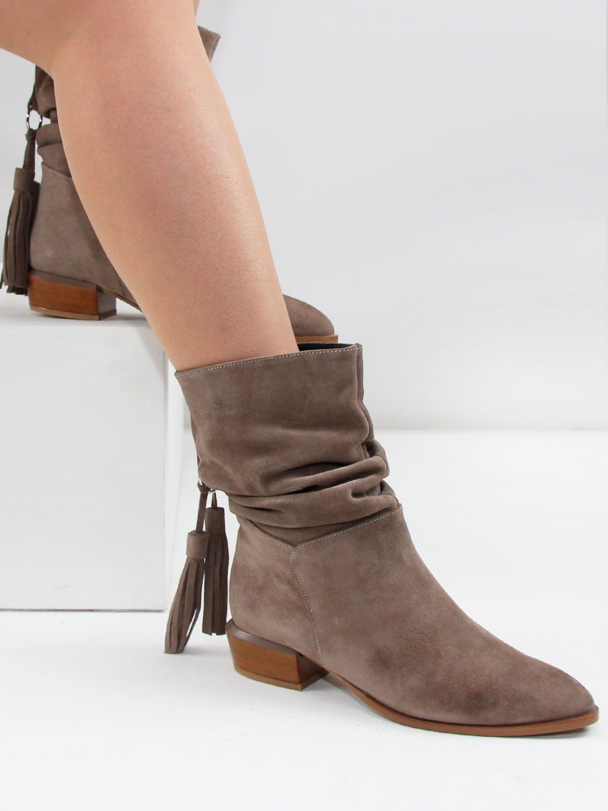 Замшевые сапоги со сборкой подойдут для повседневных, деловых и городских образов.