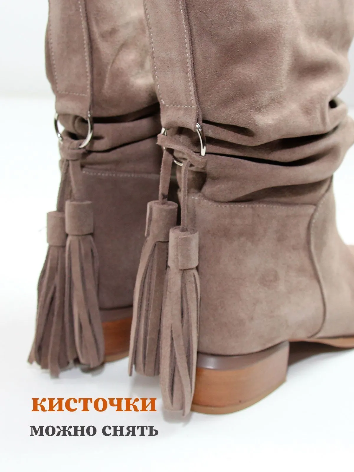 Женские замшевые сапоги казаки больших размеров 42–44 с трендовой сборкой и декоративной кисточкой.