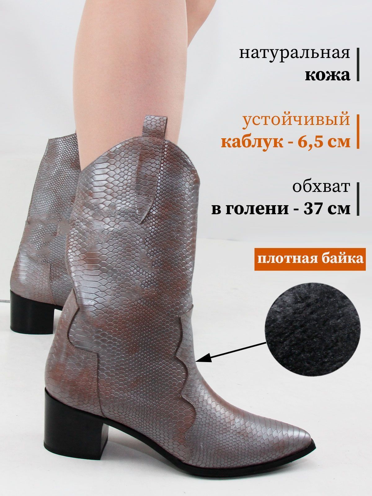 Уценка! Пятно на левом сапоге,витринный образец.Сапоги казаки женские больших размеров из натуральной кожи. Очень удобная модель на комфортном невысоком каблуке. Утепленная подкладка - байка. Подойдут на стандартную и умеренно широкую голень.