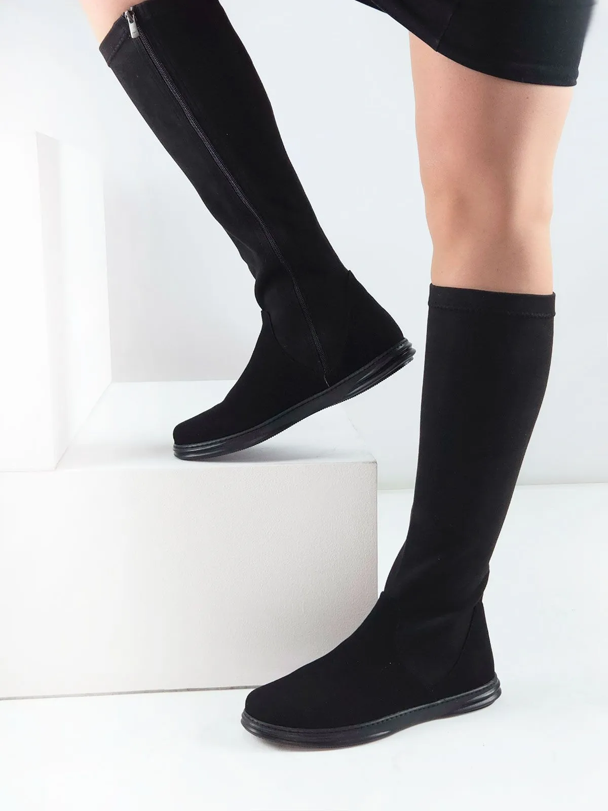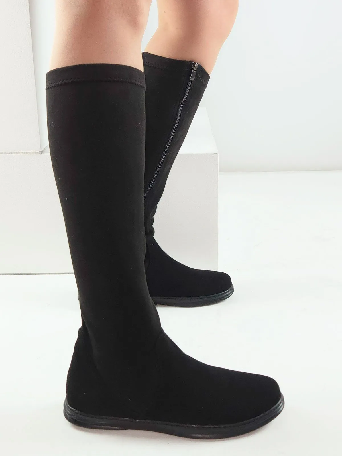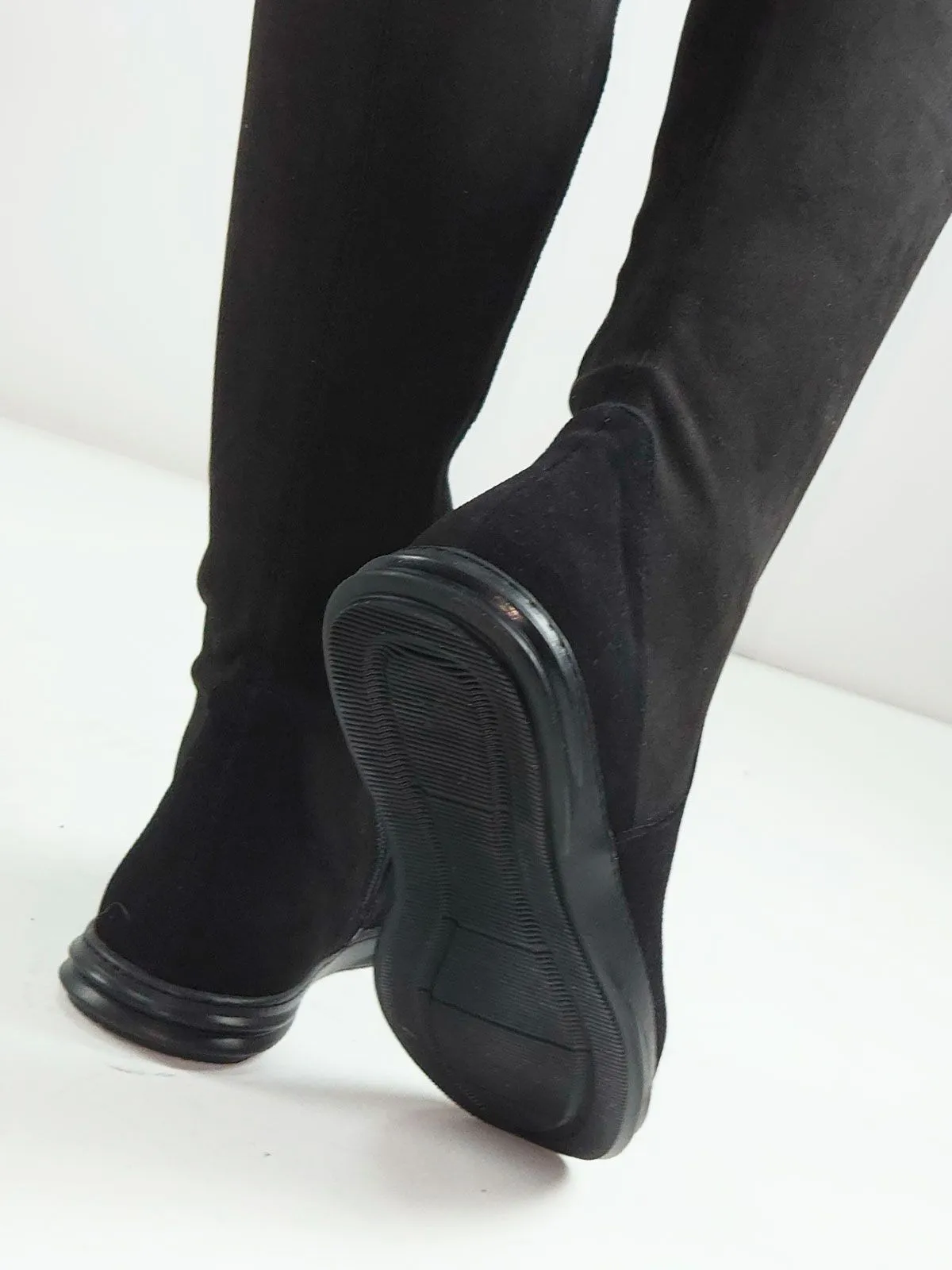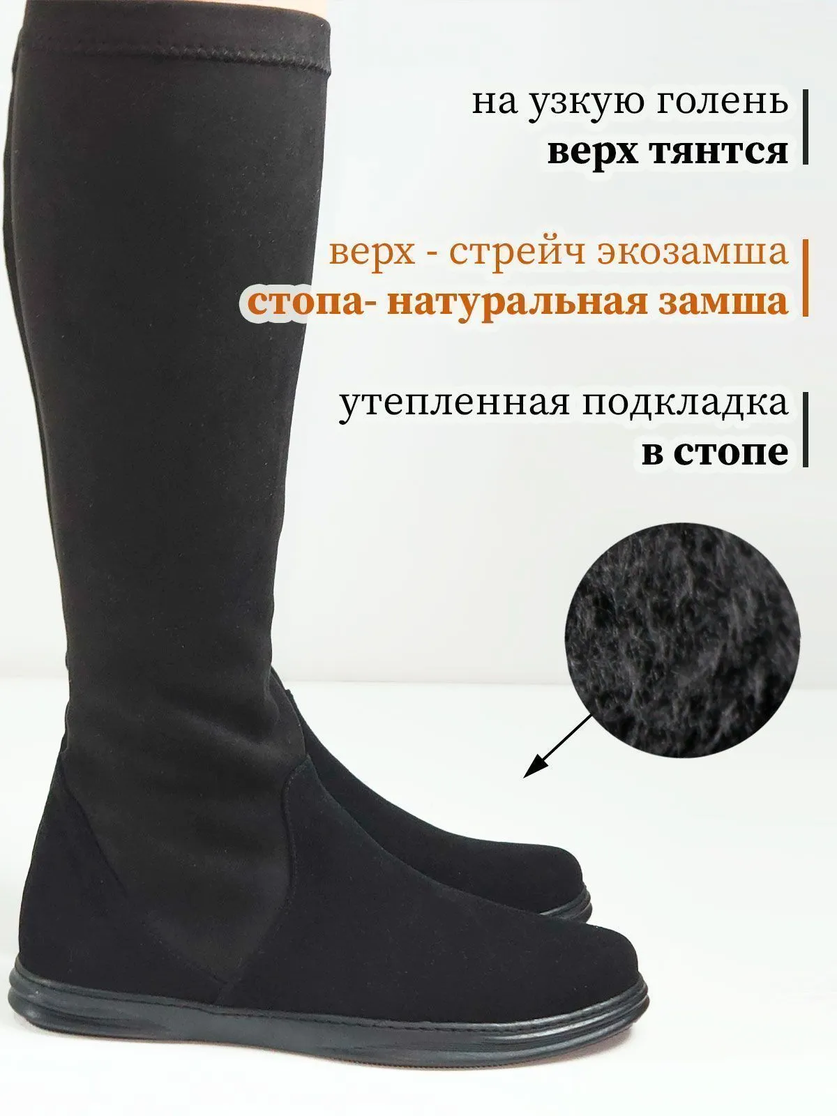 Модель скомбинирована из двух материалов: в области стопы — натуральная замша для надёжности и комфорта, а верх выполнен из эластичной стрейч-экозамши, которая красиво облегает ногу и подчёркивает силуэт.