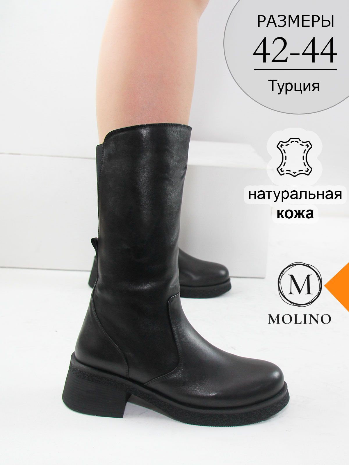 Слегка укороченные по голенищу, практичные и универсальные сапоги Molino выполнены из мягкой натуральной кожи чёрного цвета.