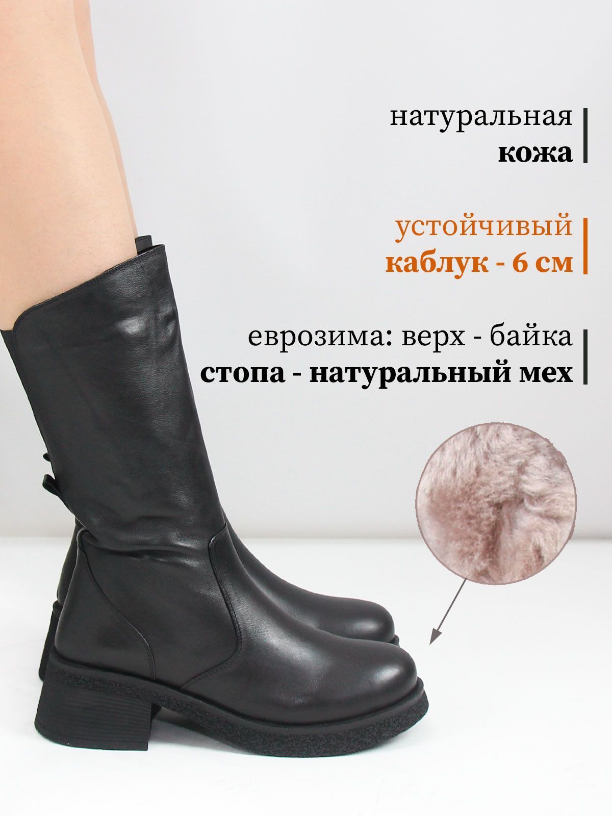 Внутри — утеплённая подкладка: в голенище искусственный мех, в стопе — натуральный мех, что делает модель отличным выбором на зиму и холодную осень.