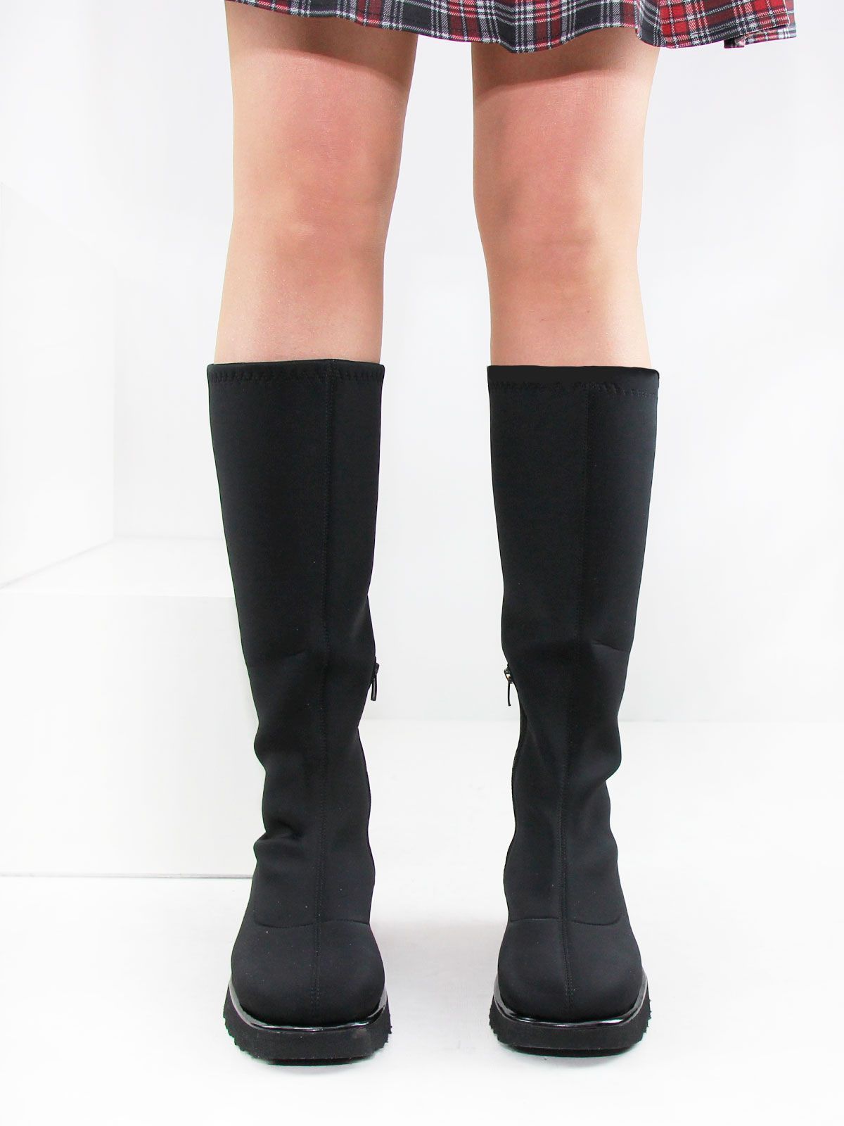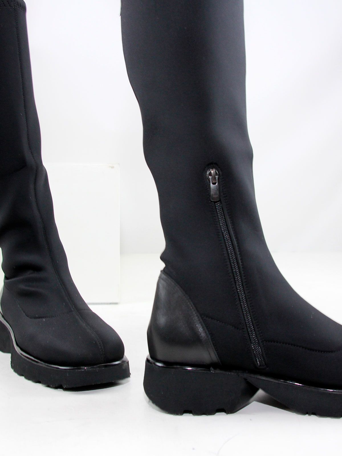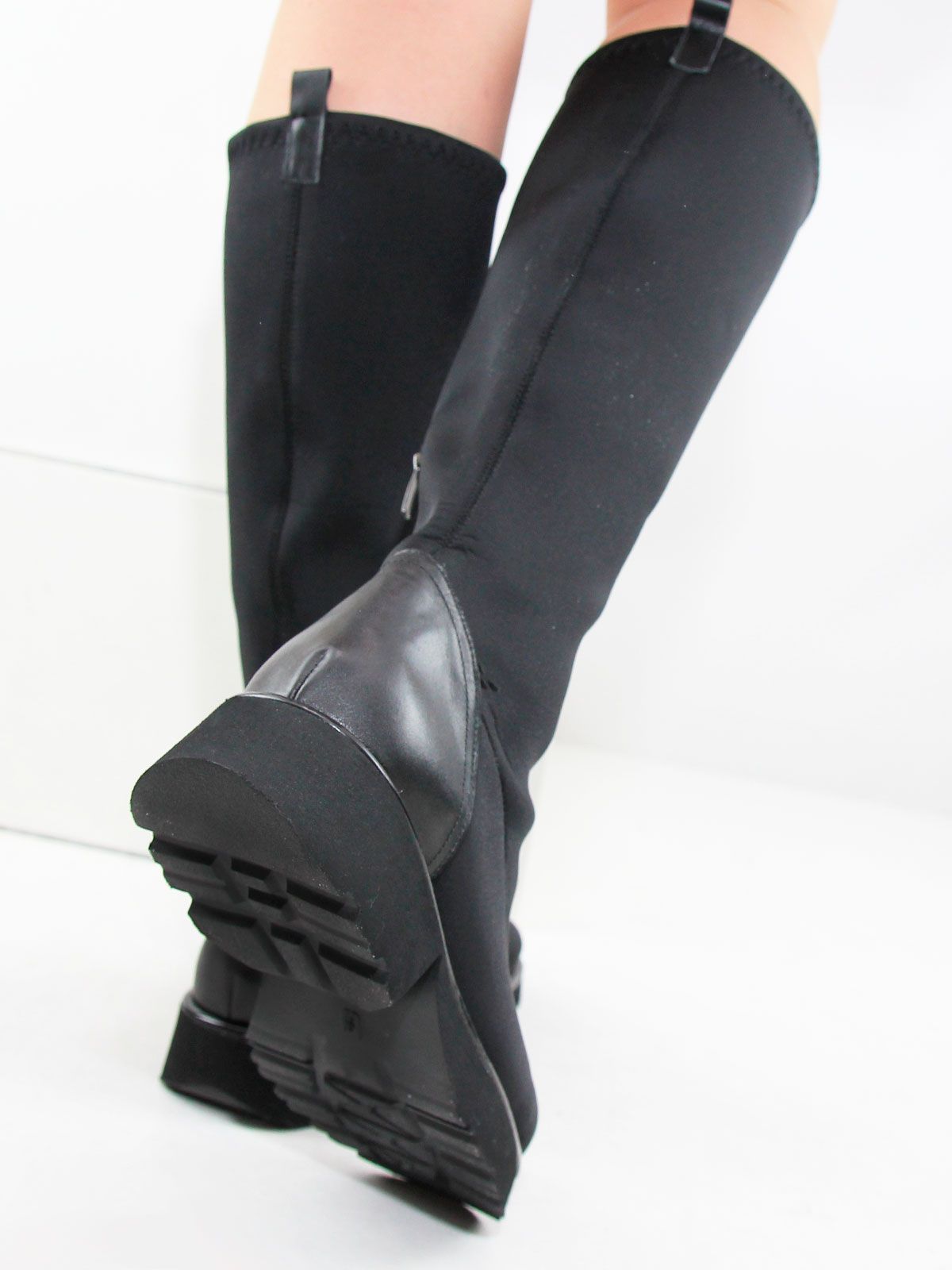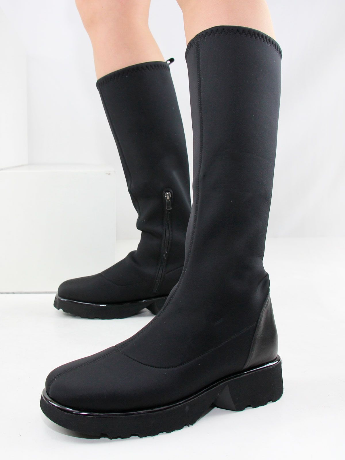 Черные классические демисезонные сапоги большого размера из плотного стрейч-материала. Изящные сапоги на невысоком каблуке подойдут на среднюю стопу. Сбоку молния. Подкладка - натуральная кожа. Материал очень широко тянется в голени.(примерно до 8 см)