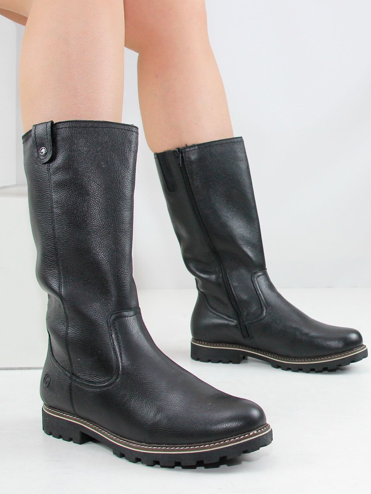 Сапоги большого размера, средней высоты. Женские зимние сапоги выполнены из натуральной кожи, подкладка - плотный шерстяной мех. Рельефная подошва. Сбоку - застежка молния. На модели размер - 42.