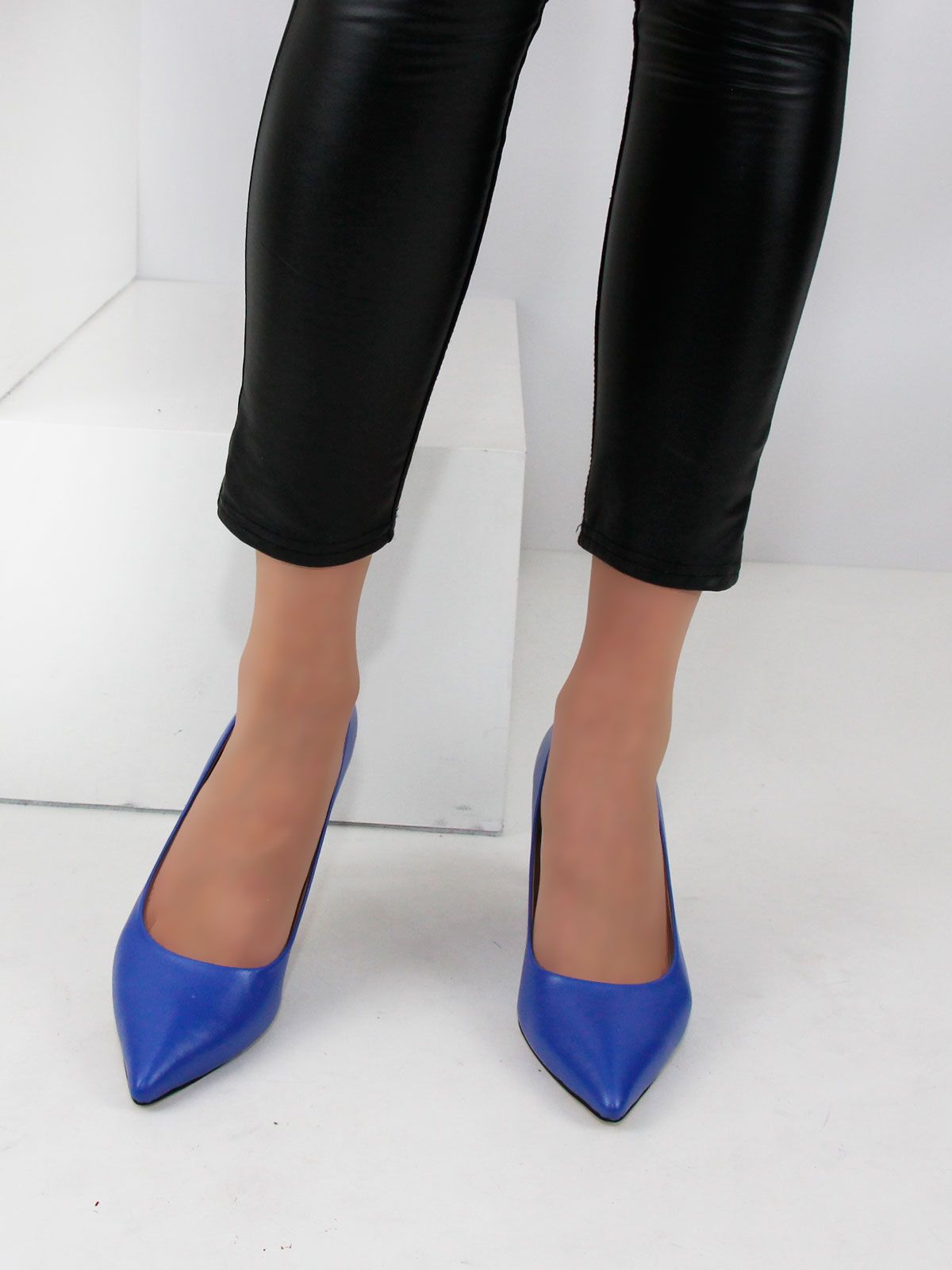 Классические туфли-лодочки большого размера из натуральной кожи синего цвета на каблуке - шпильке .