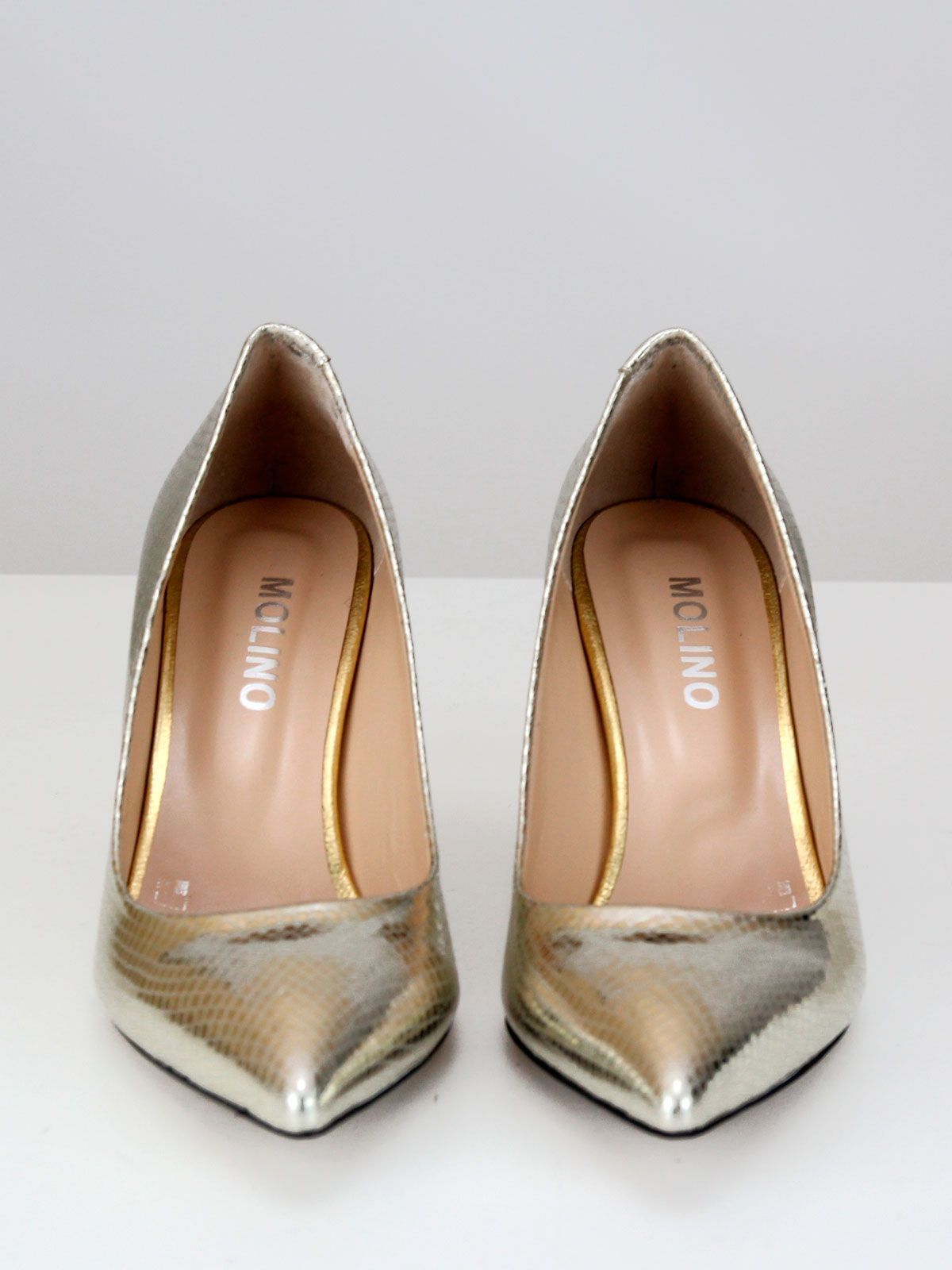 Уценка - небольшая потертость кожи. Женские туфли MOLINO - это стильное и удобное решение для повседневного образа. Модель выполнена в трендовом золотом цвете, что добавит яркости любому наряду. Устойчивый каблук-шпилька высотой 8 см позволит чувствовать себя уверенно и элегантно, а натуральная кожаная подкладка обеспечит комфорт в носке.