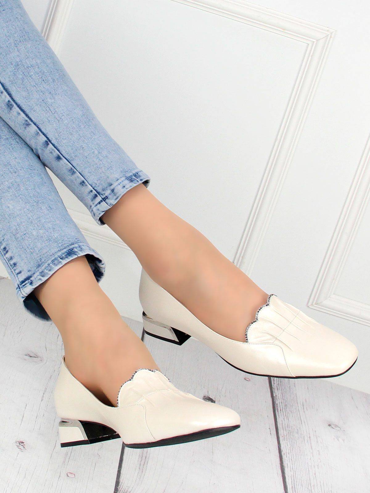 Женские туфли большого размера из натуральной кожи. Классический бежевый цвет, удобный каблук. Сверху - окантовка стразами. Подойдут на стандартную стопу.