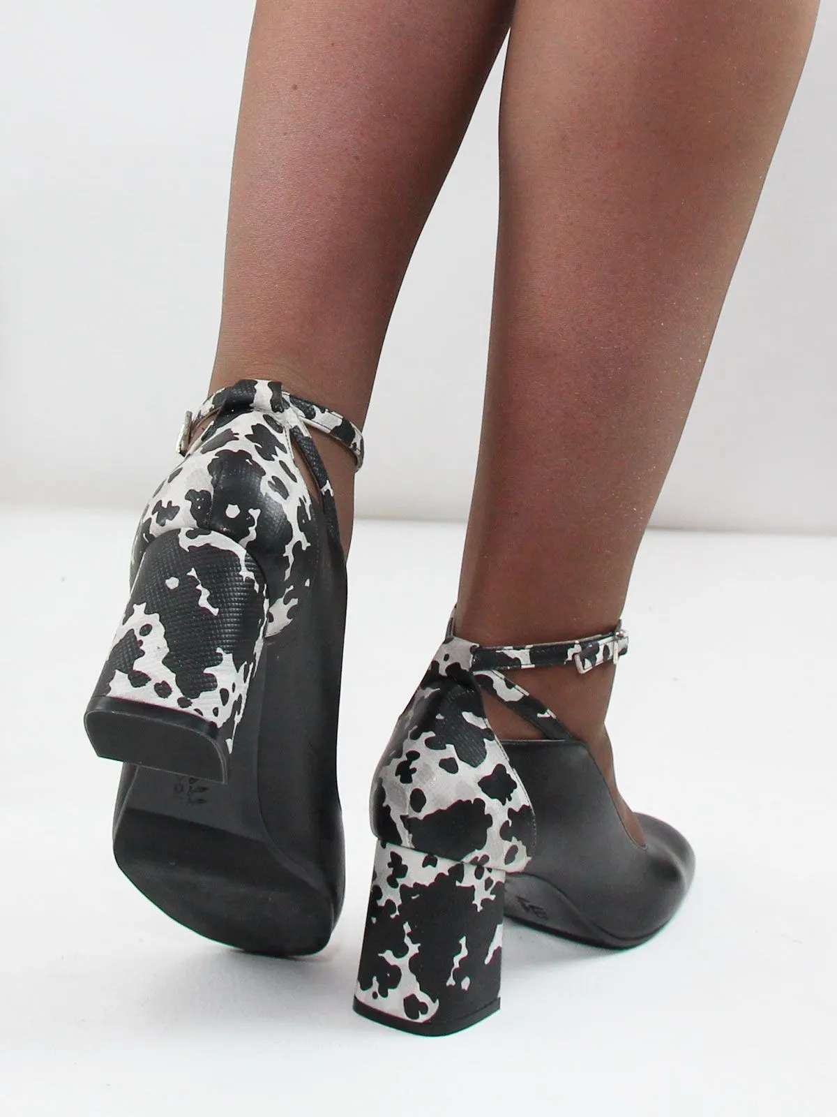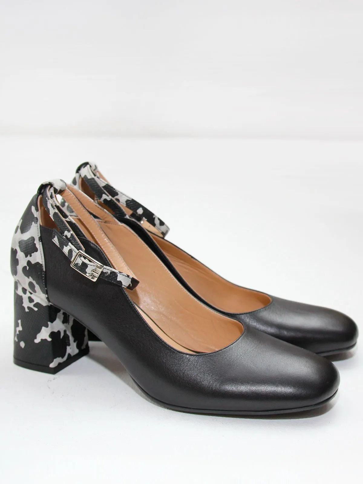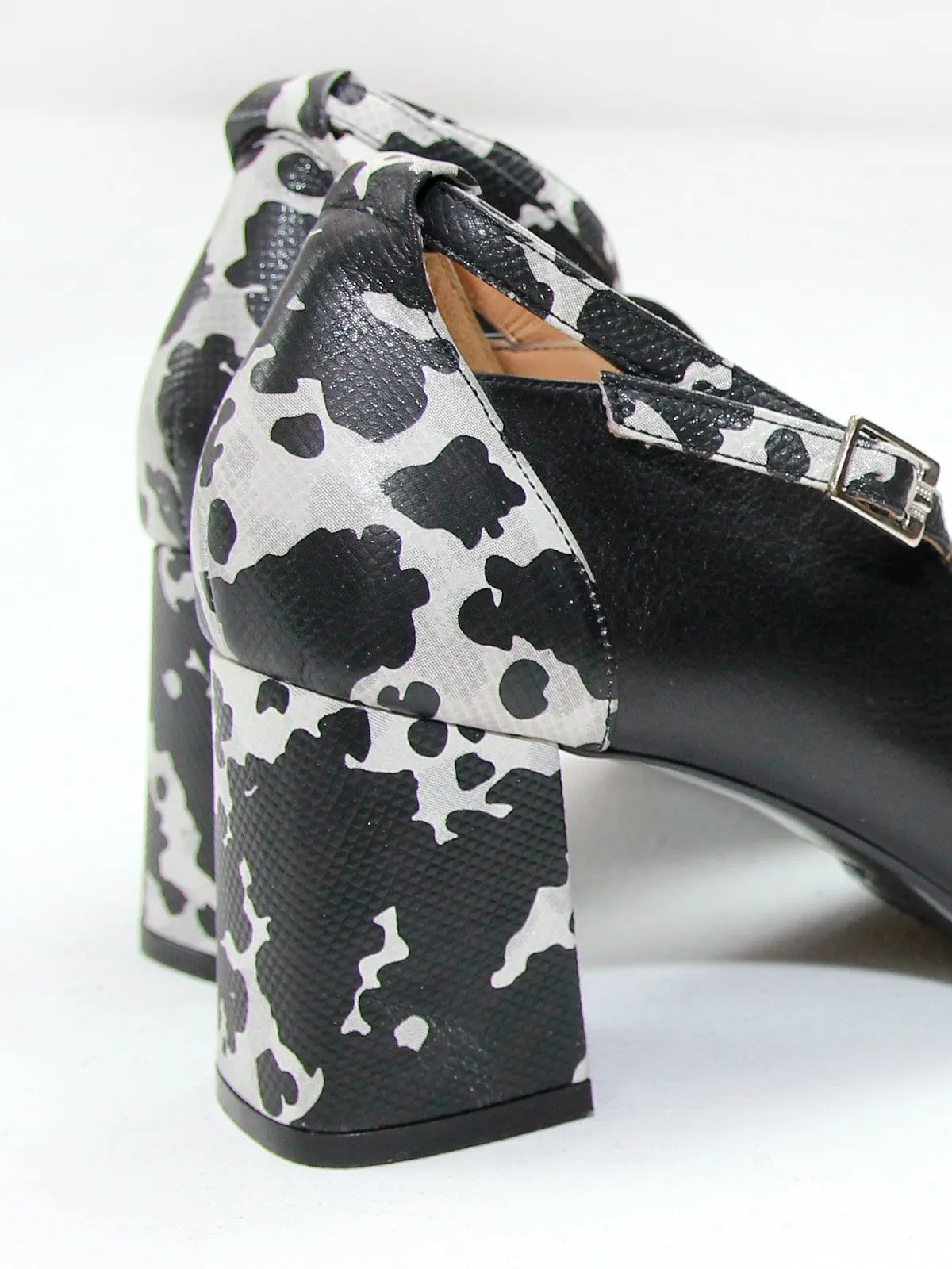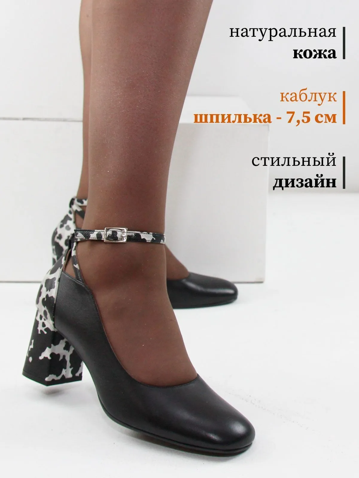 Классические туфли большого размера на высоком каблуке - 7,5 см. Туфли изготовлены из натуральной кожи черного цвета с акцентом на каблук, пяточная часть и ремешок, выполненные в коровьем принте. Подкладка - натуральная кожа. Подойдут на стандартную стопу. Модель полноразмерная. Полнота регулируется застежкой-пряжкой.