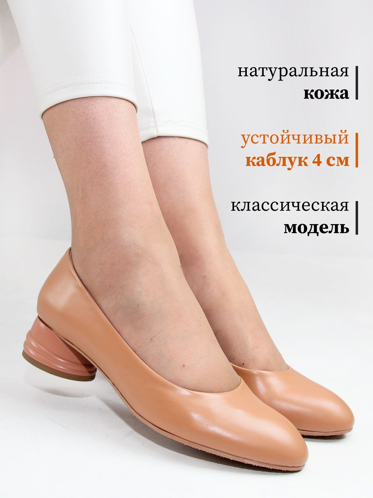 Стильные туфли большого размера из натуральной матовой кожи на невысоком устойчивом каблуке. Бежевые туфли - лодочки средней полноты с округлым мысом подойдут на стандартную стопу. Подкладка - натуральная кожа. Каблук - черного цвета. Производство - Турция.