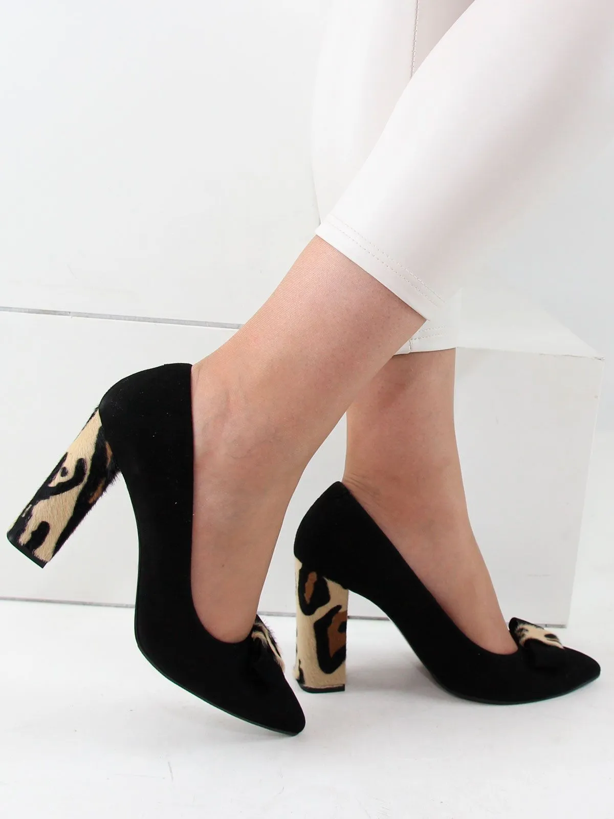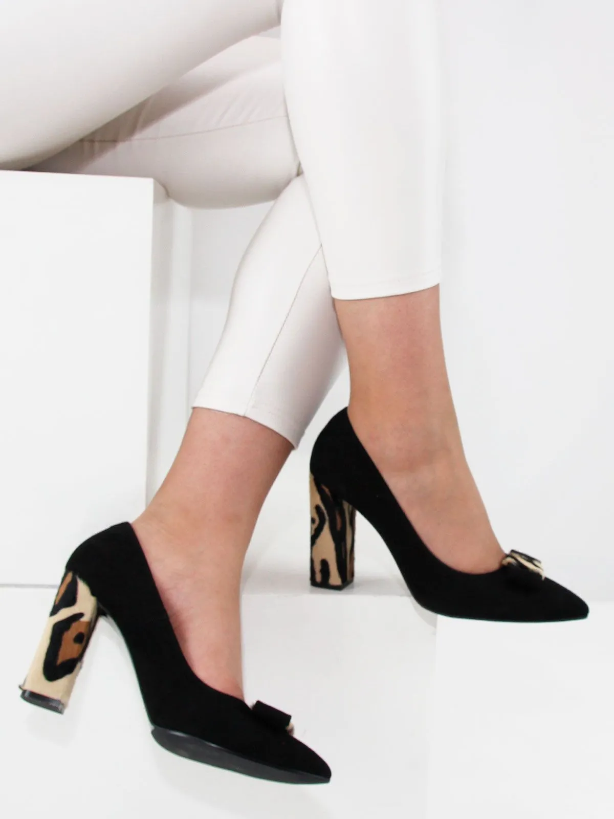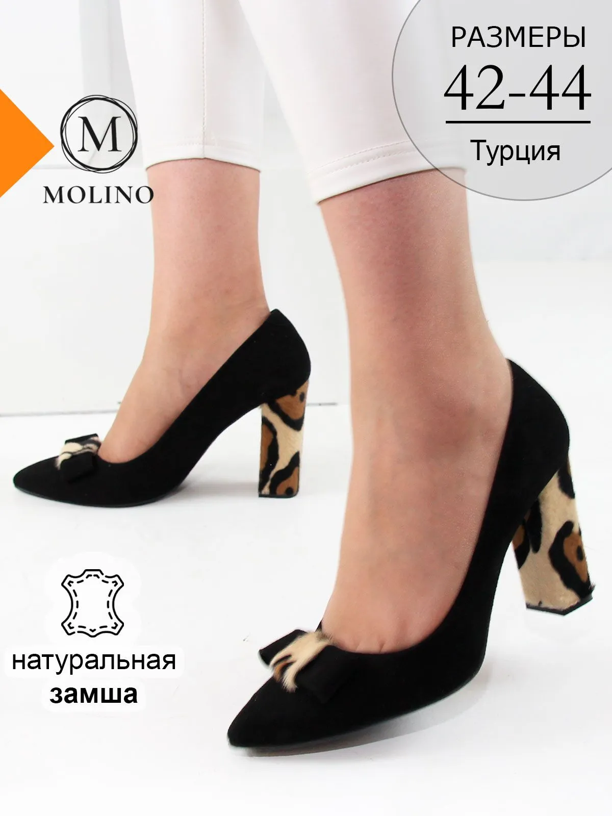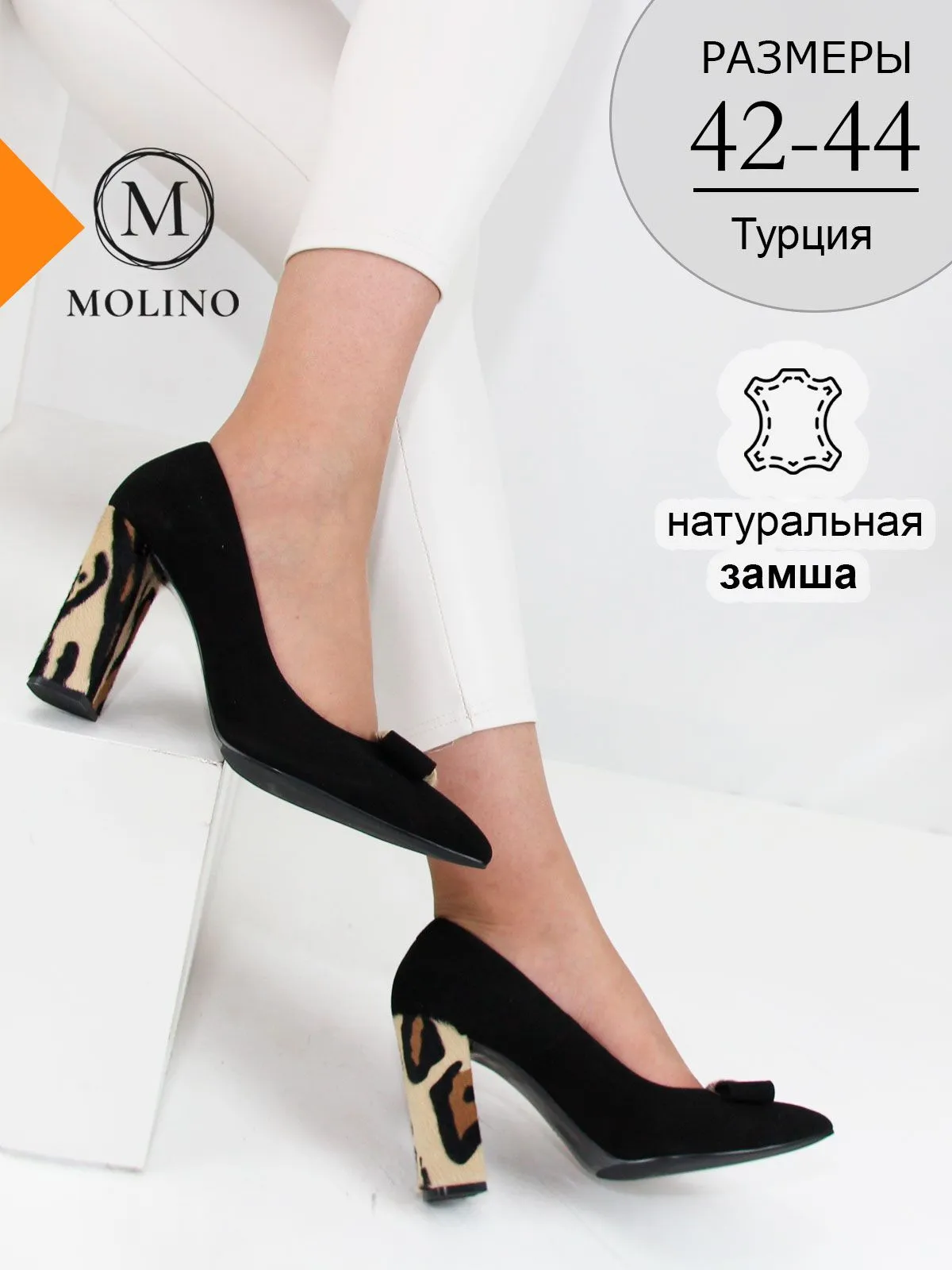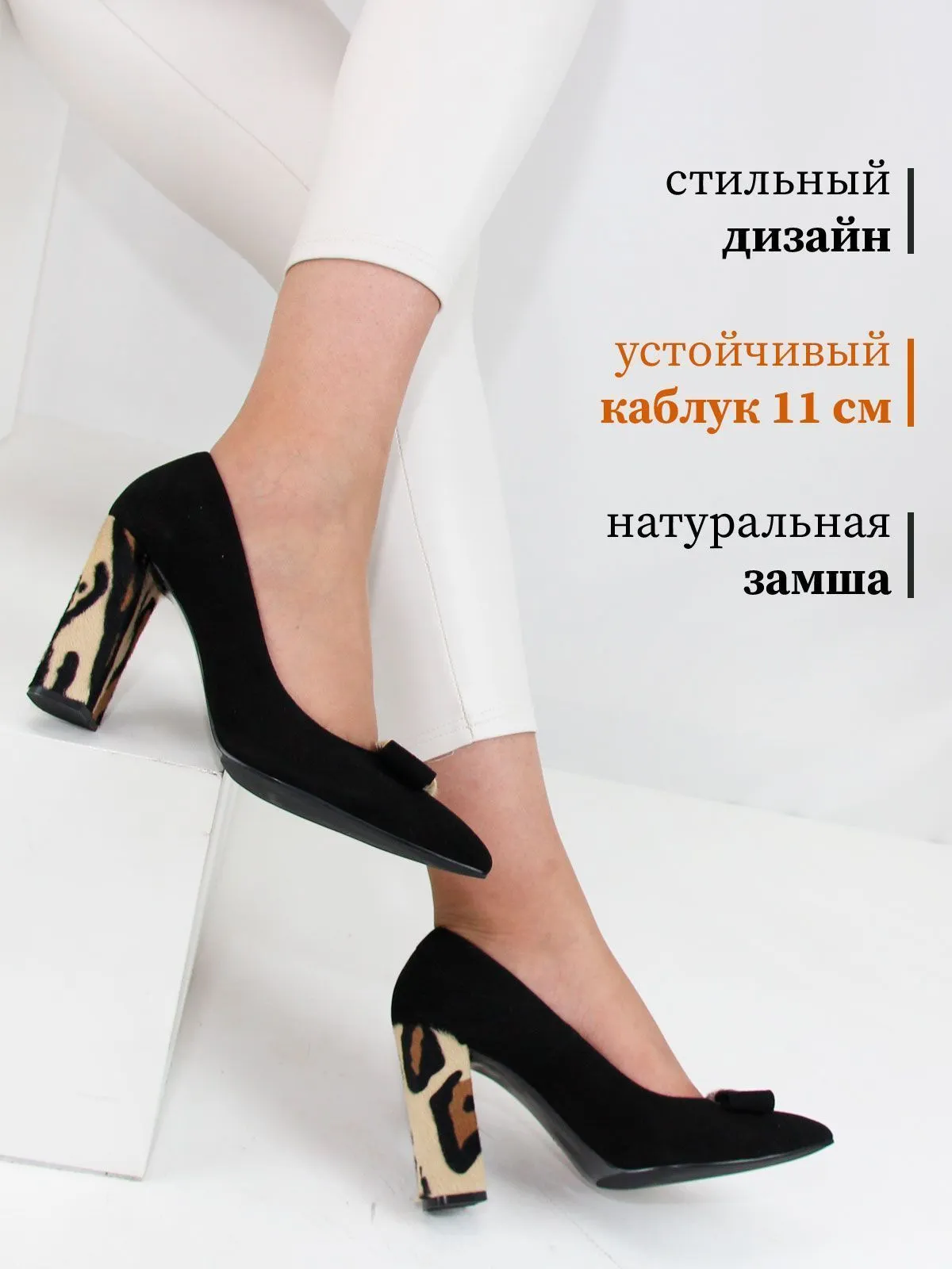 Стильные туфли-лодочки больших размеров из черной натуральной замши на необычном высоком каблуке леопардового цвета. Подкладка - натуральная кожа. Производство Турция.
