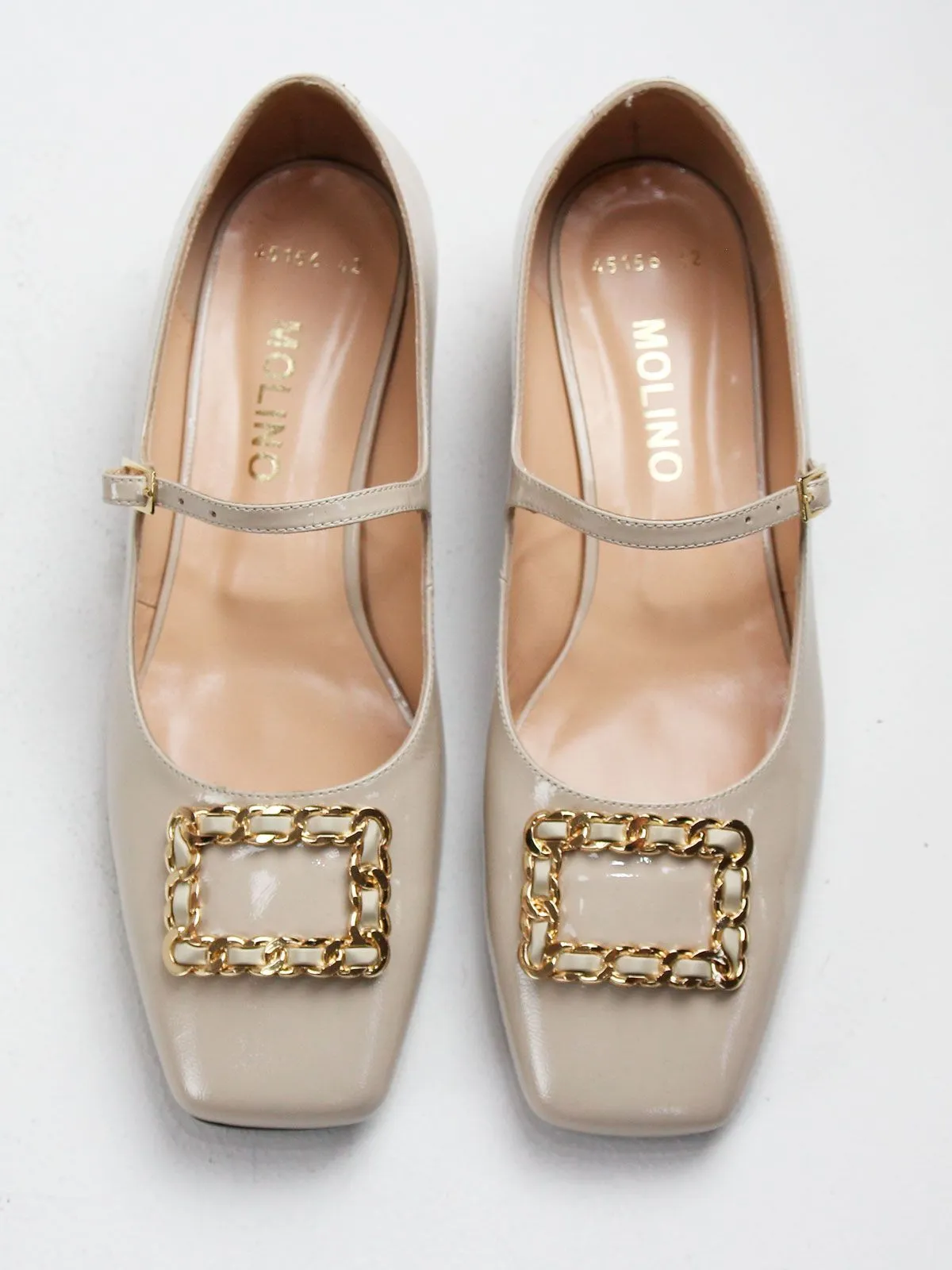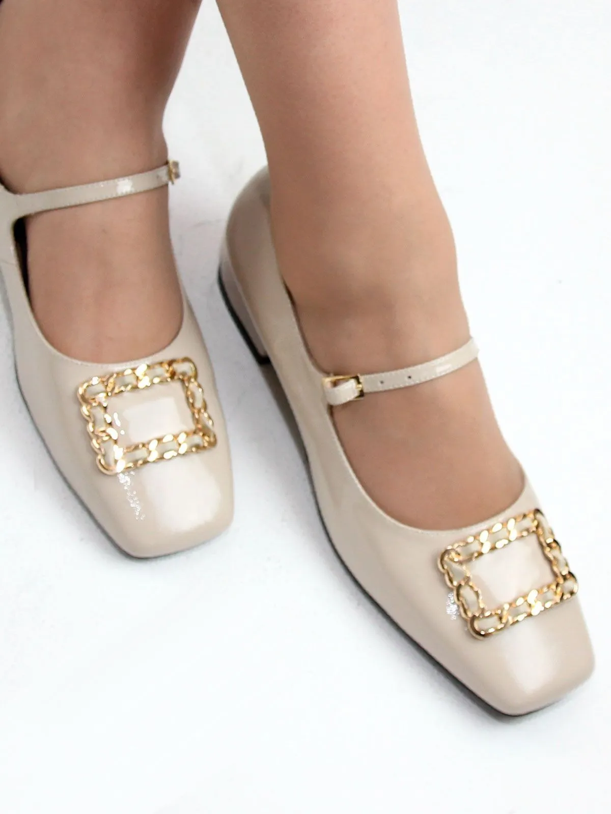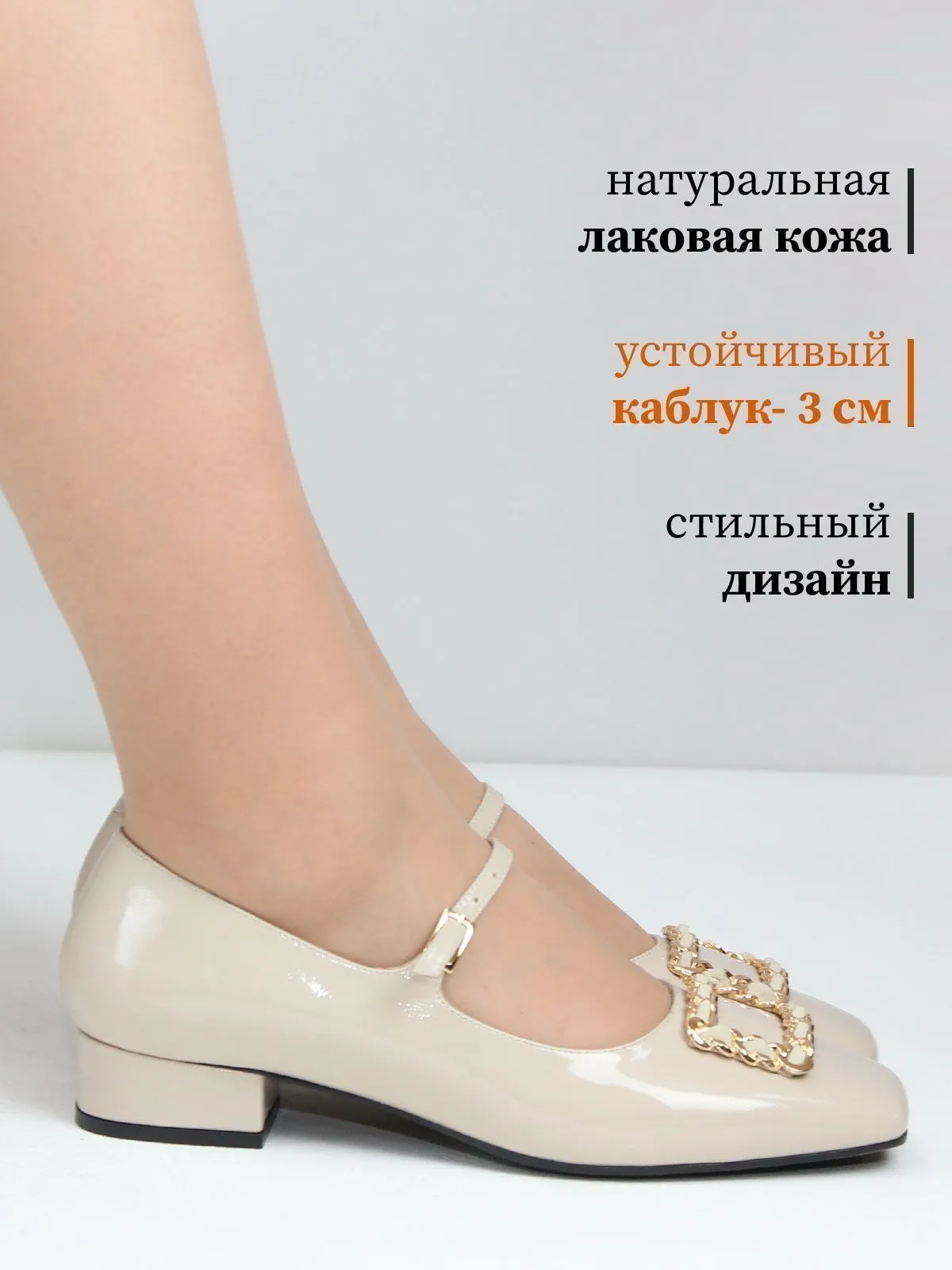 Женские туфли Мери Джейн из натуральной лакированной кожи в изысканном бежевом оттенке — идеальный выбор для тёплого сезона. Лёгкий блеск лака и утончённая пряжка на носке придают модели элегантность, а удобный низкий каблук делает её комфортной для повседневной носки. Широкий носок придаёт обуви особую выразительность и делает её особенно удобной для повседневной носки. Устойчивый низкий каблук дополняет образ и дарит уверенность в каждом шаге