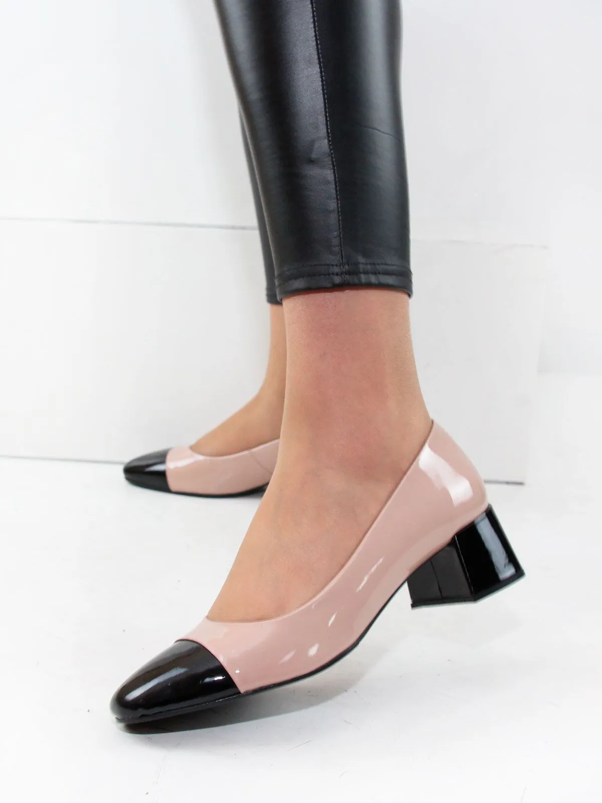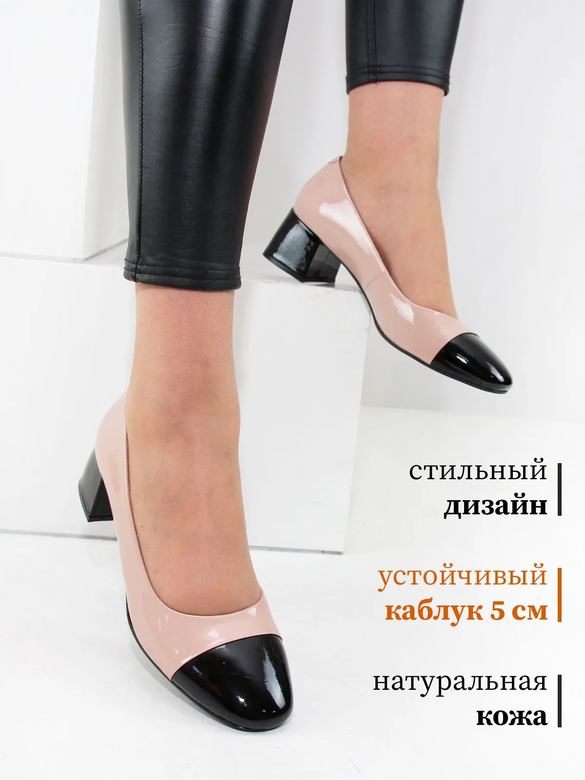 Идеальные классические женские туфли-лодочки больших размеров на невысоком устойчивом каблуке. Туфли выполнены из лаковой натуральной кожи нежно-бежевого и черного цвета без дополнительных декоративных элементов. Производство Турция, не маломерят.Маленькое пятно на левой туфле с внутренней стороны.