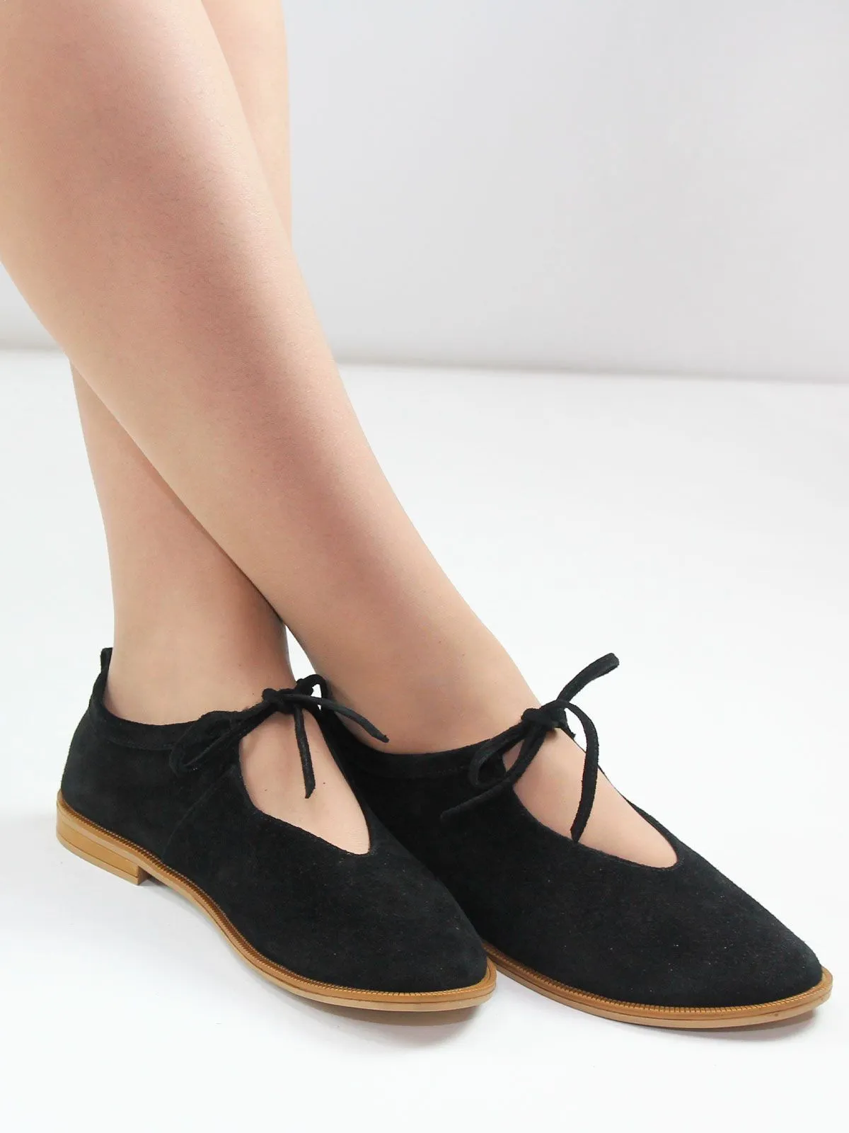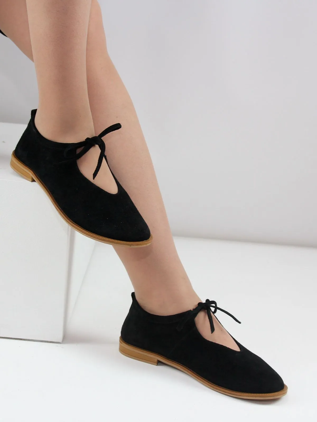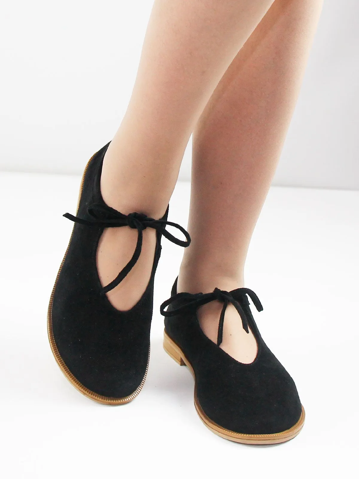 Модель выполнена из натуральной замши и имеет аккуратный силуэт с изящным вырезом и декоративными завязками, которые придают обуви лёгкость и оригинальность. Такой дизайн делает модель выразительной и при этом очень удобной для повседневной носки.
