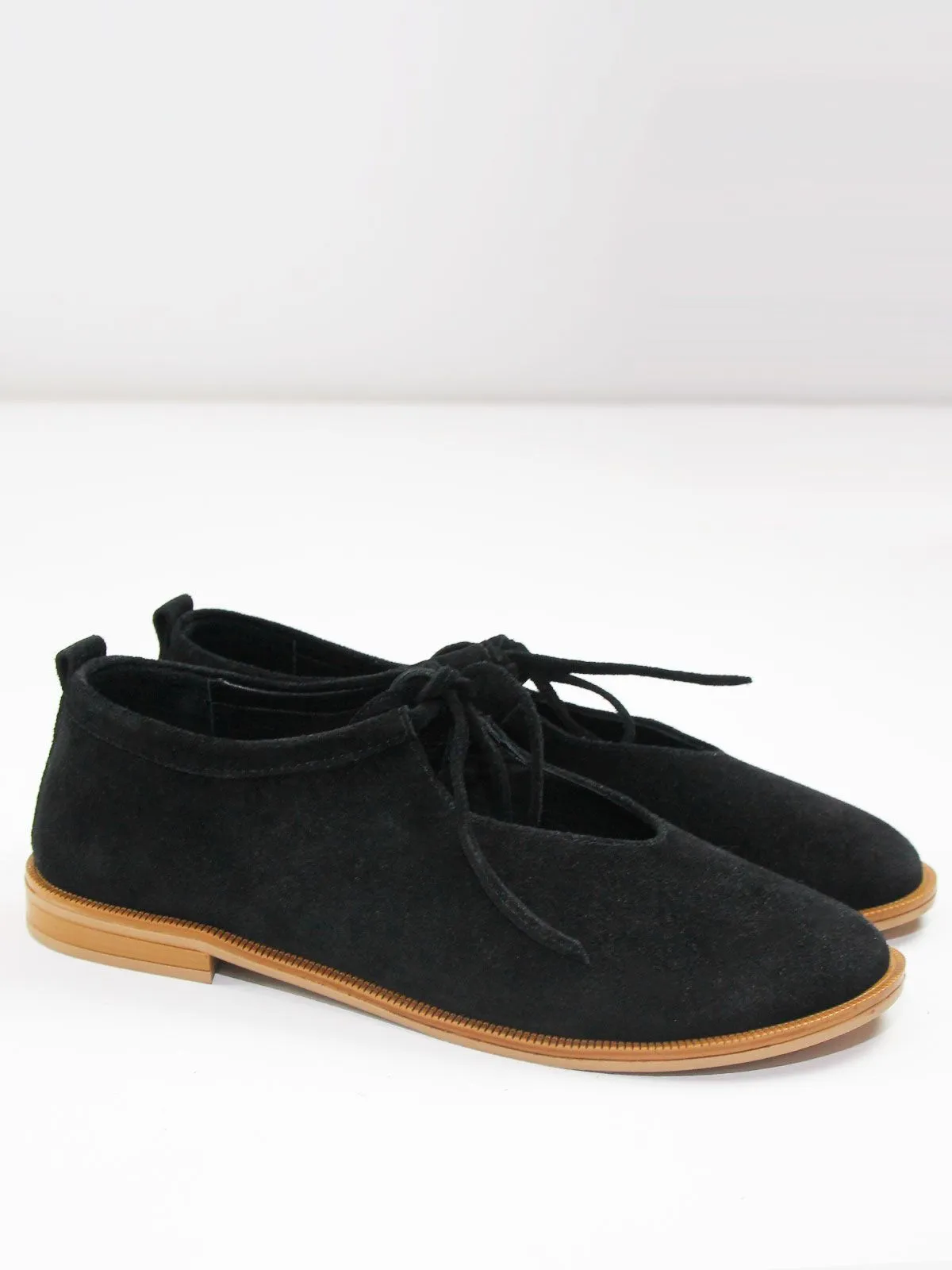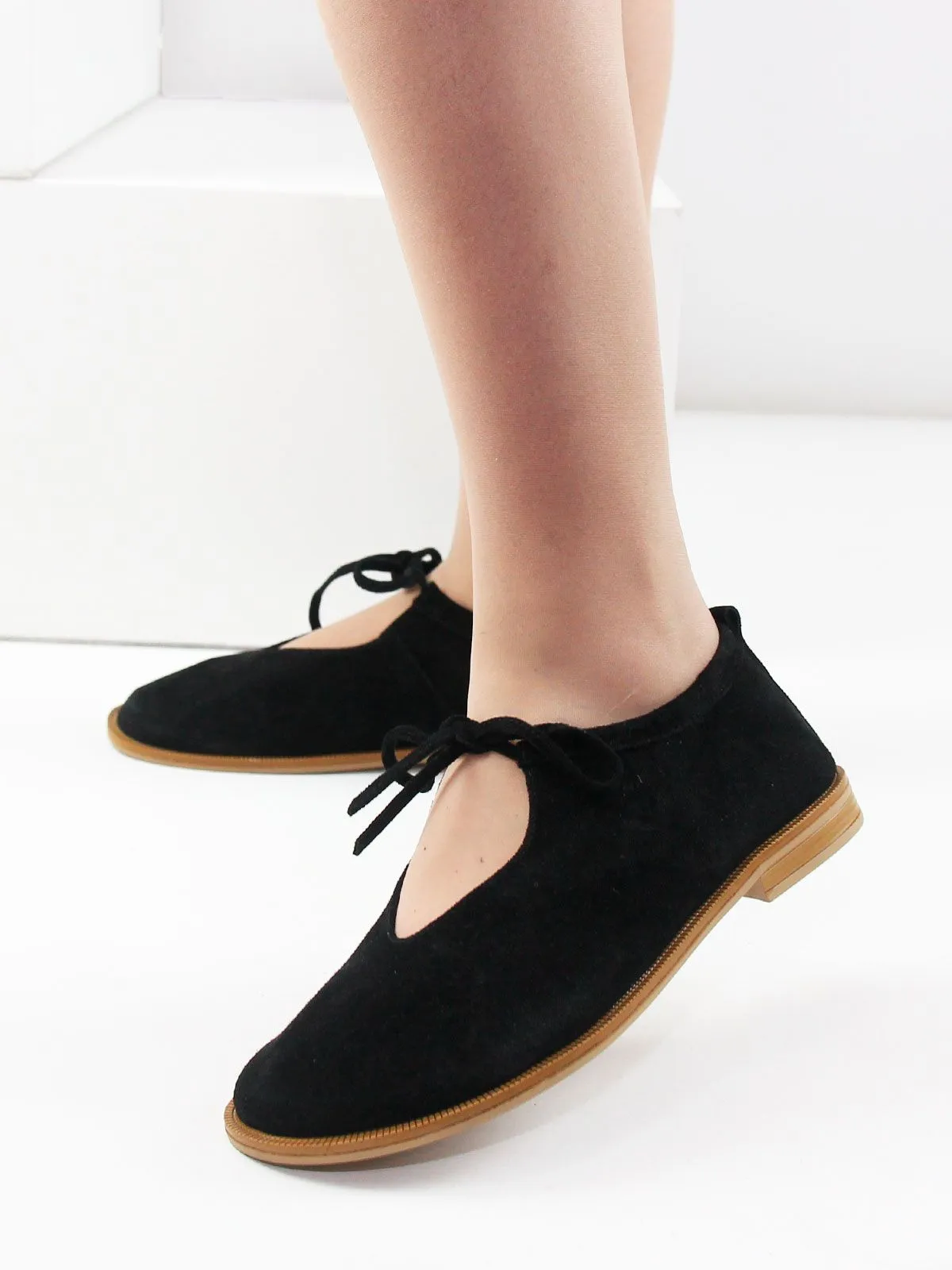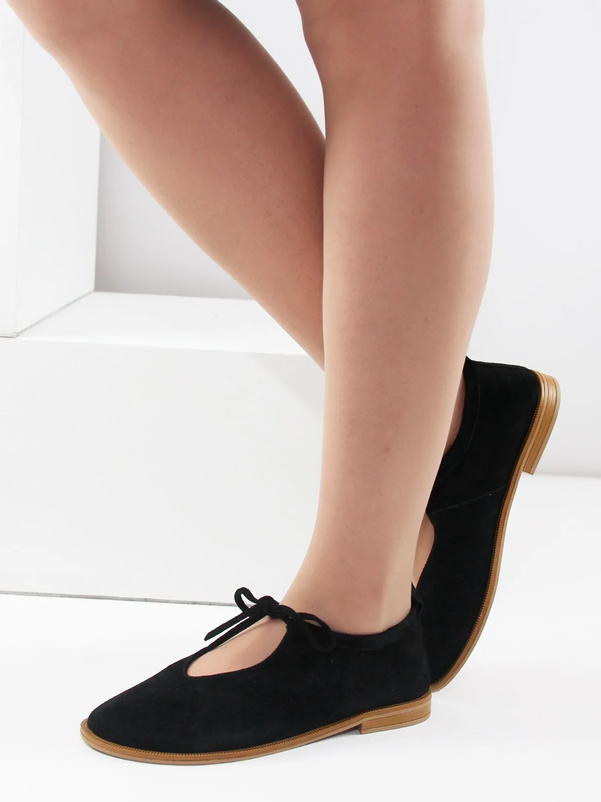 Модель выполнена из натуральной замши и имеет аккуратный силуэт с изящным вырезом и декоративными завязками, которые придают обуви лёгкость и оригинальность. Такой дизайн делает модель выразительной и при этом очень удобной для повседневной носки.
