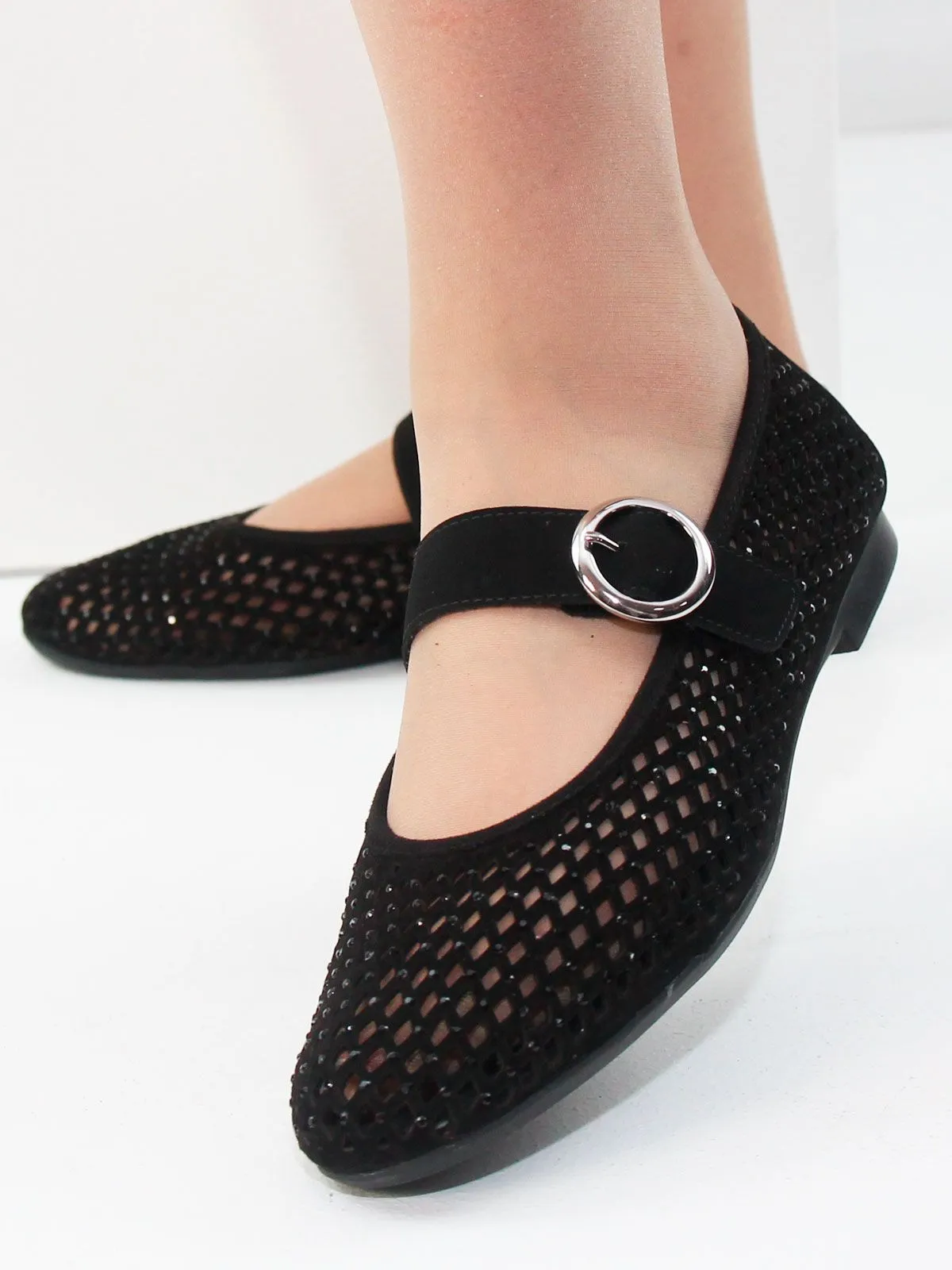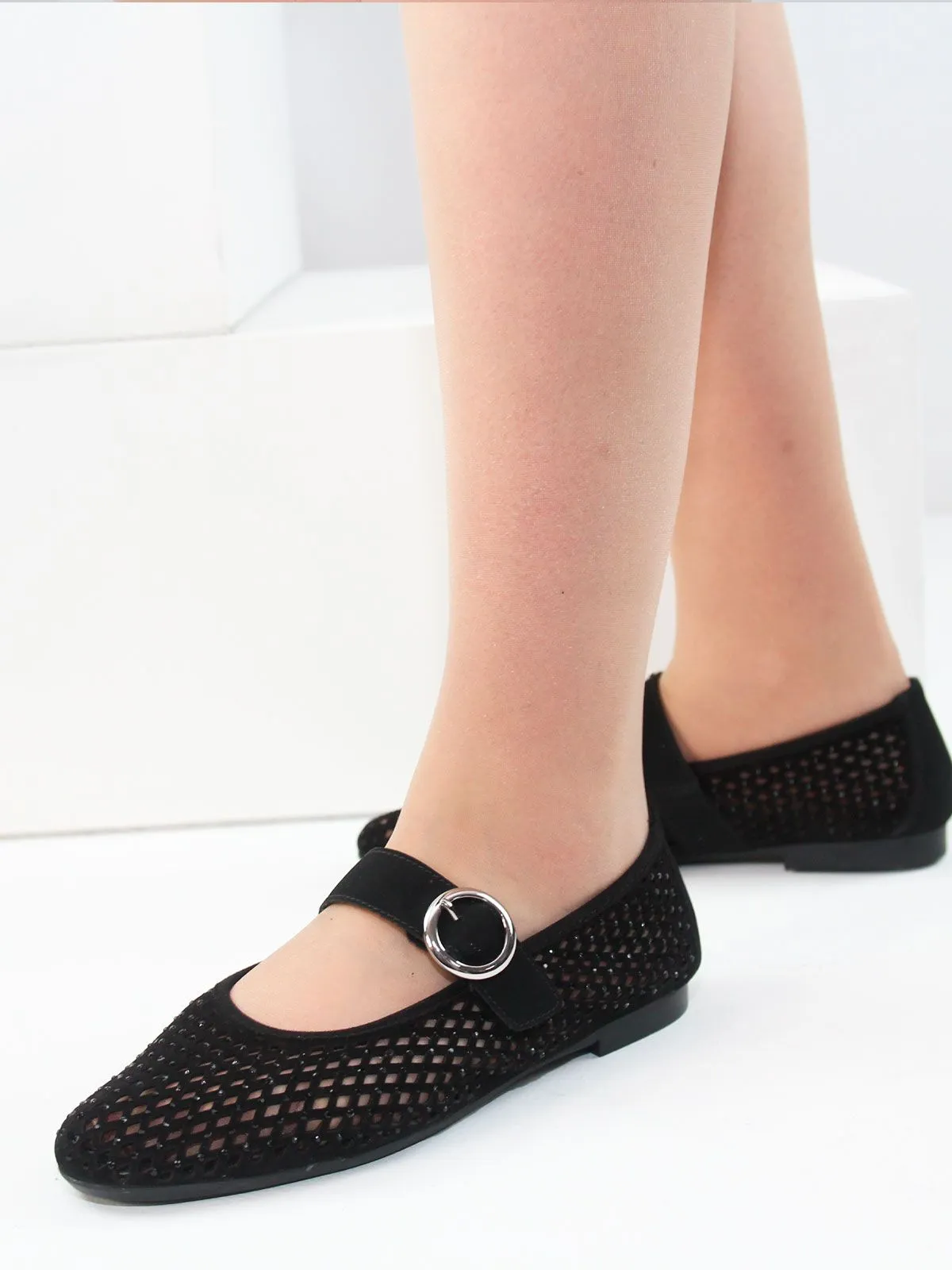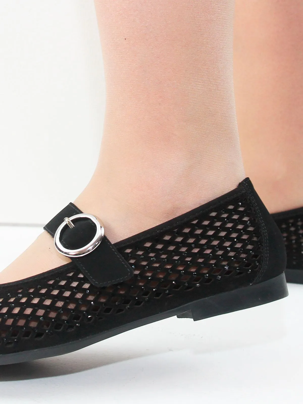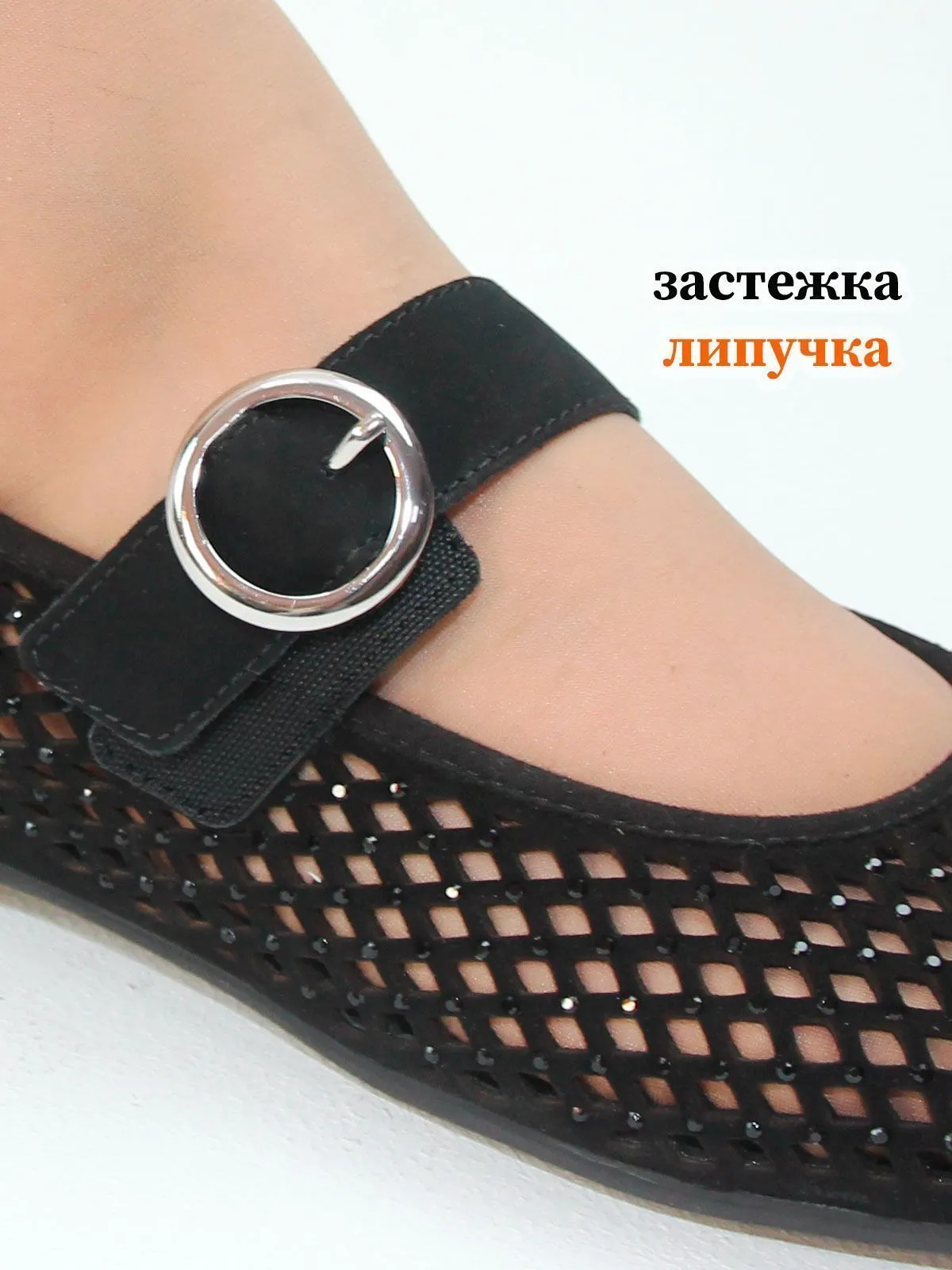 Модель выполнена из лёгкого сетчатого материала, который обеспечивает хорошую вентиляцию и комфорт при носке. Поверхность дополнена небольшими стразами, которые выглядят деликатно и не бросаются в глаза, создавая аккуратный и гармоничный блеск.