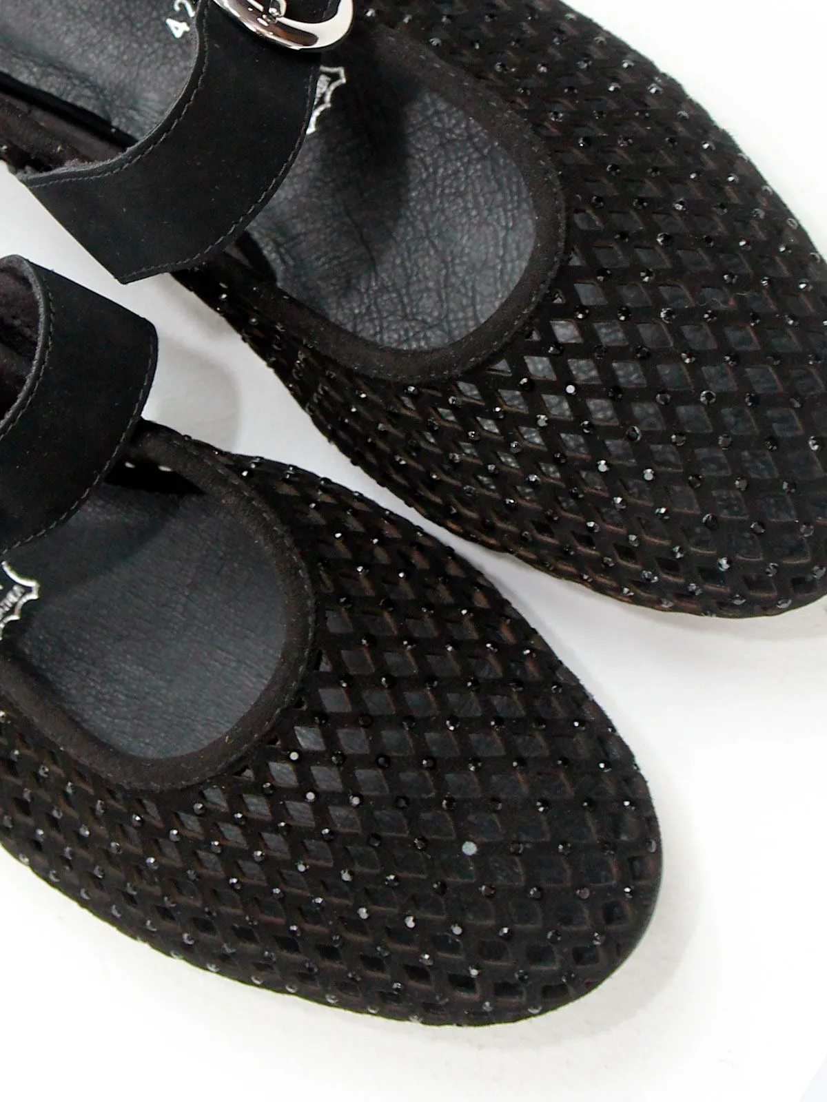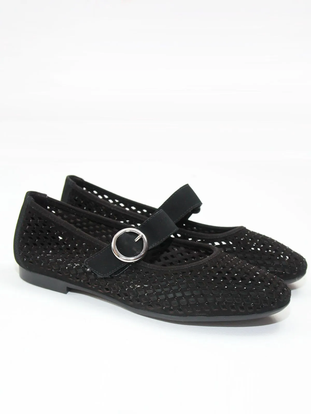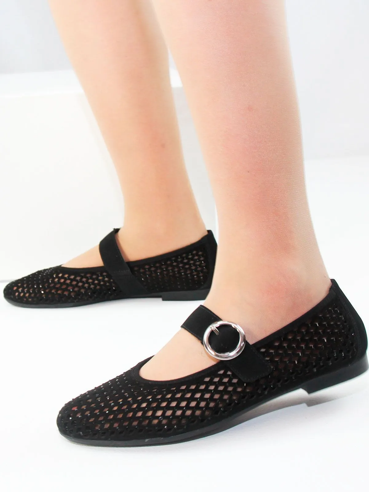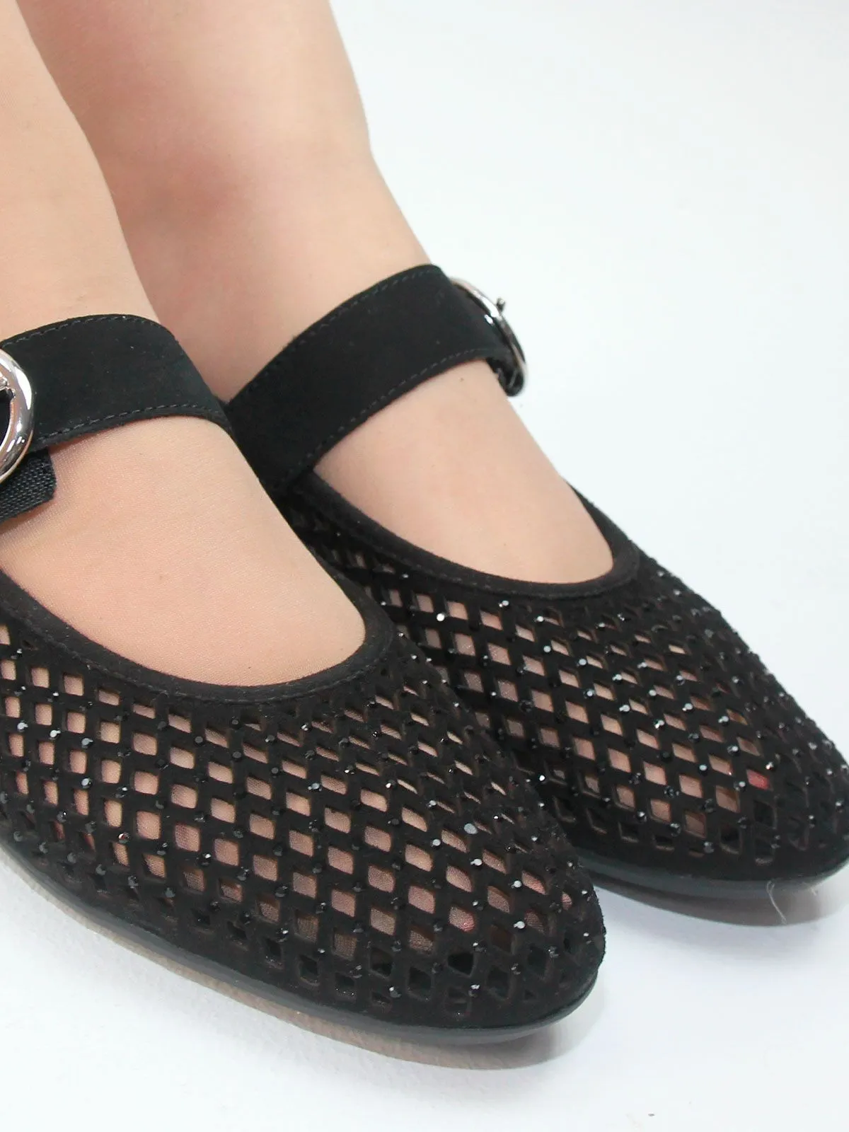 Модель выполнена из лёгкого сетчатого материала, который обеспечивает хорошую вентиляцию и комфорт при носке. Поверхность дополнена небольшими стразами, которые выглядят деликатно и не бросаются в глаза, создавая аккуратный и гармоничный блеск.